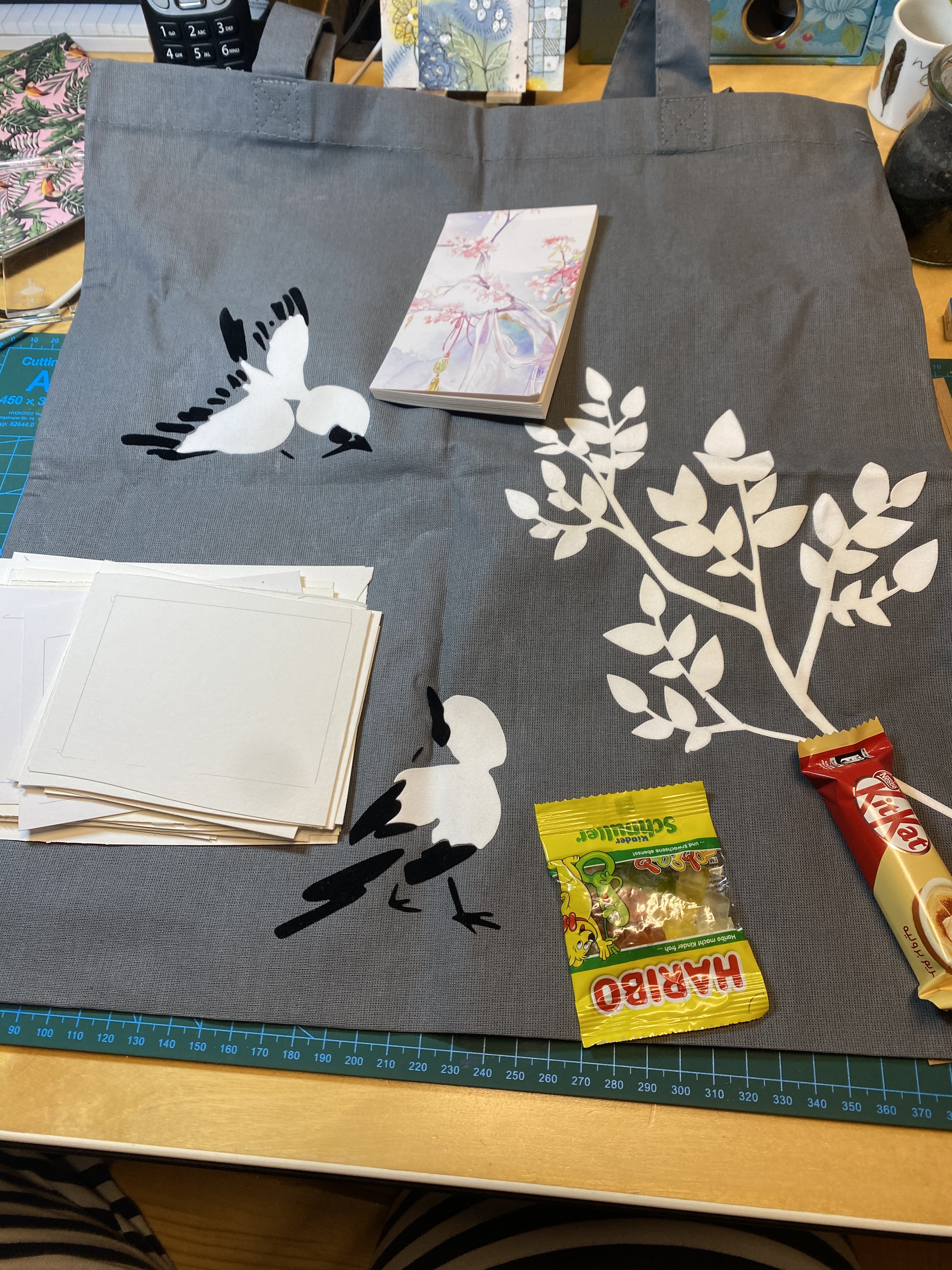 An dem Tag hatte ich zwei Päckchen. Irgendwas ist da schief gegangen. Jedenfalls vielen lieben Dank für die ganzen Papierproben, den kleinen Block, den Süßkram und die Tasche. Ich mag Vögel total gerne und habe mich deshalb sehr über das Motiv gefreut!