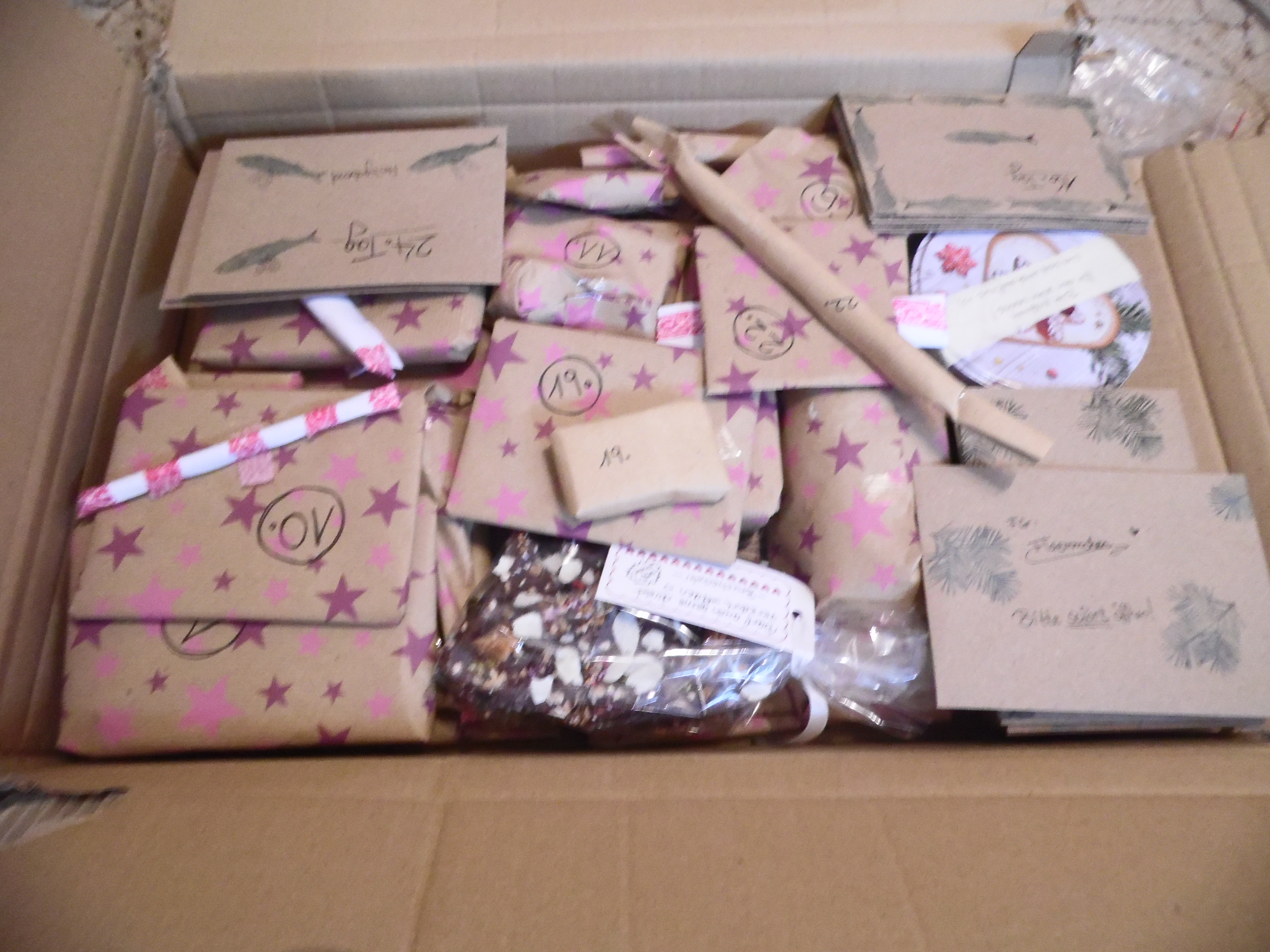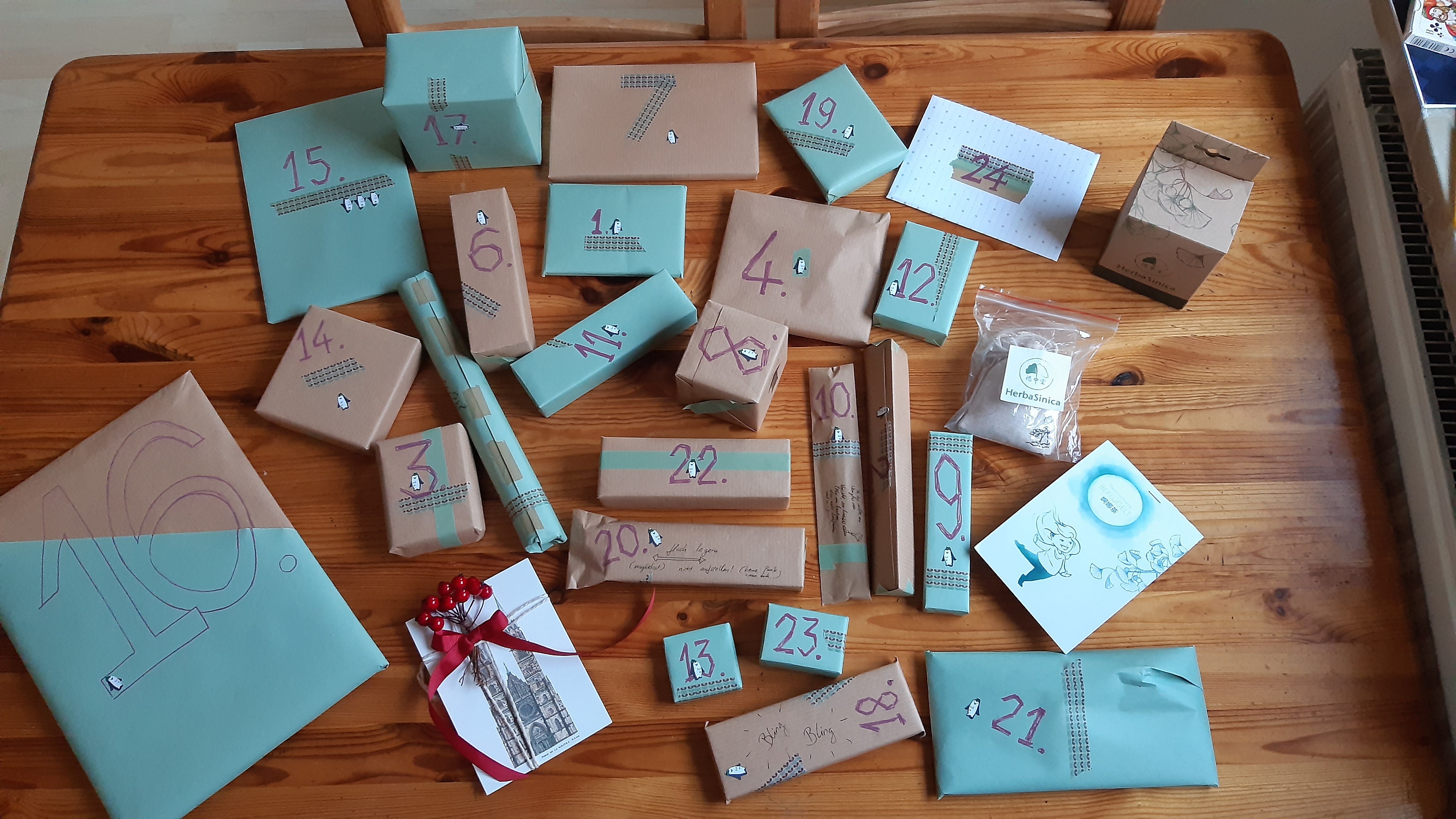 Ich bin schon so gespannt^^ Auf ein paar Päckchen stehen kleine Anmerkungen und sie machen mich neugierig xD Zwei Päckchen klimpern, wenn man sie hochhebt :D