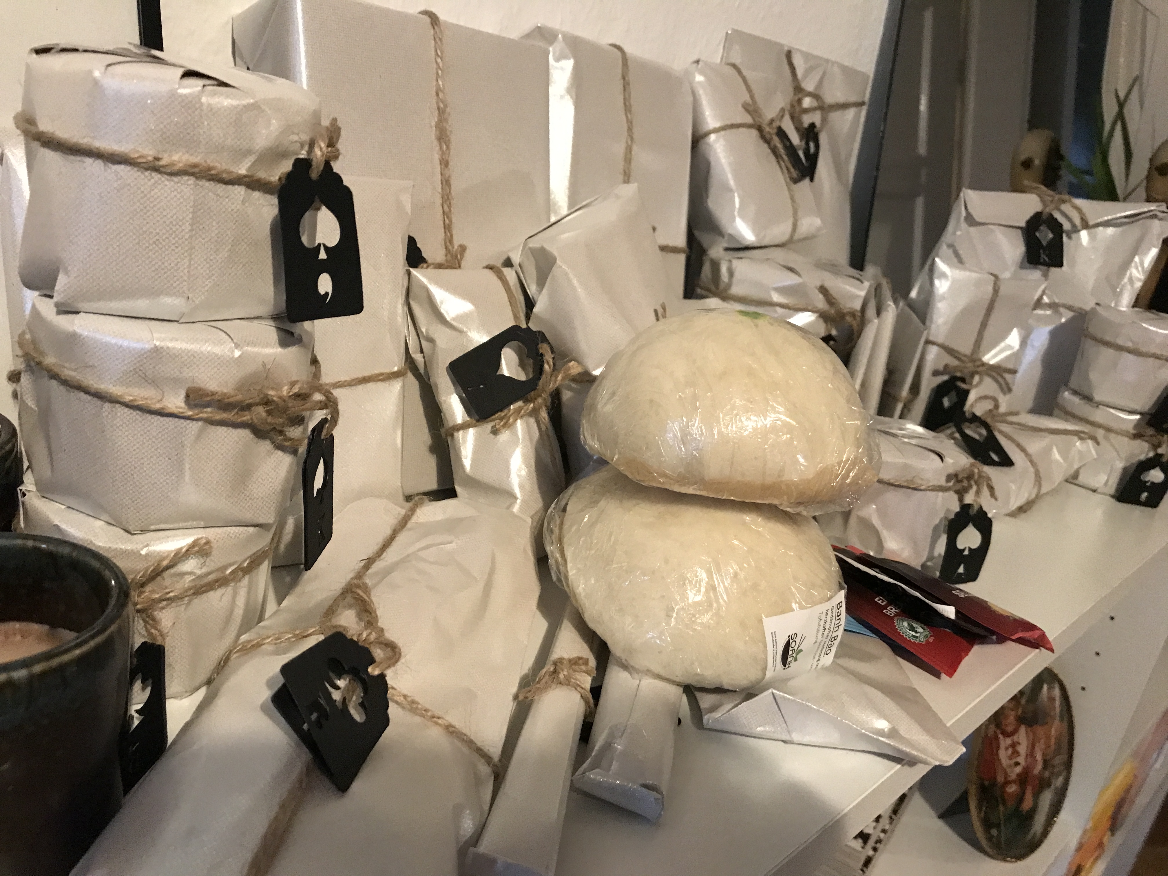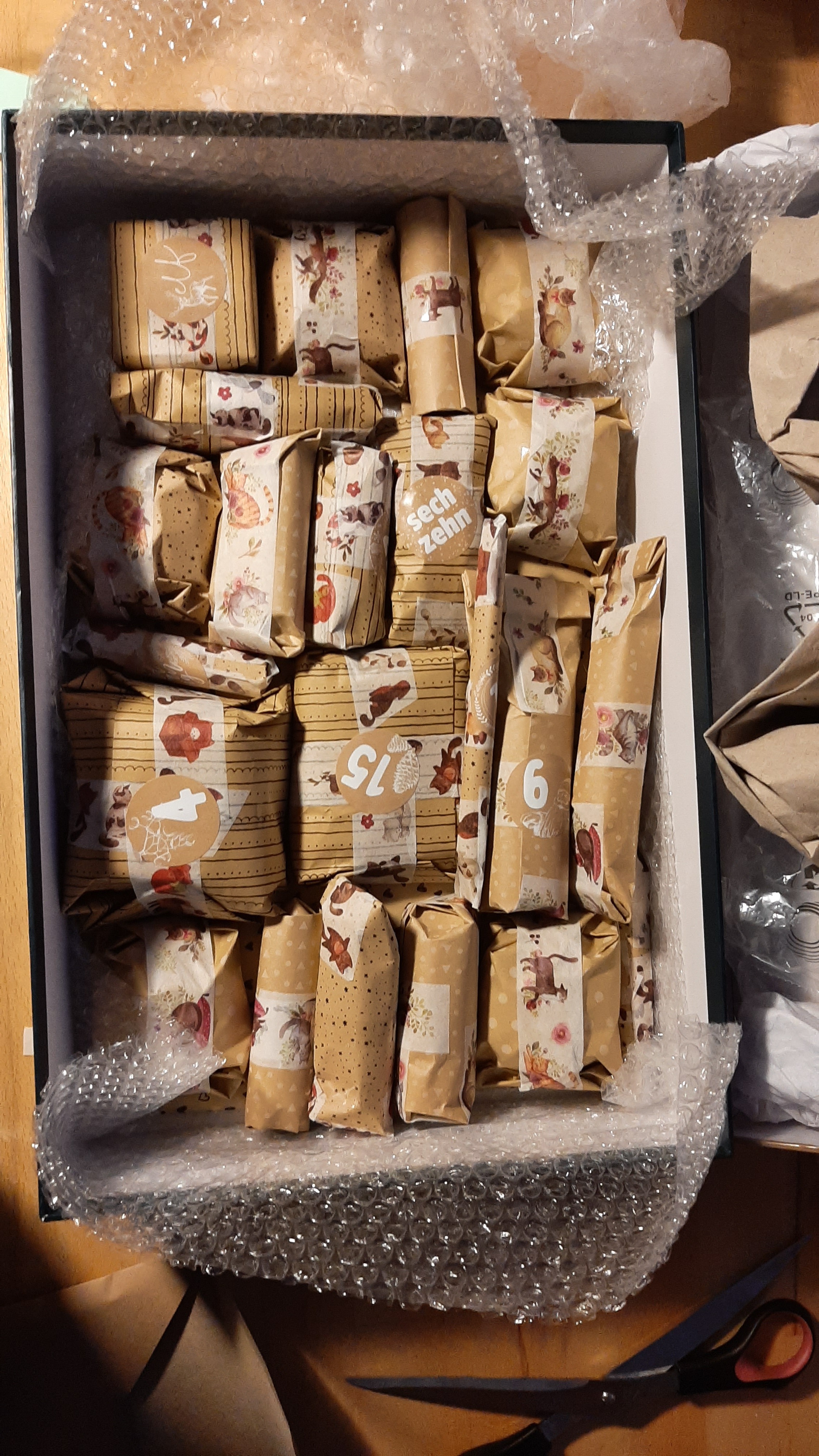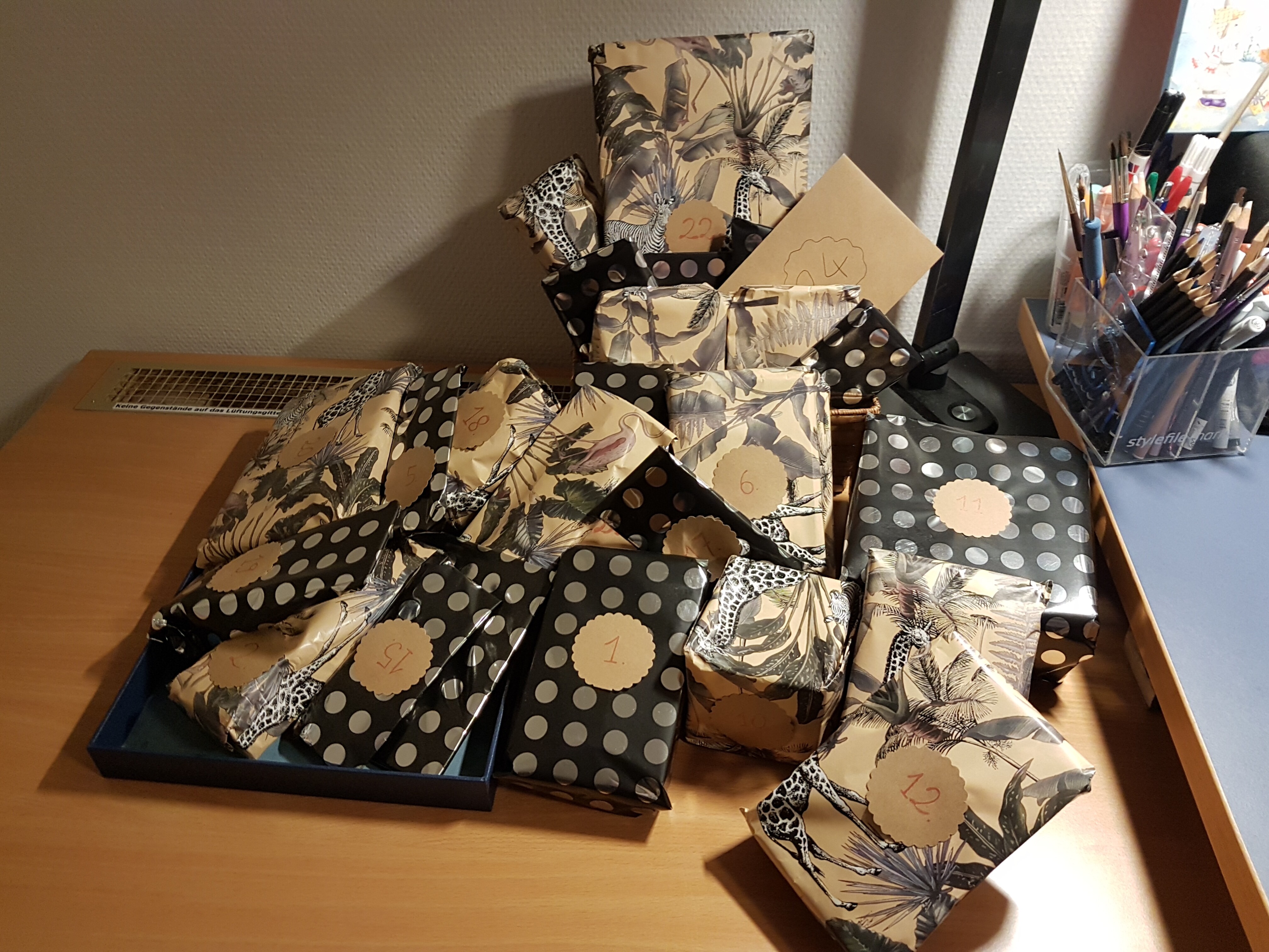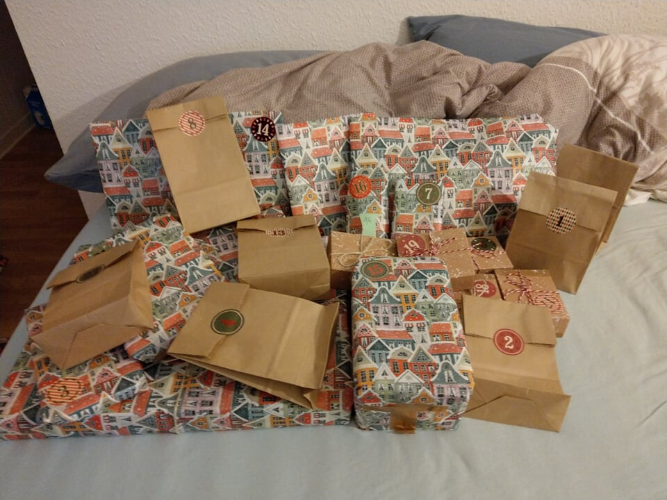 Ich wollte hier nur fix meinen Senf dazugeben, dass mir mein Wichtelkind gerade ein bisschen leid tut. Alle haben bisher so schön verpackte Kalender und meine Verpackungen sehen aus als wäre eine Horde Klebeband und eine Horde Geschenkband drüber gerannt. (Ich hab dafür leider kein Talent)