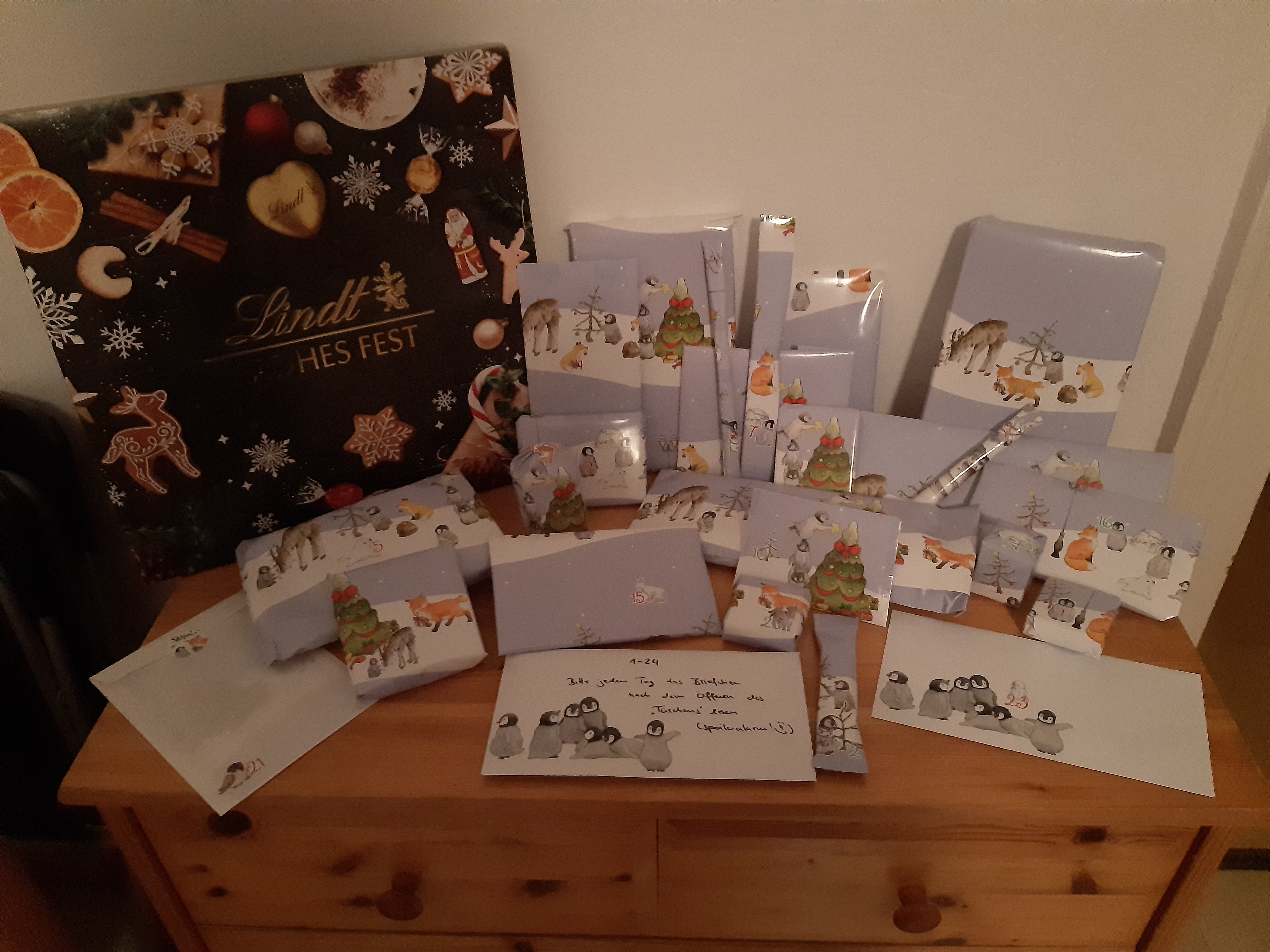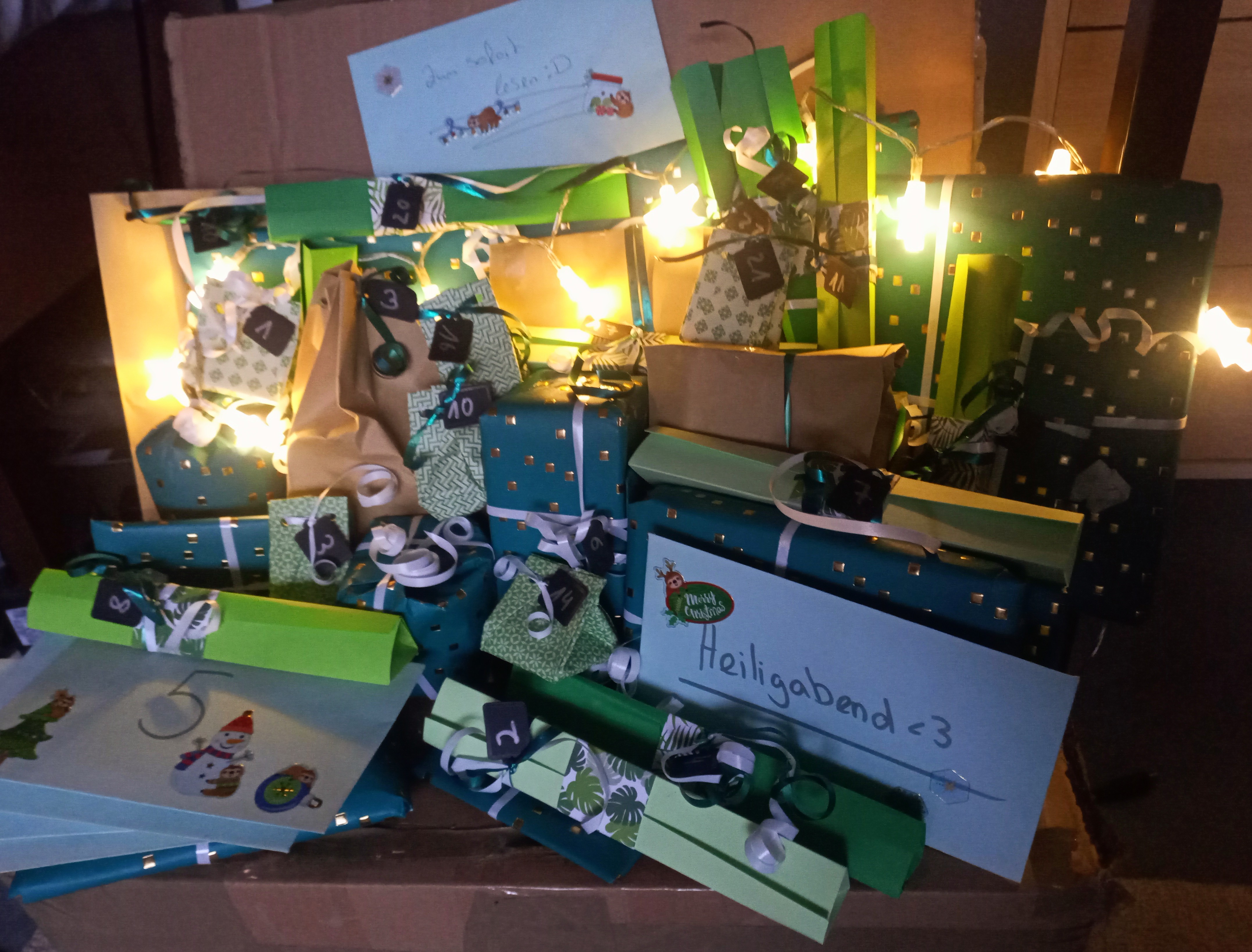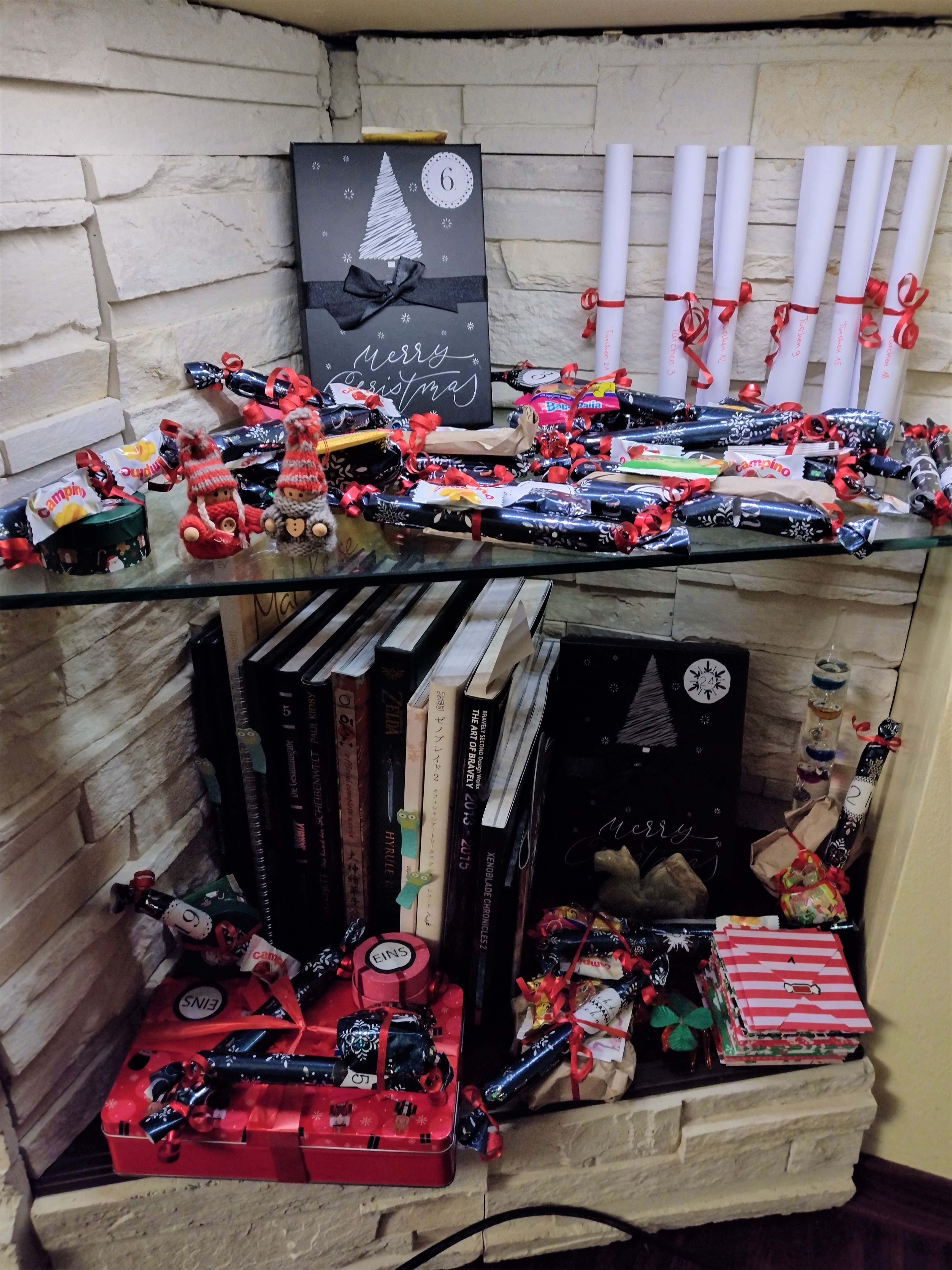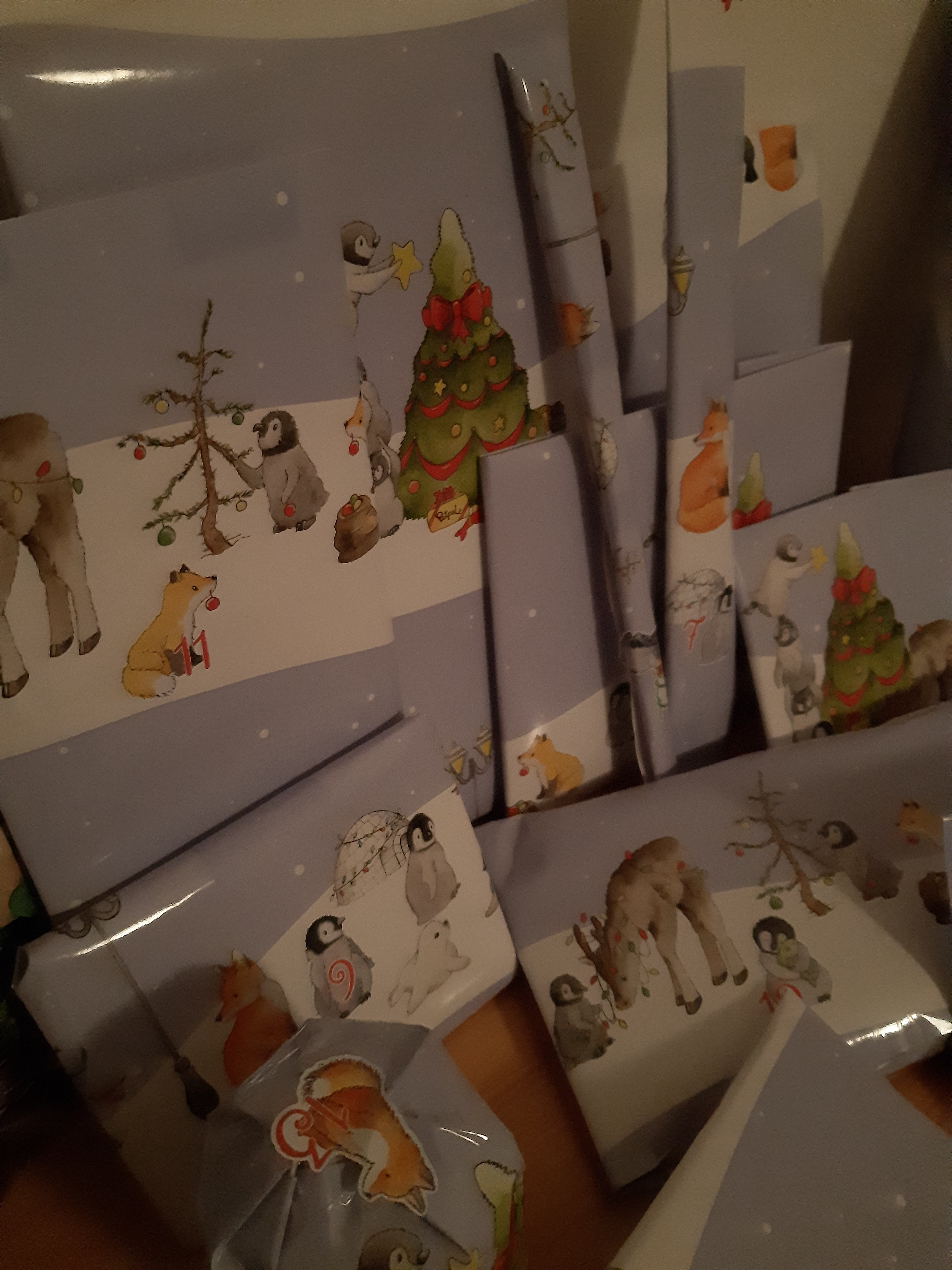 Er besteht aus einer riesigen Menge “Knallbonbons”, an denen manchmal diverse kleine Mini-Pakete dran baumeln sowie einem großen Stapel Briefumschläge, die alle mit einem anderen weihnachtlichen Sticker zugeklebt sind (Fun Fact: Es gibt genau einen Sticker, der nicht ganz klebt. An sich nicht weiter erwähnenswert, aber der befindet sich am Türchen Nummer 17. Das lustige daran: Die Zahl “17” habe ich mal als meine persönliche, eher spaßhaft gemeinte, Pechzahl identifiziert und amüsiere mich jedesmal, wenn ich irgendwo die Kombination aus einer 17 und etwas seltsamen sehe
