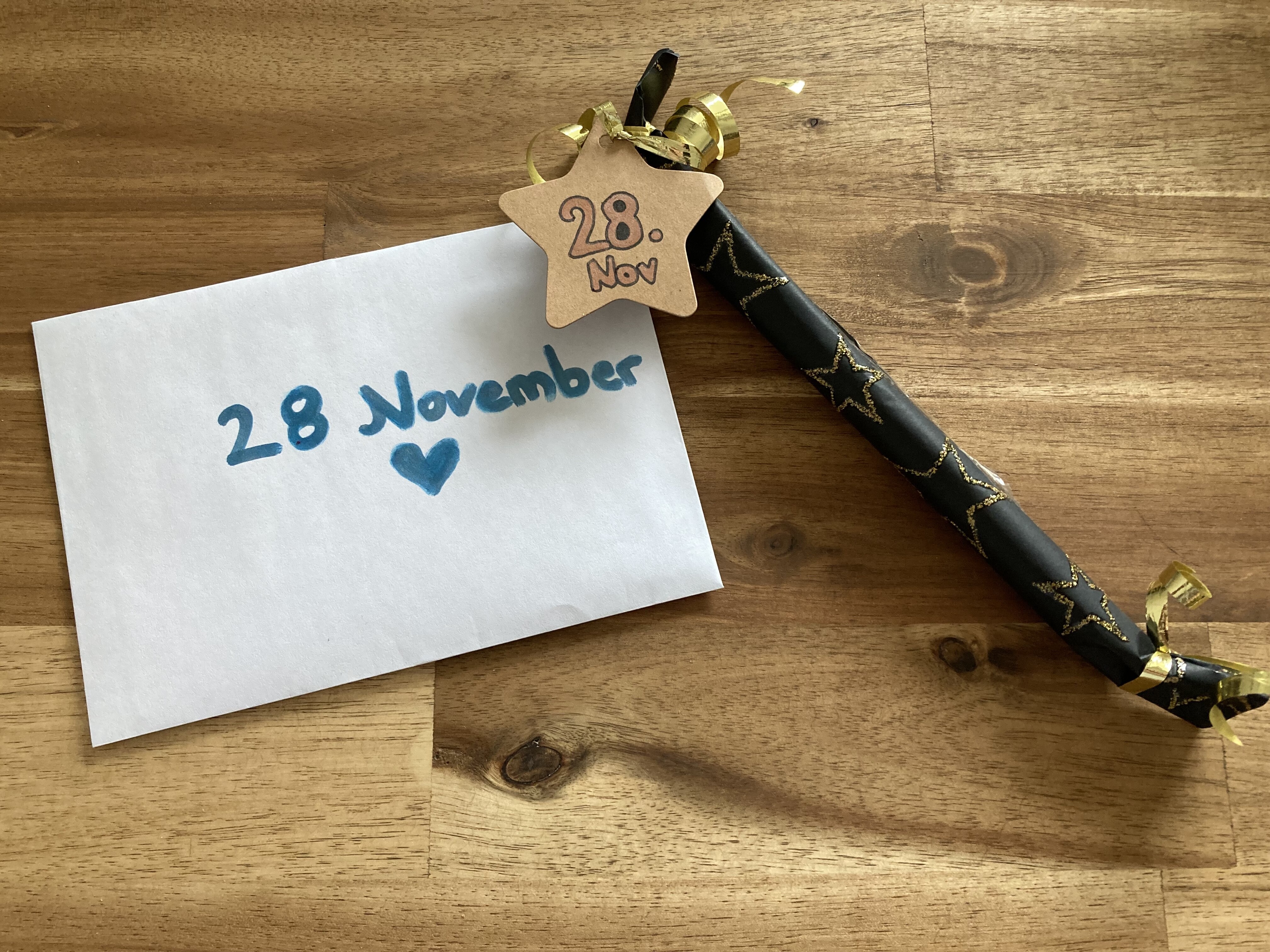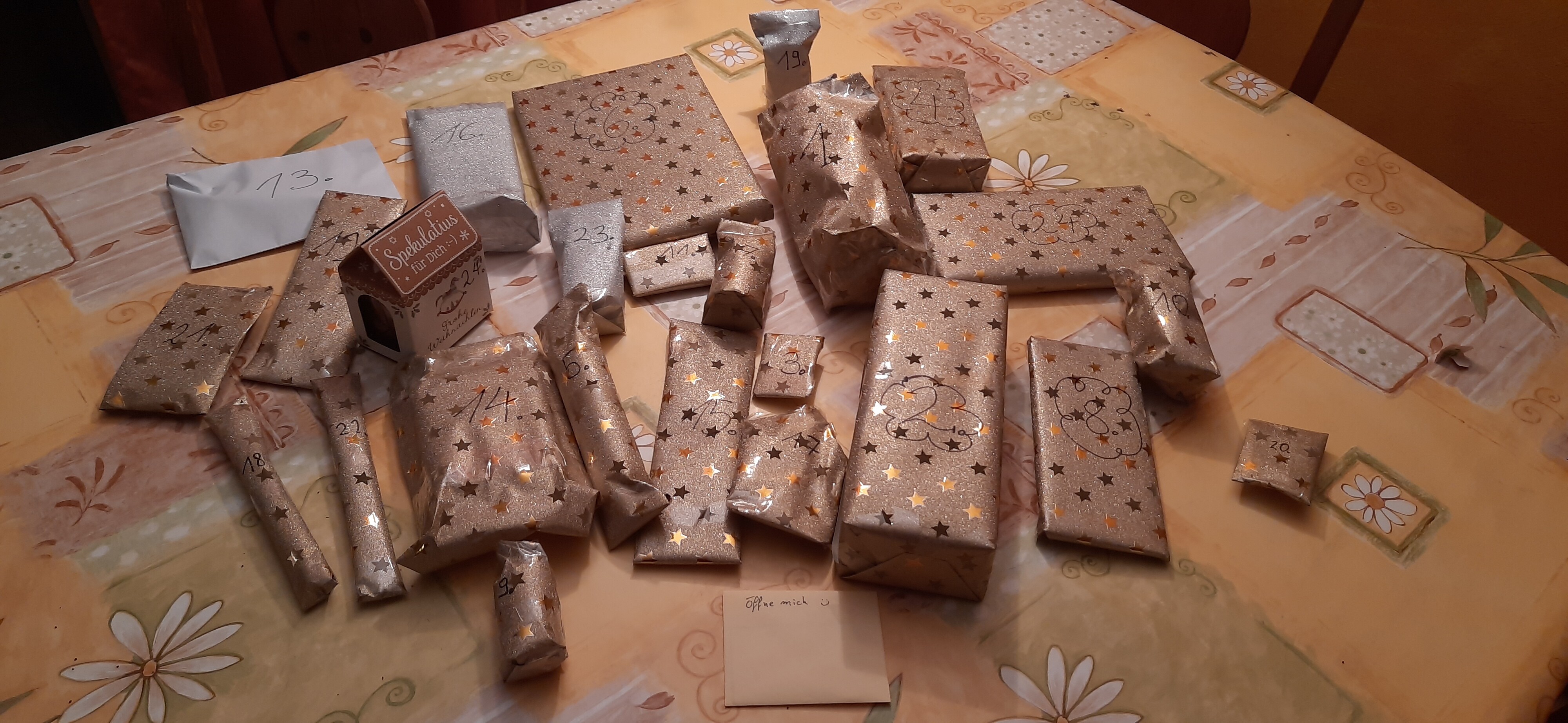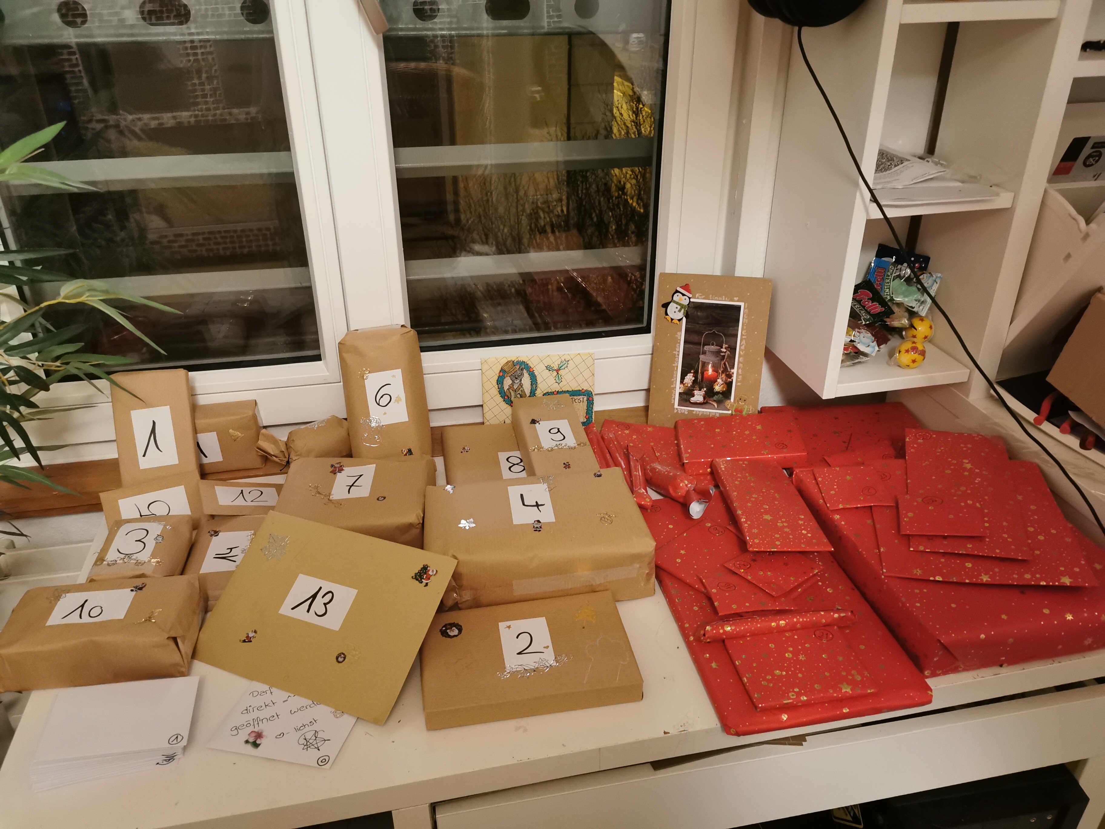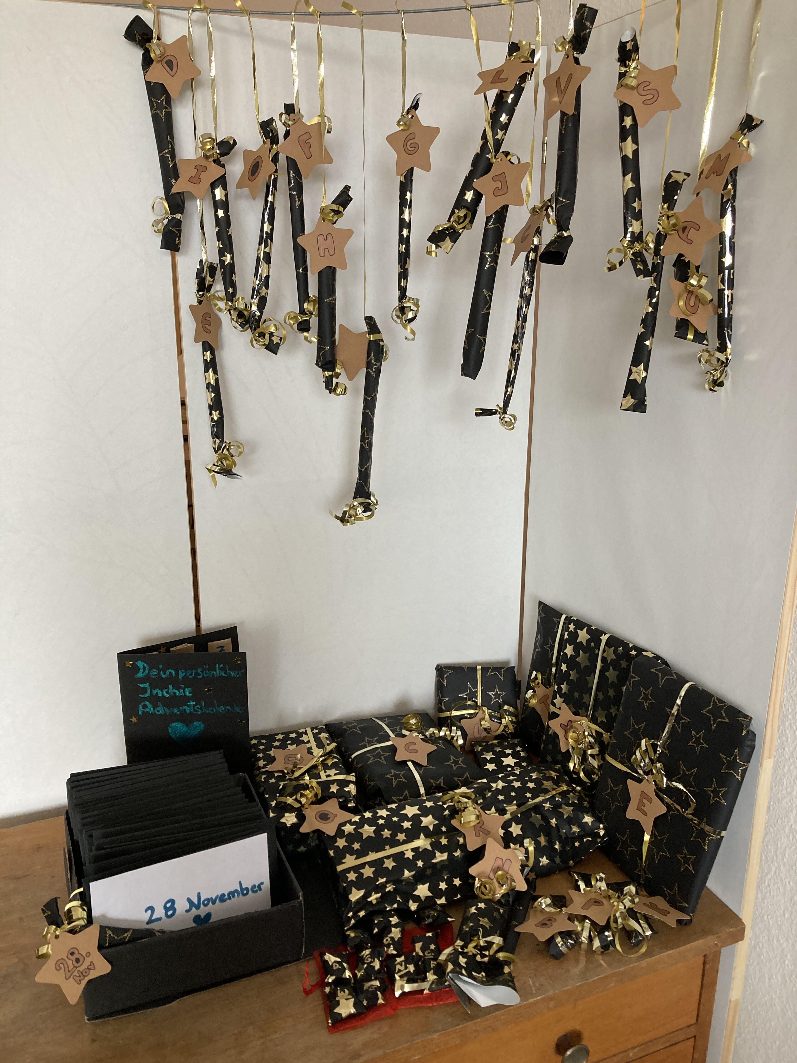 Er besteht aus einer riesigen Menge “Knallbonbons”, an denen manchmal diverse kleine Mini-Pakete dran baumeln sowie einem großen Stapel Briefumschläge, die alle mit einem anderen weihnachtlichen Sticker zugeklebt sind (Fun Fact: Es gibt genau einen Sticker, der nicht ganz klebt. An sich nicht weiter erwähnenswert, aber der befindet sich am Türchen Nummer 17. Das lustige daran: Die Zahl “17” habe ich mal als meine persönliche, eher spaßhaft gemeinte, Pechzahl identifiziert und amüsiere mich jedesmal, wenn ich irgendwo die Kombination aus einer 17 und etwas seltsamen sehe
