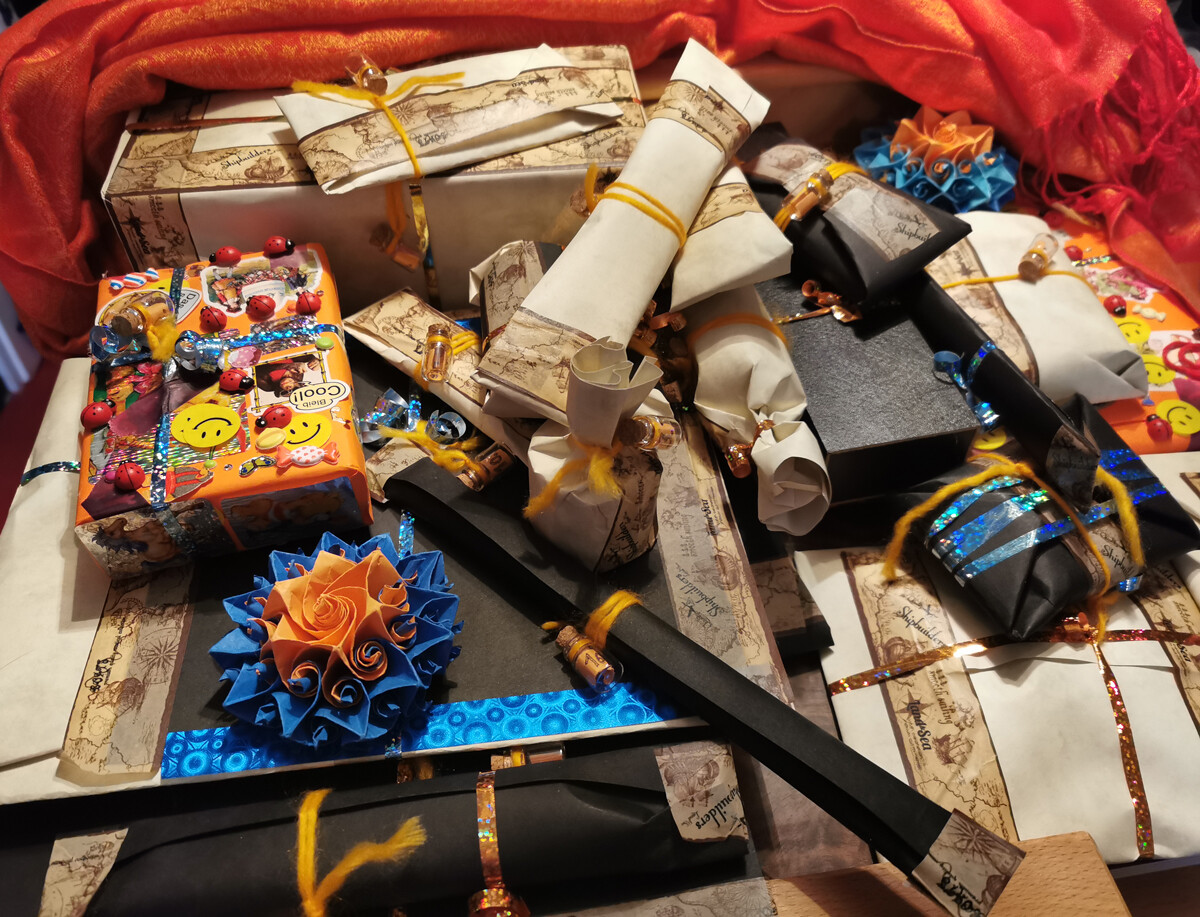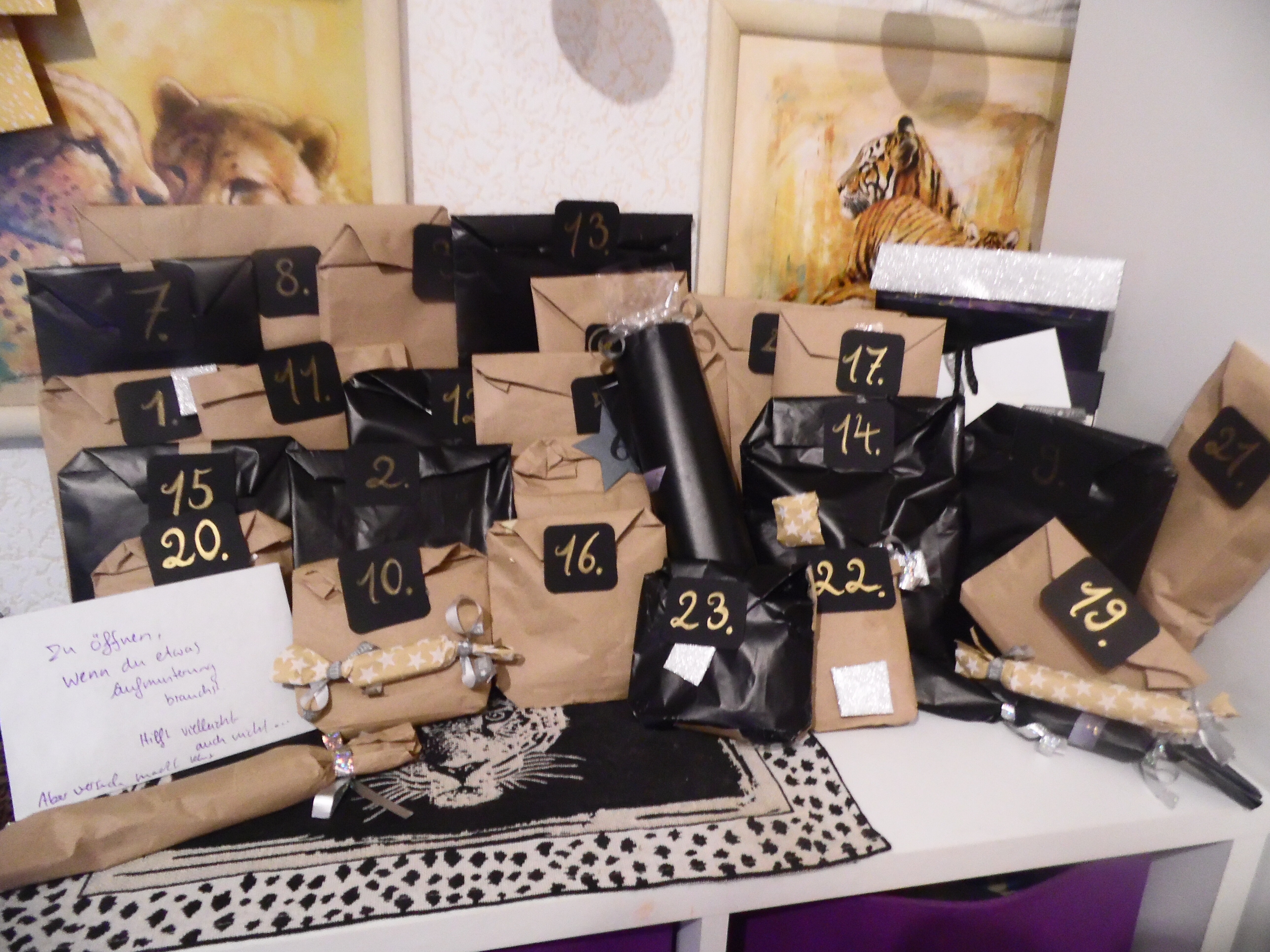 ), sechs Röllchen sowie drei sehr dekorativen Riesenschachteln.Liebe Wichtelmama, wenn meine Vermutung über deine Identität stimmt, dann sind deine Sorgen unbegründet, denn mir gefällt die Aufmachung vom Kalender sehr gut. Auf jeden Fall schonmal ein dickes Dankeschön für den schönen Kalender, jetzt bin ich schon super gespannt auf den 01.12.