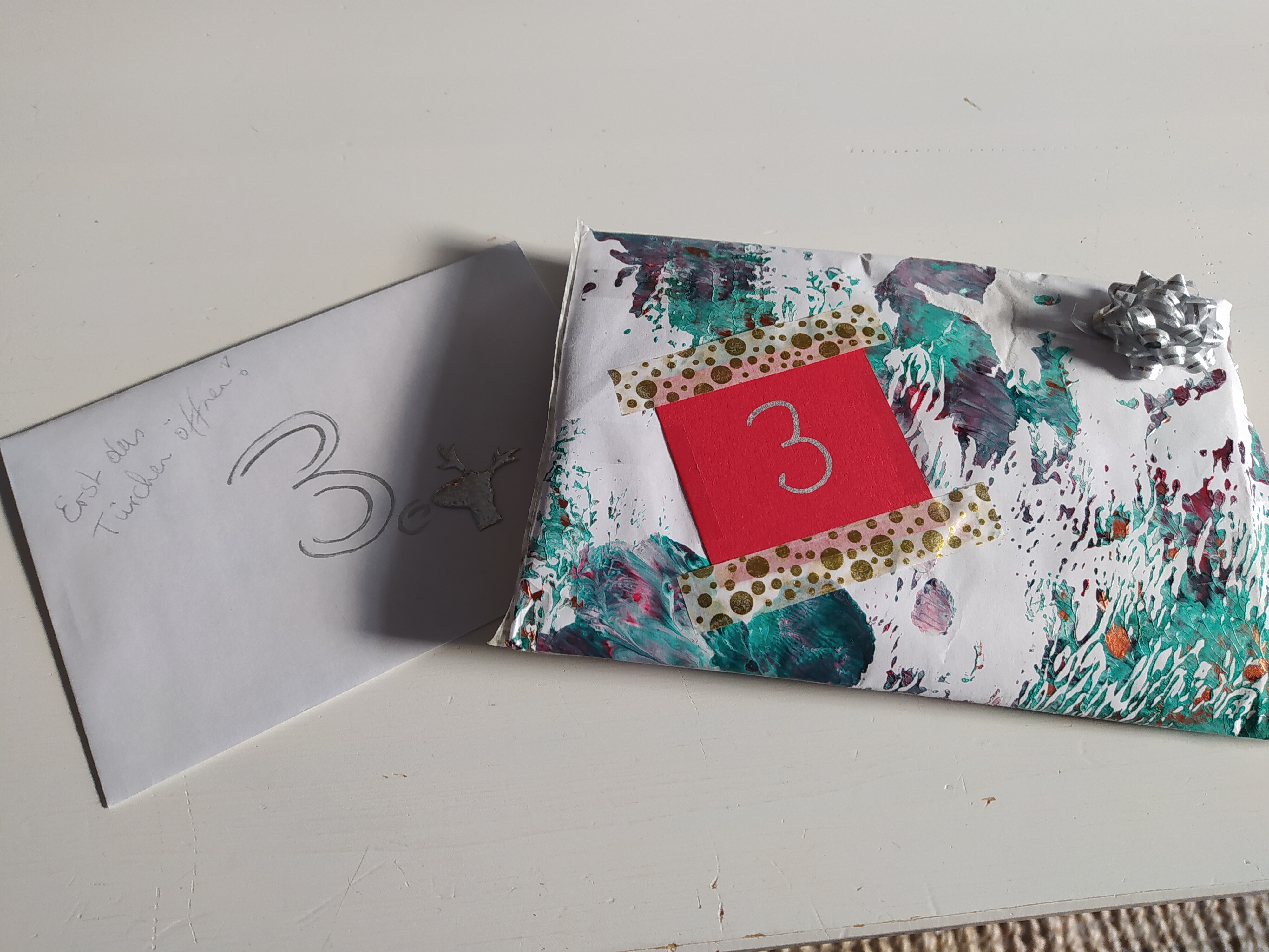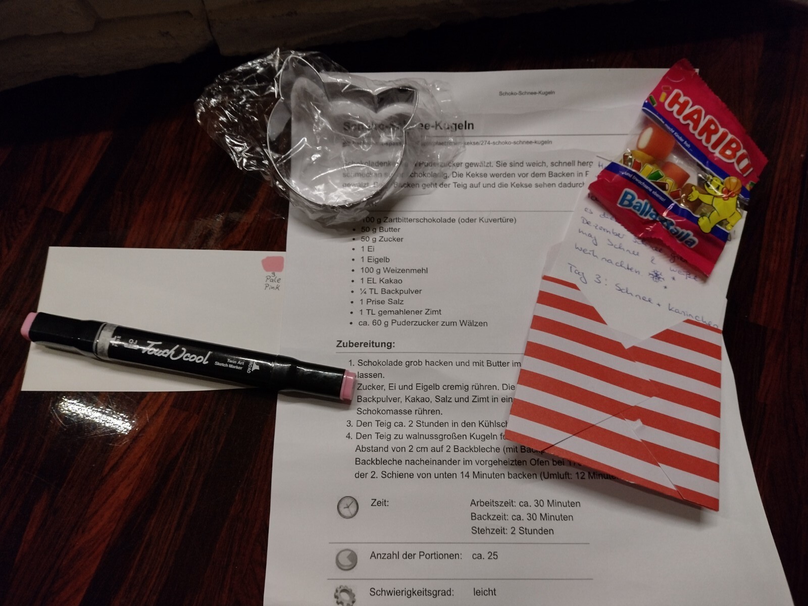 Passend dazu, dass @Eller ihre KristallerklĂ€rungen gestern mit Schneeflocken eingeleitet hatte, hat mein heutiges TĂŒrchen in gewisser Weise Schneeflockenthema. Im kleinen Briefchen geht es heute um Schnee und entsprechend ist die heutige Zeichenchallenge âSchnee+Kaninchenâ. AuĂerdem durfte ich heute die erste von sechs Röllchen aufmachen, ebenfalls passend zum Thema Schnee befand sich darin ein Rezept mit dem Titel âSchoko-Schnee-Kugelnâ. Wenn alles klappt, werde ich in etwa einer Woche wieder PlĂ€tzchen backen, da kommt das mit auf den Backplan. Was dabei auĂerdem zum Einsatz kommen wird: Der neue PlĂ€tzchenausstecher in Katzenform aus diesem Kalender