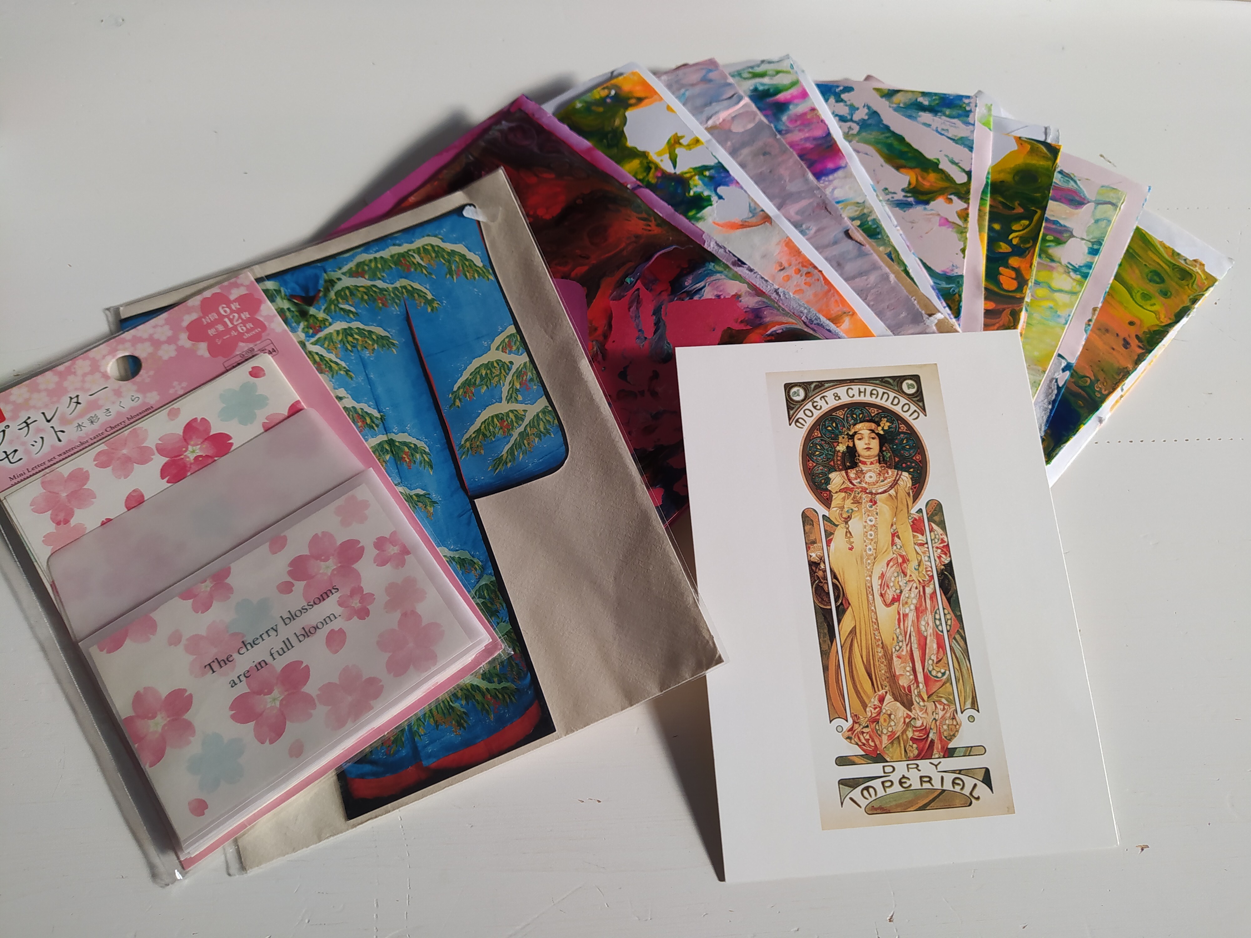 Zuerst dachte ich, dass das Encaustic ist, war dann aber schnell von dem Gedanken angekommen, weil die klassischen âwabenartigenâ Gebilde ja eher typisch Acryl Pouring ist. Meine Wichtelmama hat mir mehrere Briefe + UmschlĂ€ge mit dieser Technik verschönert und mir dazu noch einen lieben Brief geschrieben Und eine Kimono Postkarte dazu gelegt und ein kleines Mini Brief Set mit KirschblĂŒten!