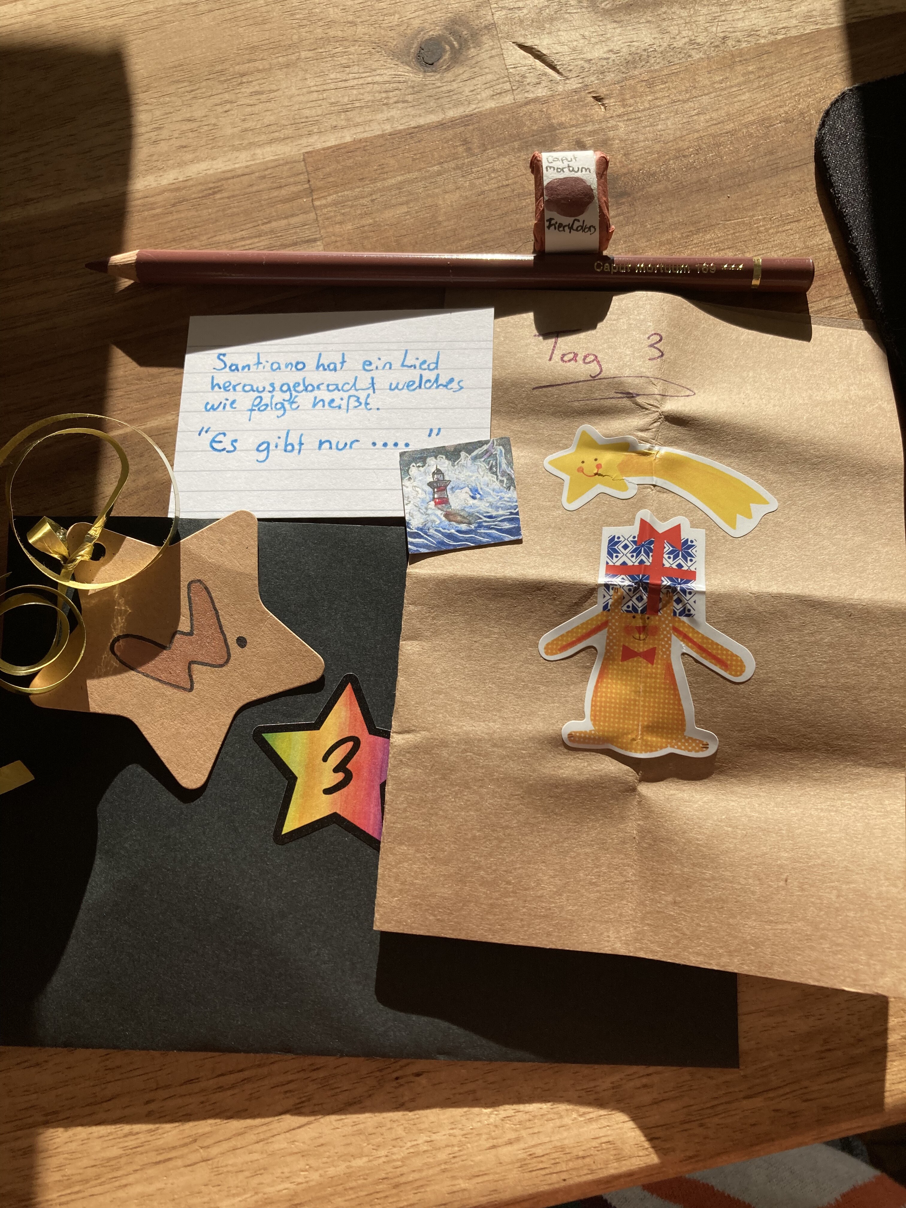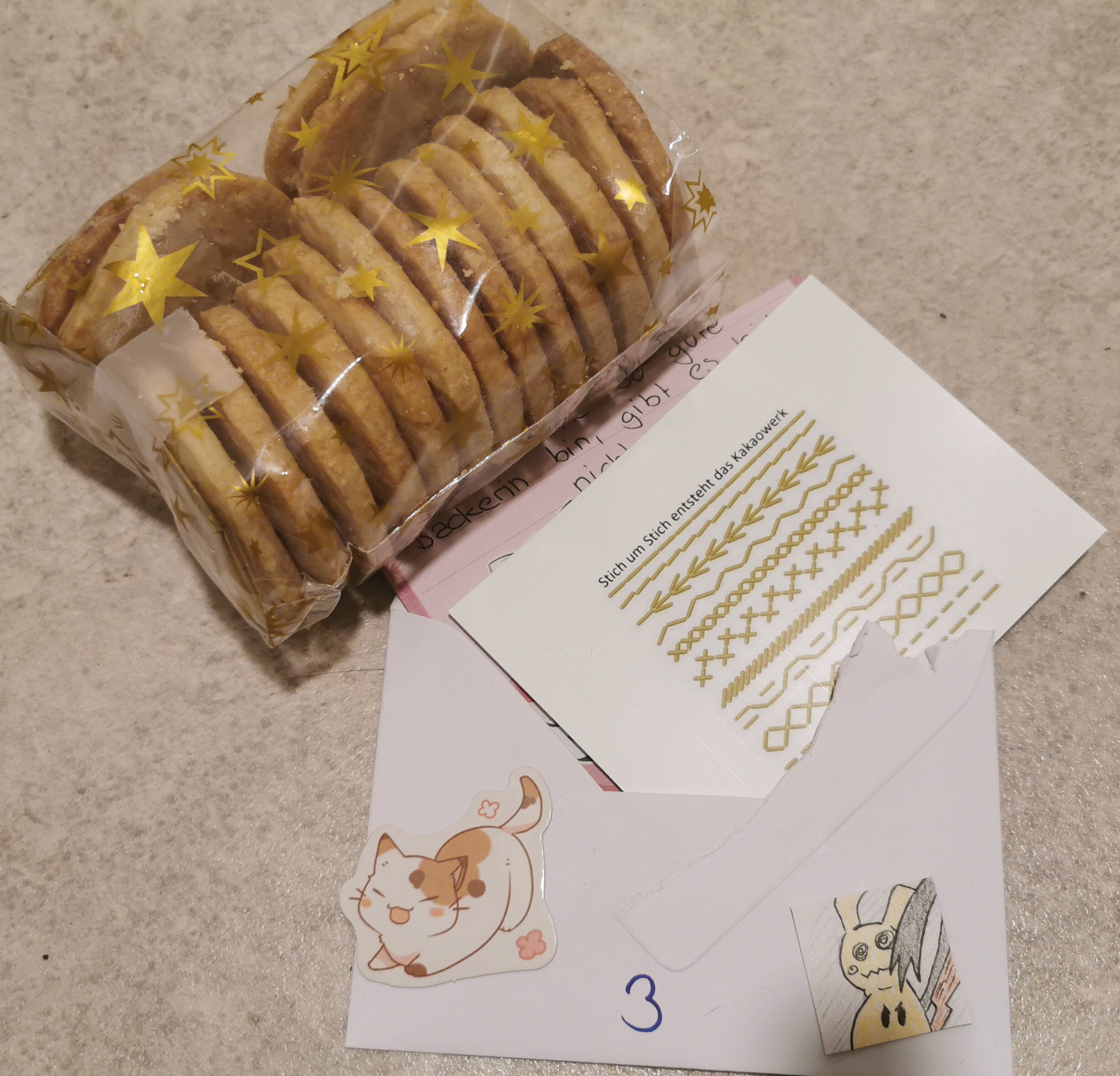 Bei @Paintedstar gab es leckere PlĂ€tzchen. Keine Sorge, auch wenn sie nicht super aufwĂ€ndig sind schmecken sie köstlich. Die hĂ€lfte ist schon weg. Dazu wieder ein Brief und ein Inchie mit Mimigma, das ich zuerst fast ĂŒbersehen hatte. Morgen erwartet mich dann wohl eine Kakao-Karte. Bin schon sehr gespannt was fĂŒr ein Motiv es sein wird. Aber irgendwie klingt das nach einer Stickerei?? Bin doch leicht verwirrt. Ăbrigens finde ich diese kleinen Hinweise richtig toll.