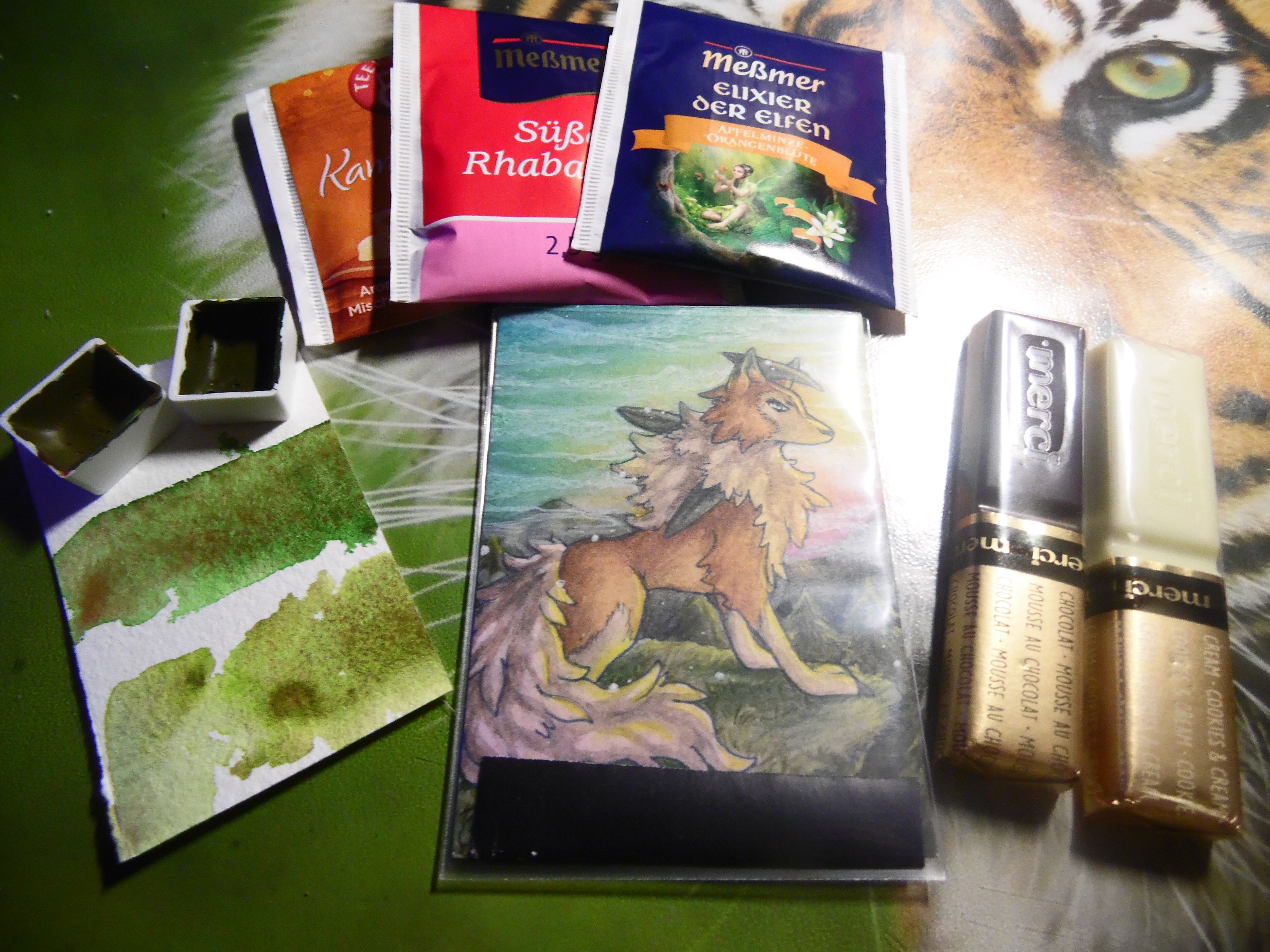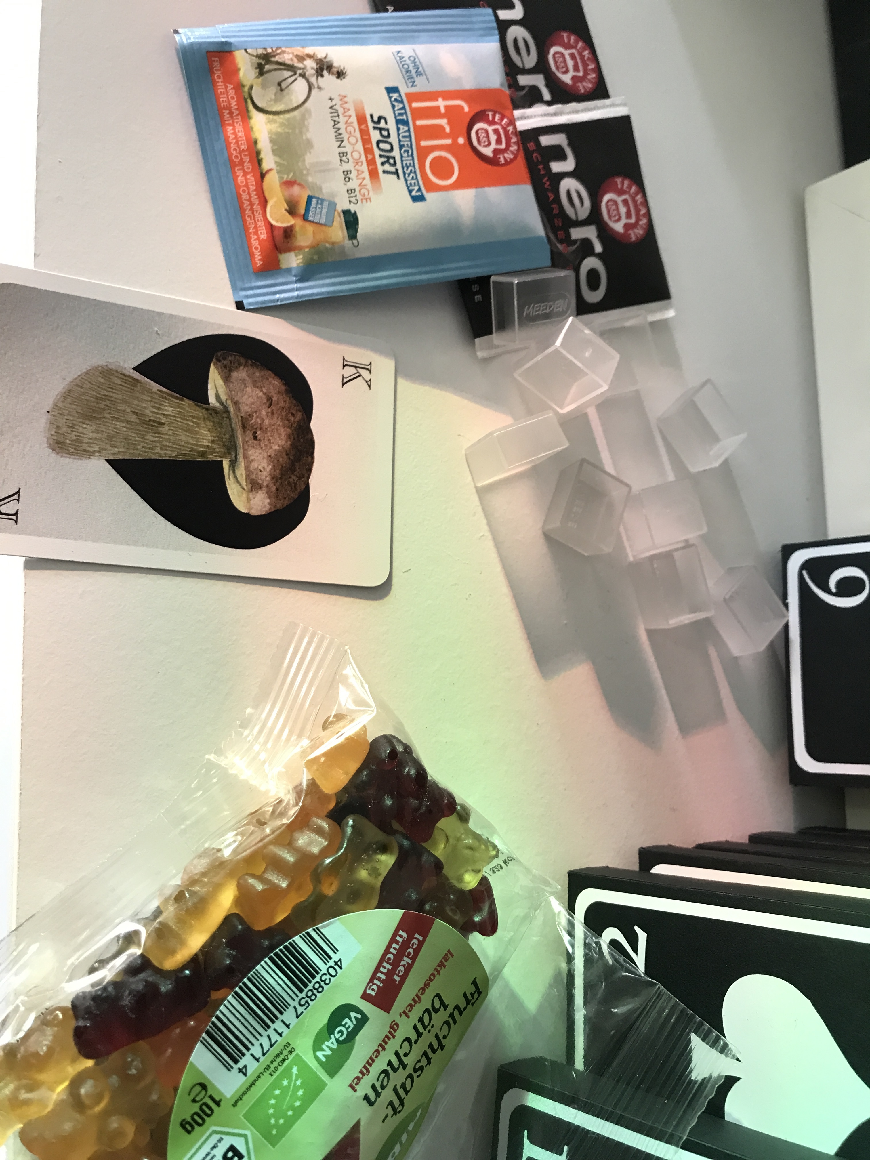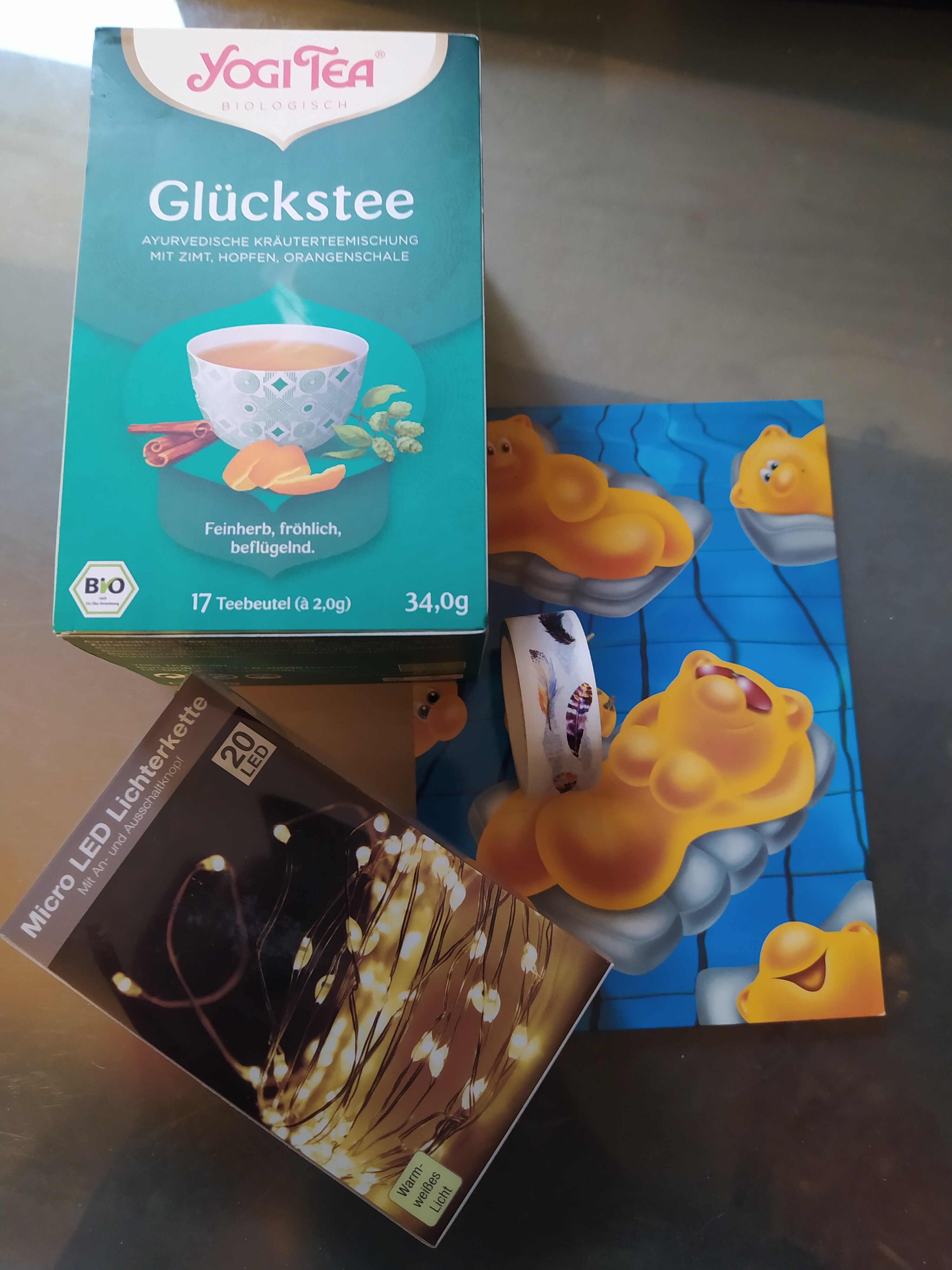Beim Auspacken dachte ich erst noch, hä, die Gummibärchen sehen aber merkwürdig aus?!? - aber dann stellte sich heraus, das sind Teebären! Man tut sie in heißes Wasser, und dann wird daraus Tee… Ich denke, das werde ich gleich mal zum Abendessen ausprobieren! :D