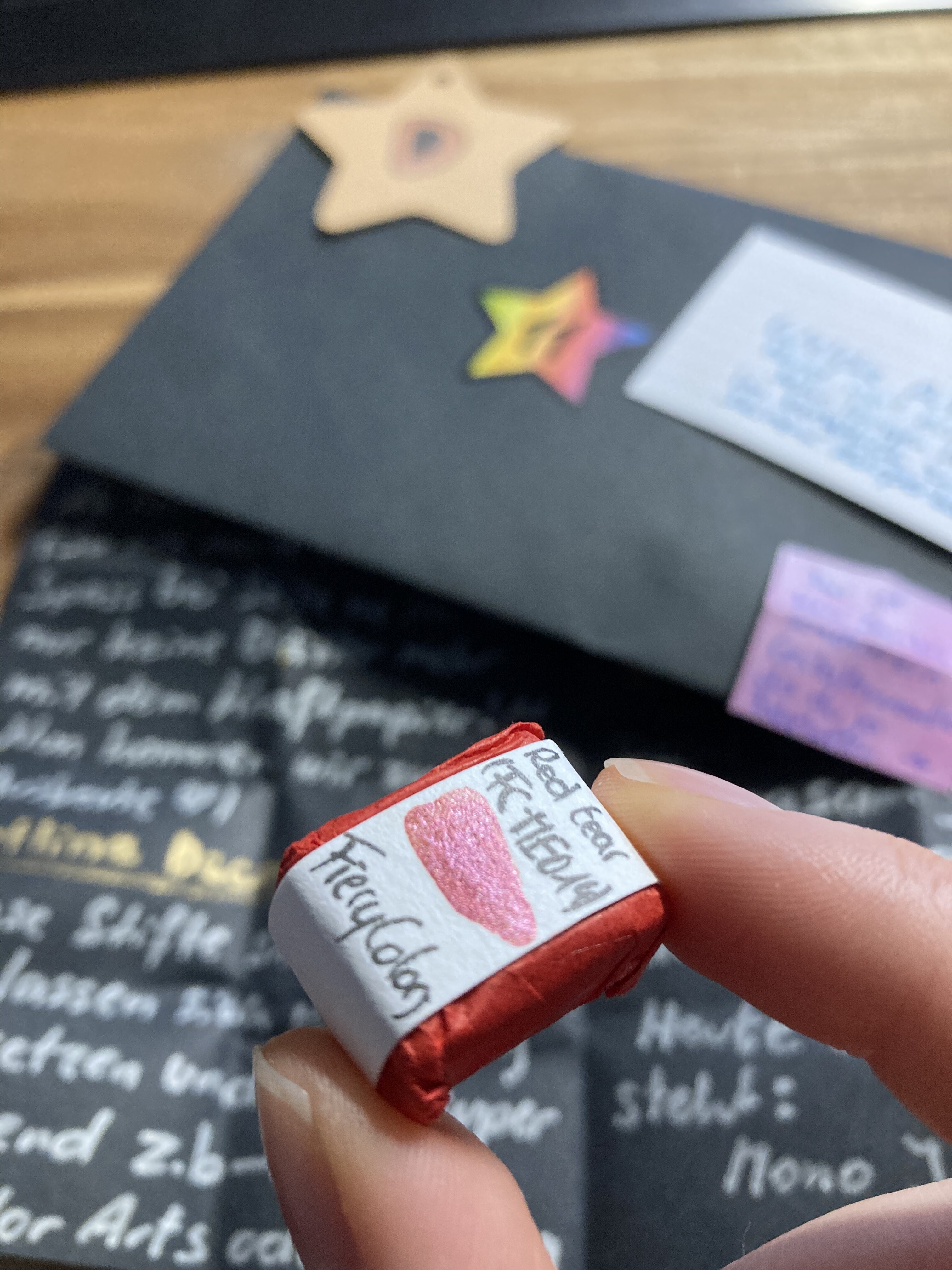 Und auch von @smilestack bekam ich wieder tolle Geschenke. Gestern gab es (neben Tee, Mineral-Foto und Fortsetzung der Geschichte wie jeden Tag - ich bin übrigens ganz begeistert von der Erzählung!!!) ein hübsches Haargummi aus Schmetterlingsstoff (genau mein Ding!) und eine Tafel Milka Luflee (YAY Luftschokolade, ich liebe das Zeug).