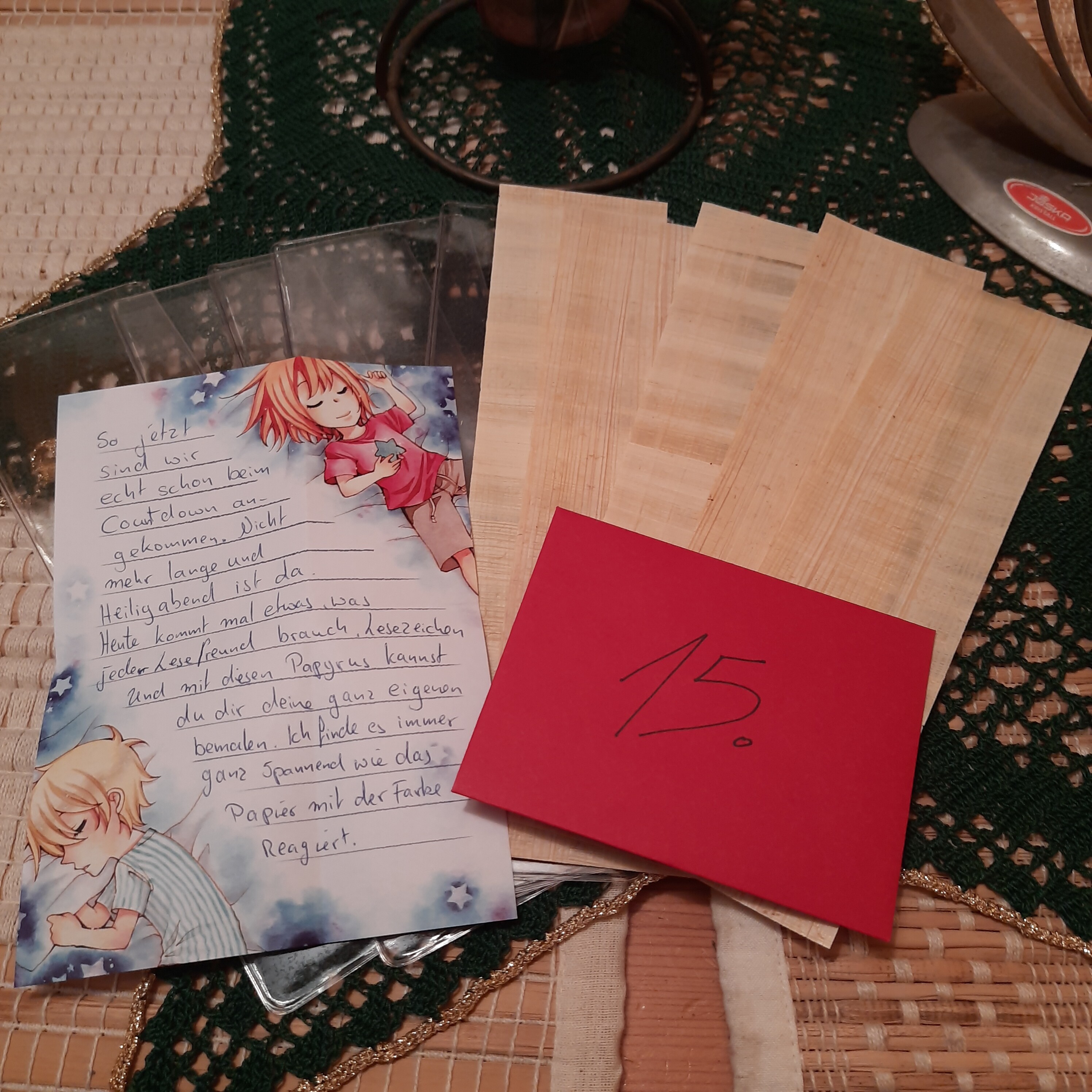Heute war etwas richtig interessantes in meinem Adventskalender, echtes Papyrus für Lesezeichen und dazu Folie zum sichern. Auf Papyrus habe ich auch noch nie in meinem Leben gezeichnet, bin ich auch schon mega gespannt aufs ausprobieren!