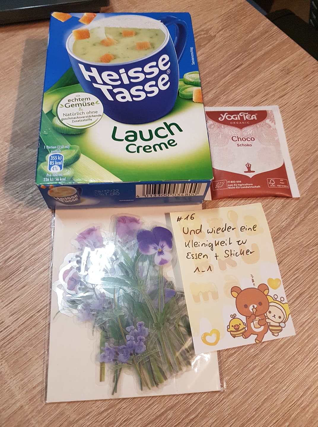 Heute hatte ich wieder eine Tassensuppe einen leckeren Tee und ein paar mega schöne Blumensticker <3 Ich muss nur zugeben dass ich froh bin dass, das jetzt mit den Tassensuppen vorbei ist. Es war leider etwas viel geworden ich hätte mich zwischendurch mehr über eine Schoki oder so gefreut da ich ja angegeben habe ich mag Abwechselung :-/ Das hätte preislich auch keinen unterschied gemacht wenn es darum geht :-/ Liebe Wichtelmama nehme mir das bitte nicht übel es ist nicht tragisch ich will dir das nur als Tipp geben fürs nächste mal oder so. ;-)
