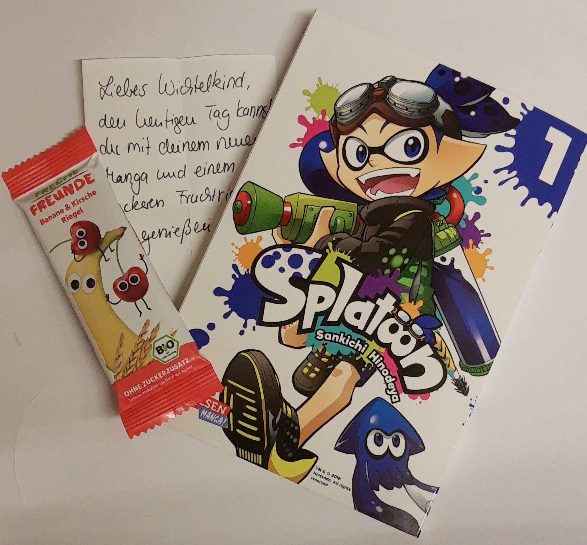 Im 16. Türchen war heute ein leckerer Früchteriegel (den ich auch schon aufgefuttert habe) und ein splatoon Manga drin ich wusste gar nicht das das existiert vielen Dank!! Ich hab mich riesig gefreut und werde ihn gleich anfangen zu lesen (≧▽≦)