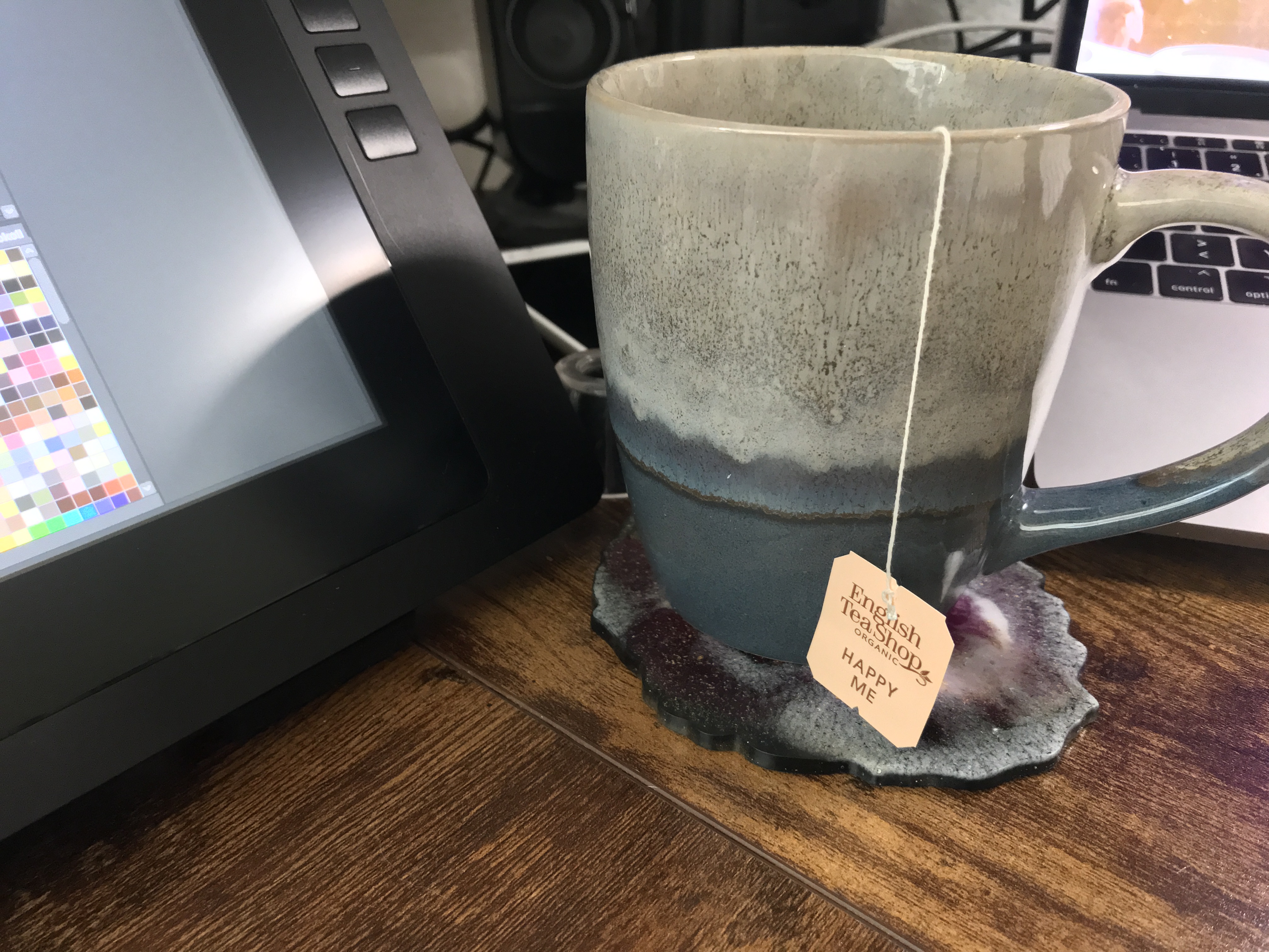 Ich habe mich heute morgen gefreut wie ein Schneekönig. Wir haben chronisch zu wenig Untersetzer und in meinem Büro musste ich meinen einzigen (nicht so hübschen) immer mit von A nach B nehmen, um mit meiner Tasse nicht alles vollzusiffen. Deswegen habe ich mir sowas schon lange gewünscht. <3 Und dass sie jetzt auch noch selbstgemacht wurden gibt ihnen direkt noch mehr emotionalen Wert!