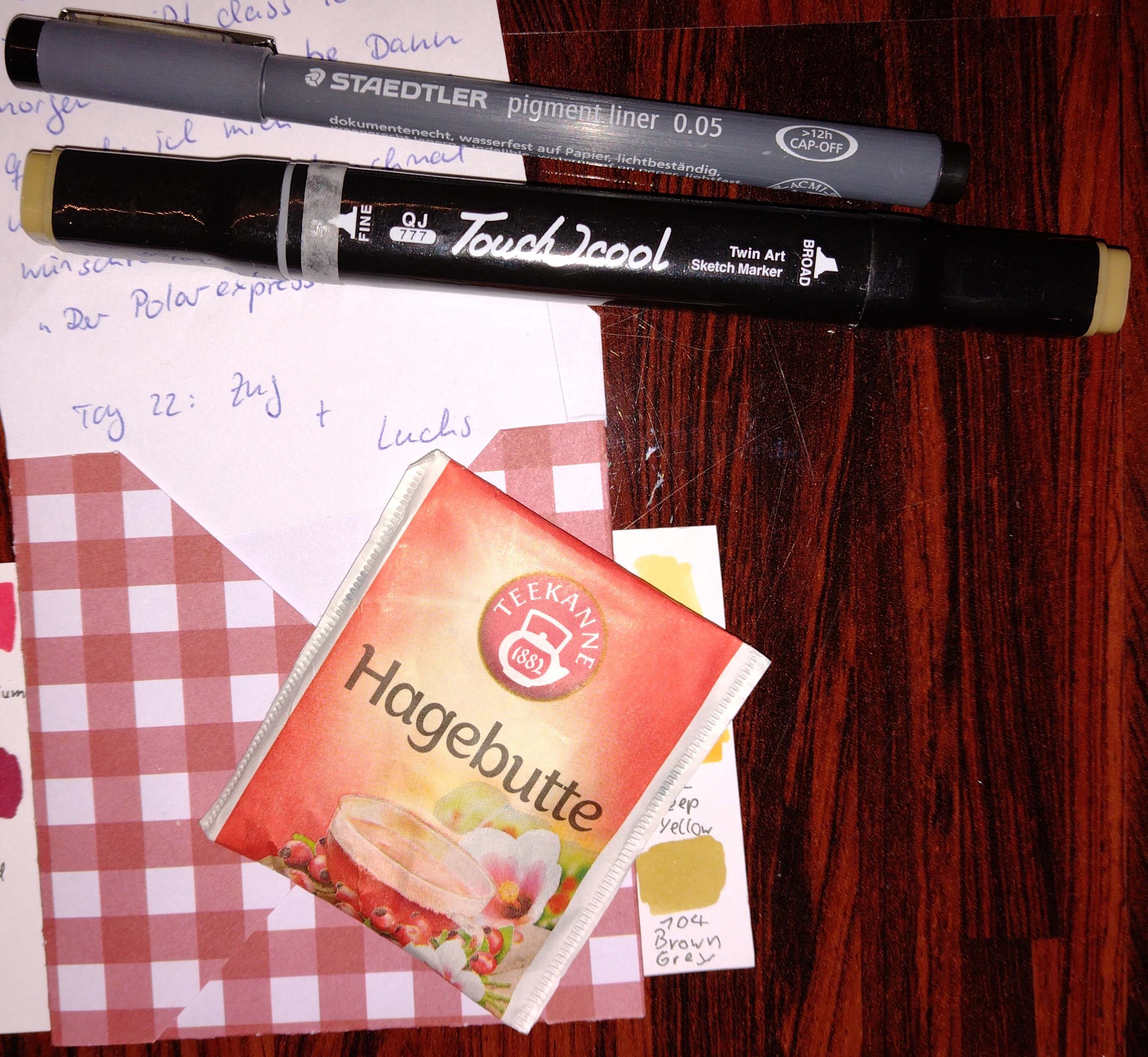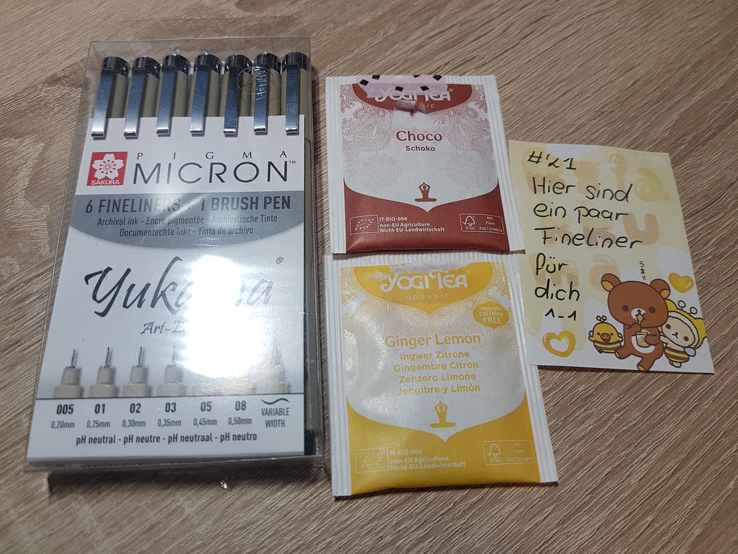 Im heutigen Türchen haben mich ein Marker in einem interessanten, vermutlich für Boden gut geeigneten Braunton erwartet, sowie ein 0,05 Liner, die außerhalb von Zeichenchallengephasen in meinen täglichen Zeichenübungen im Dauereinsatz bei mir sind. Kann ich also immer gebrauchen. Dazu gab es einen Tee.