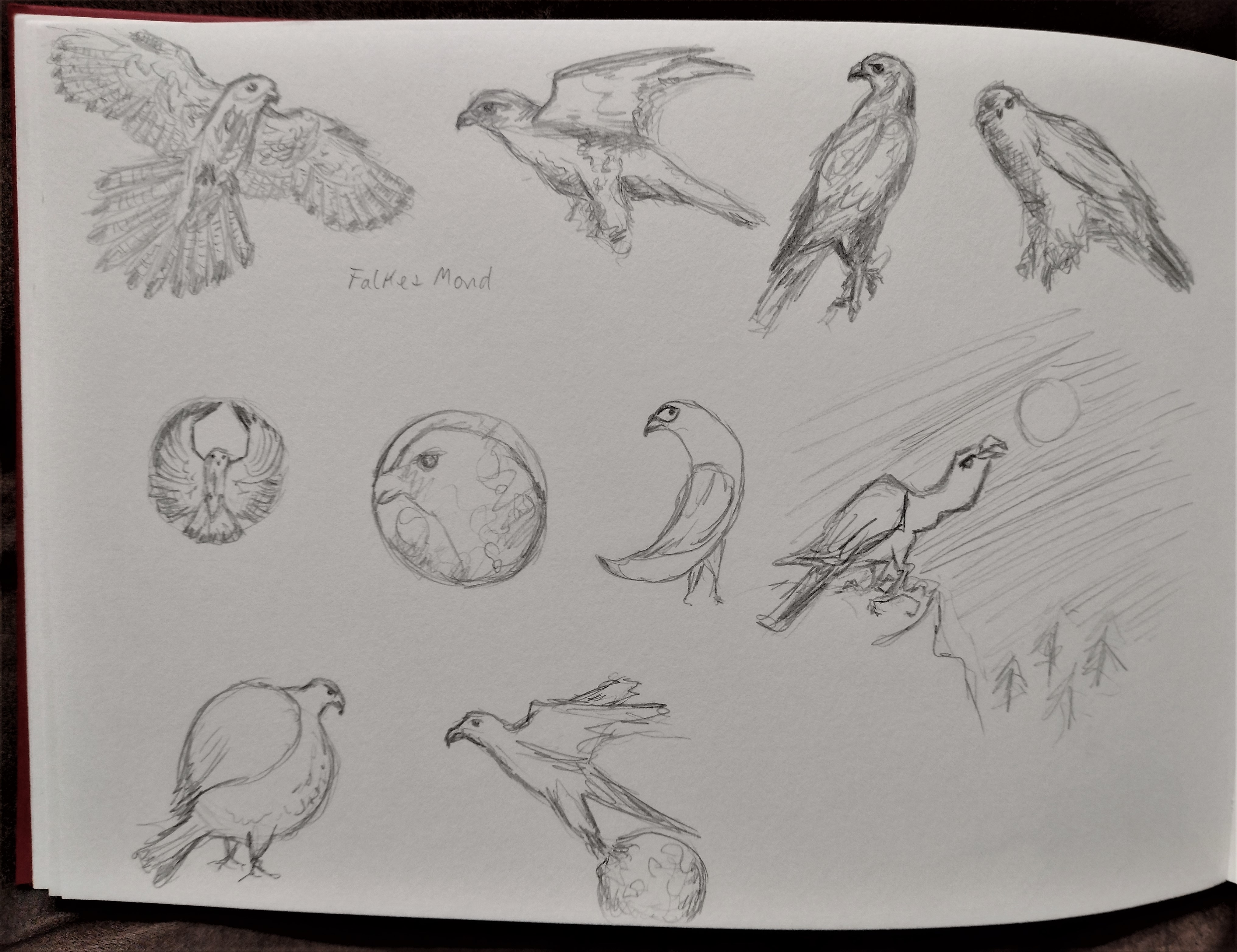 Das gestrige Thema war Falke+Mond. Eins der Ergebnisse ist eine kleine Szene, von der ich jetzt ernsthaft mit dem Gedanken spiele, sie als Kartenmotiv umzusetzen: Ein Falke hat den Mond gestohlen (=hält ihn in den Klauen und fliegt damit weg). Ich stelle mir vor, wie die Karte dann dort, wo der Mond eigentlich sein sollte, ein Loch hat
