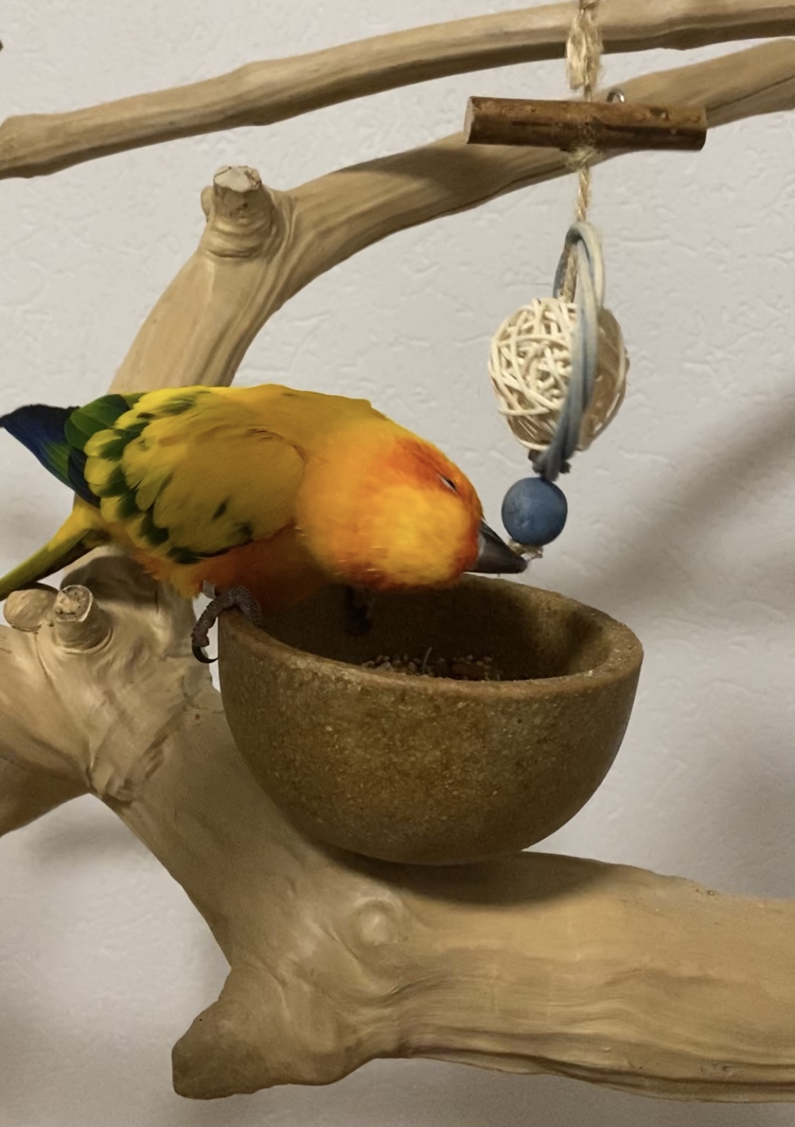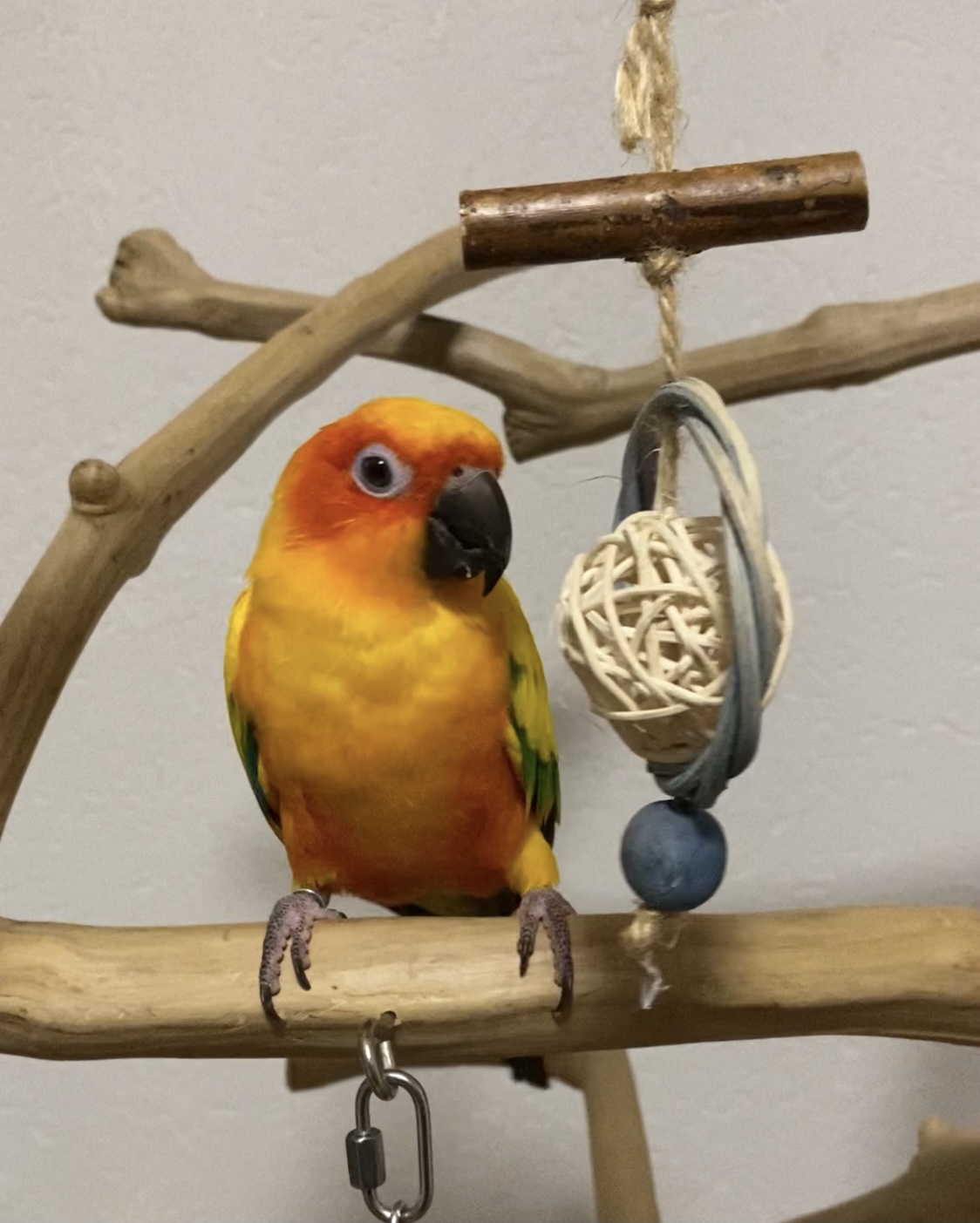 Hier kommen die versprochenen Fotos - das Spielzeug für meine Sonnen- und Goldstirnsittiche wurde zwar zuerst skeptisch beäugt, nach kurzer Zeit aber doch vorsichtig getestet (wie immer