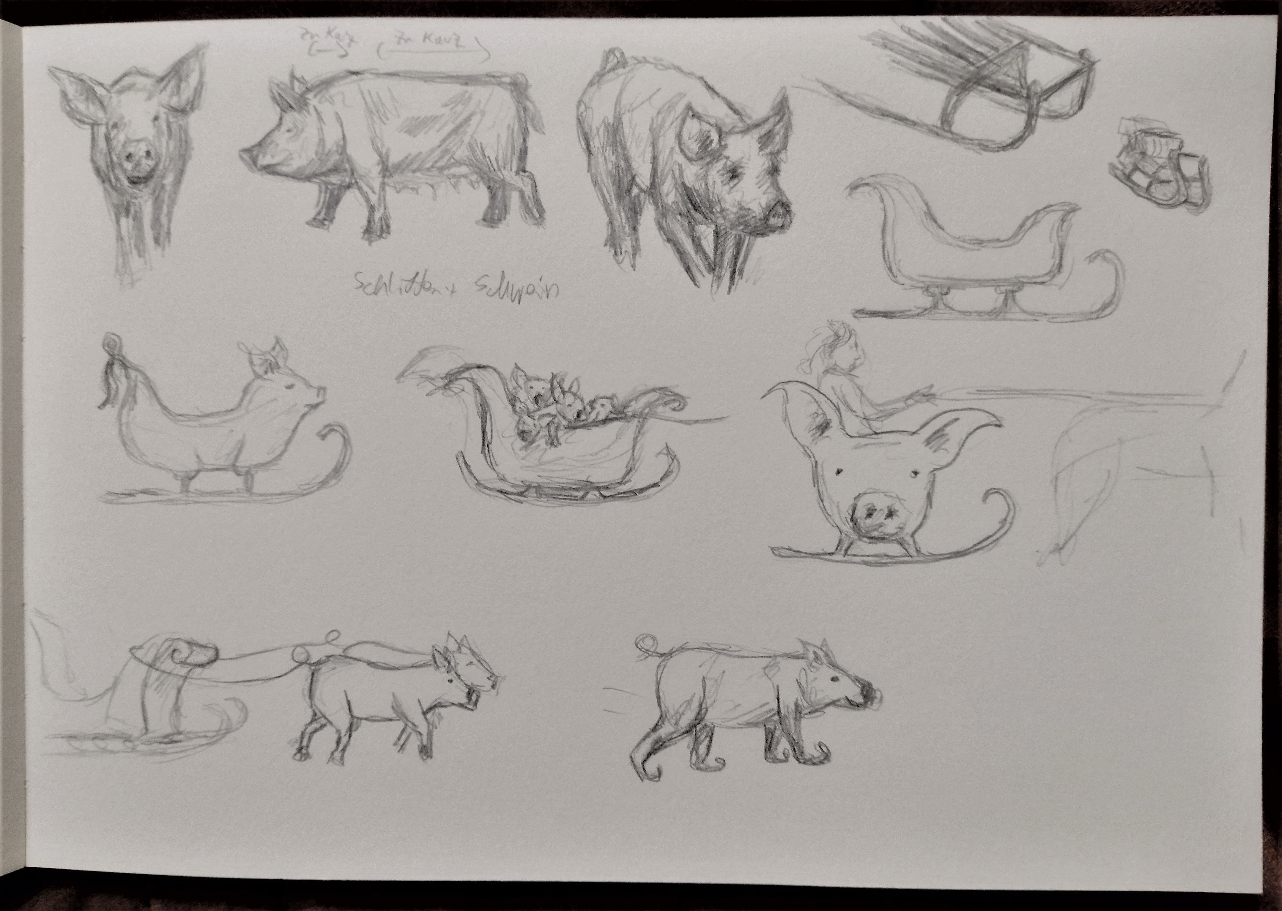 Das gestrige Thema war Schwein + Schlitten. Da ich schon vor ein paar Tagen einen Eisbären dabei hatte, der einen Schlitten zieht, hatte ich mir direkt die Zusatzregel gesetzt, es darf nur maximal einen von Schweinen gezogenen Schlitten geben. Hier sind die Ergebnisse: