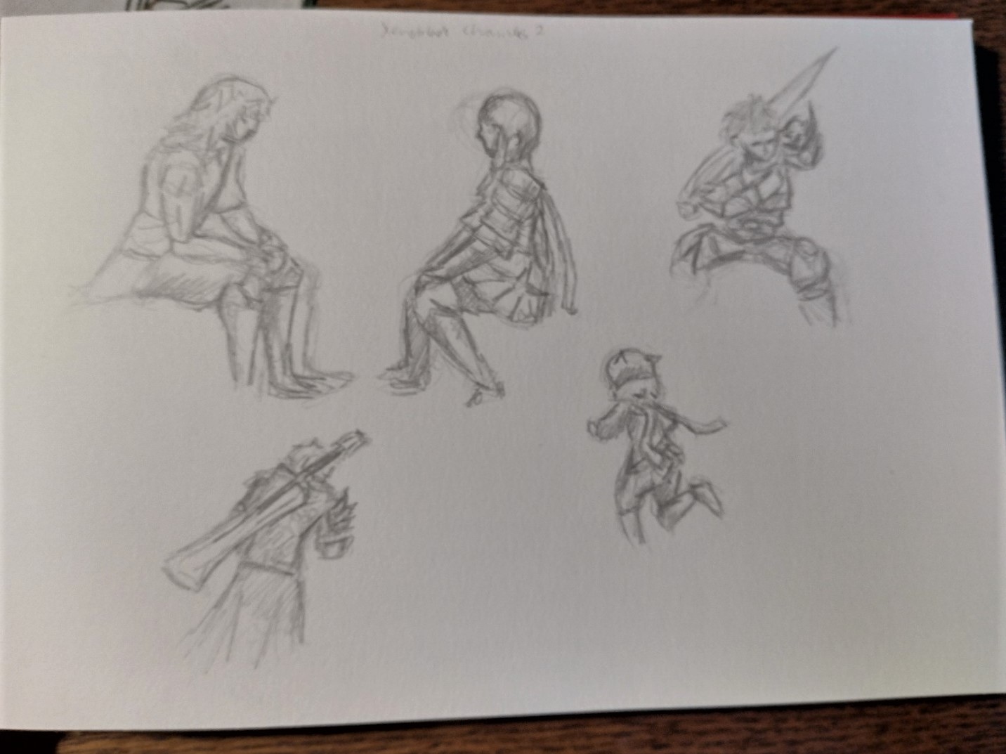 Für heute habe ich mich über den Würfelwurf gefreut. Ich habe nämlich erneut etwas, was ich mag mit X oder Y erwürfelt. Das war glaube ich die einzige Dopplung beim Würfelergebnis und beim letzten derartigen Wurf hatte ich ja Figuren aus Xenoblade Chronicles 3 gezeichnet und gleich noch zwei Skizzenbuchseiten frei gelassen, um auch noch Teil 1 und 2 zu ergänzen. Entsprechend habe ich heute dieses TODO schonmal zu 50% erledigt, indem ich eine Seite mit Xenoblade 2 befüllt habe. Da wir diesen Monat seeehr viel Xenoblade gespielt habe (und es jetzt durch ist
