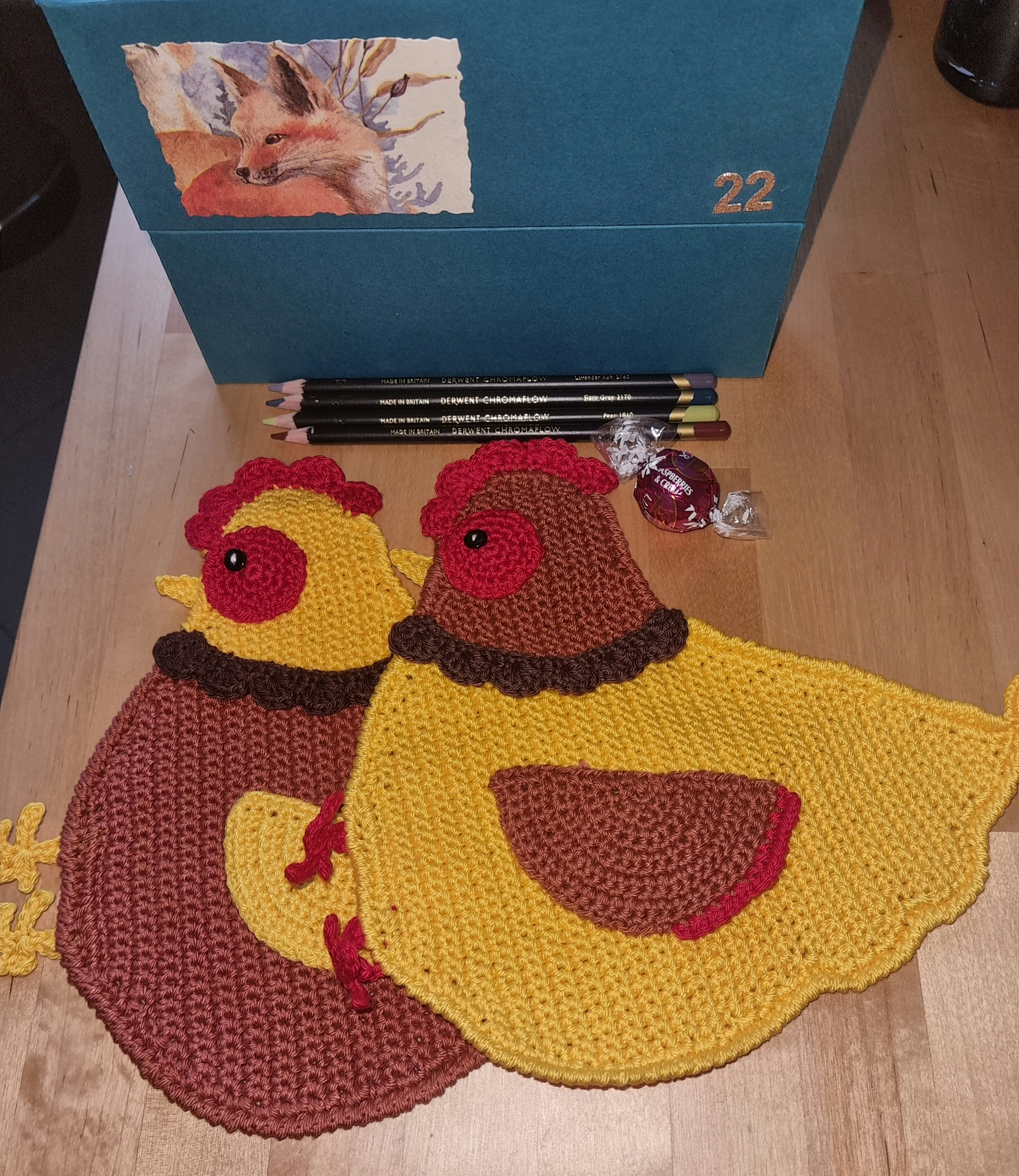 @LilaLauneWoelkchen ,die beiden Hühner sind Topflappen ,und ich freue mich sehr das dir meine Auswahl bisher gefallen hat .