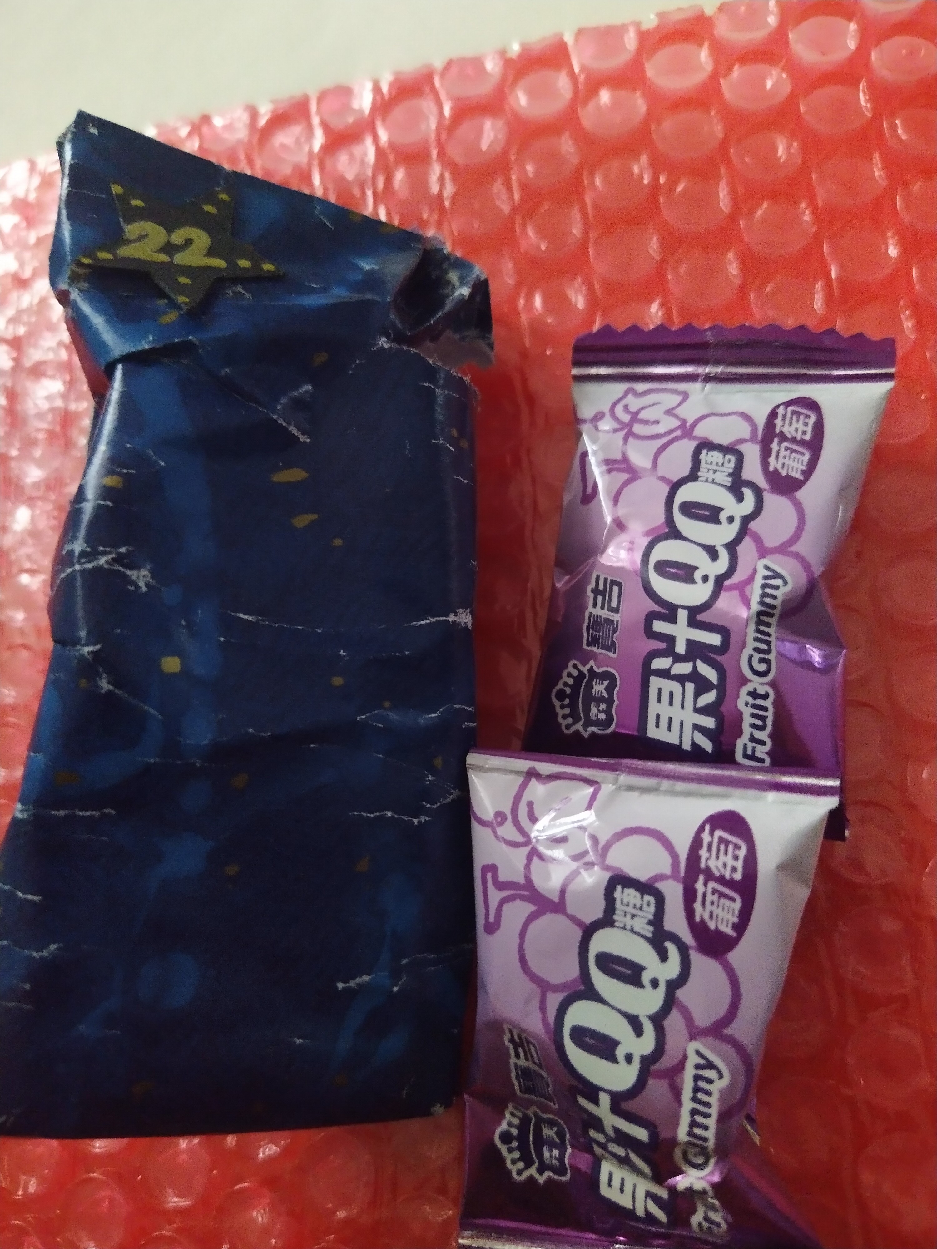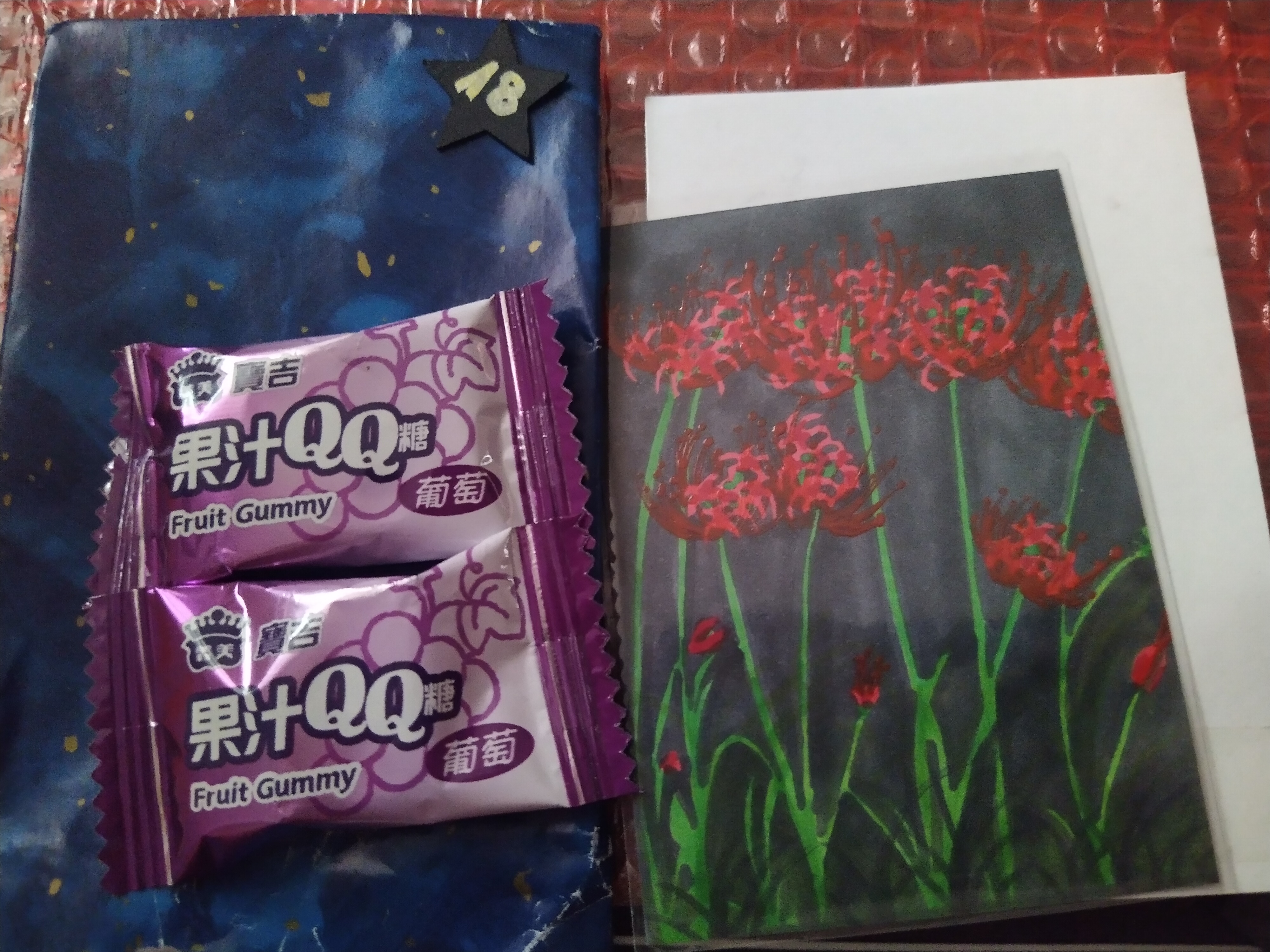 Es gab wieder die leckeren Fruchtgummis und eine Kakao Karte mit meinen lieblings Blumen drauf. Vielen Dank.