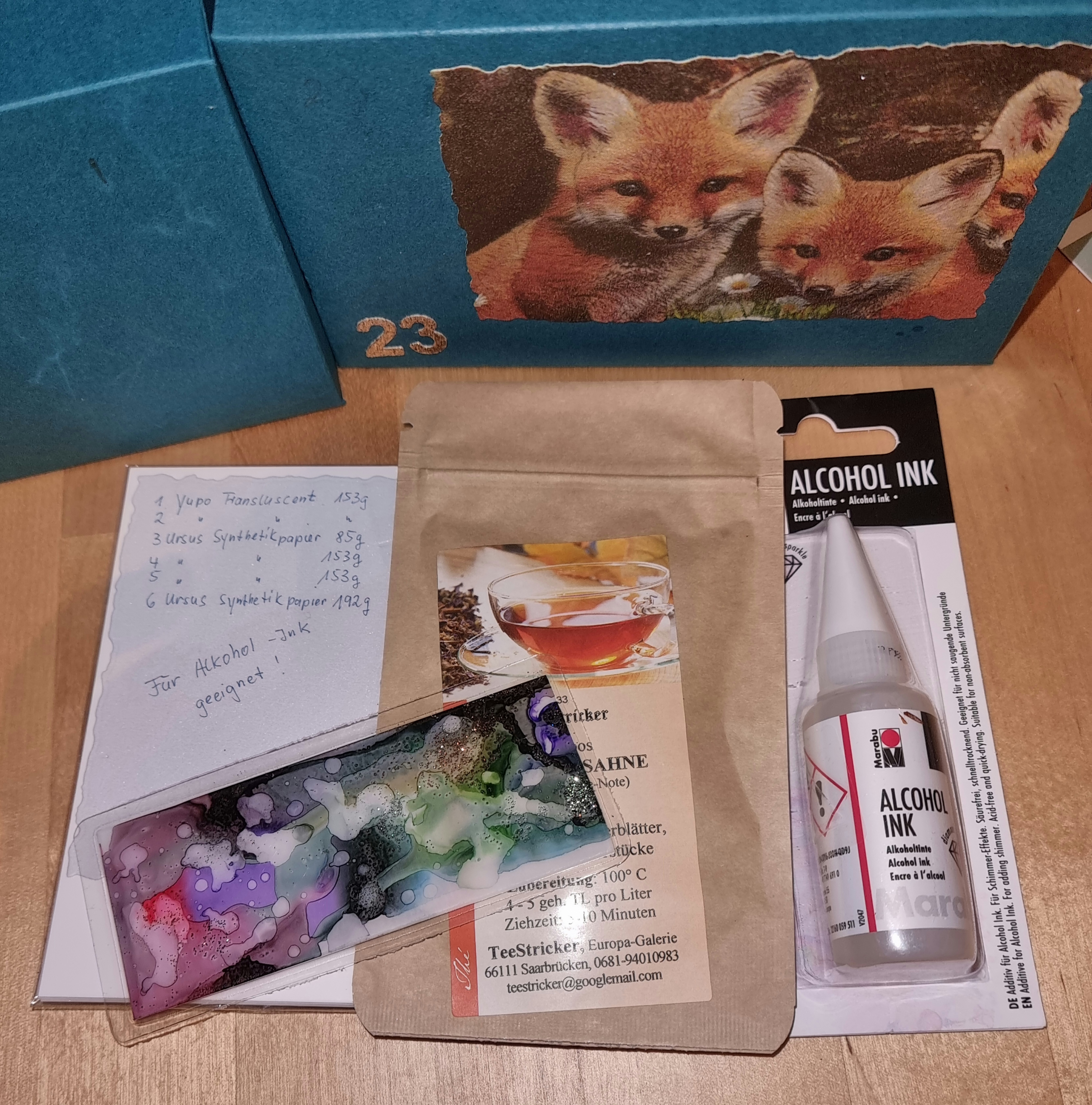 Das Türchen 23 enthielt die Alcohol ink diamant sparkle, also Glitzer kann es definitiv nicht genug geben. Passend dazu gab es unterschiedliche Papiere, die sich für alcohl ink eignen und ein Lesezeichen/Muster wie toll das Endergebnis aussehen kann. Nun bin ich gewappnet und kann es endlich ausprobieren.