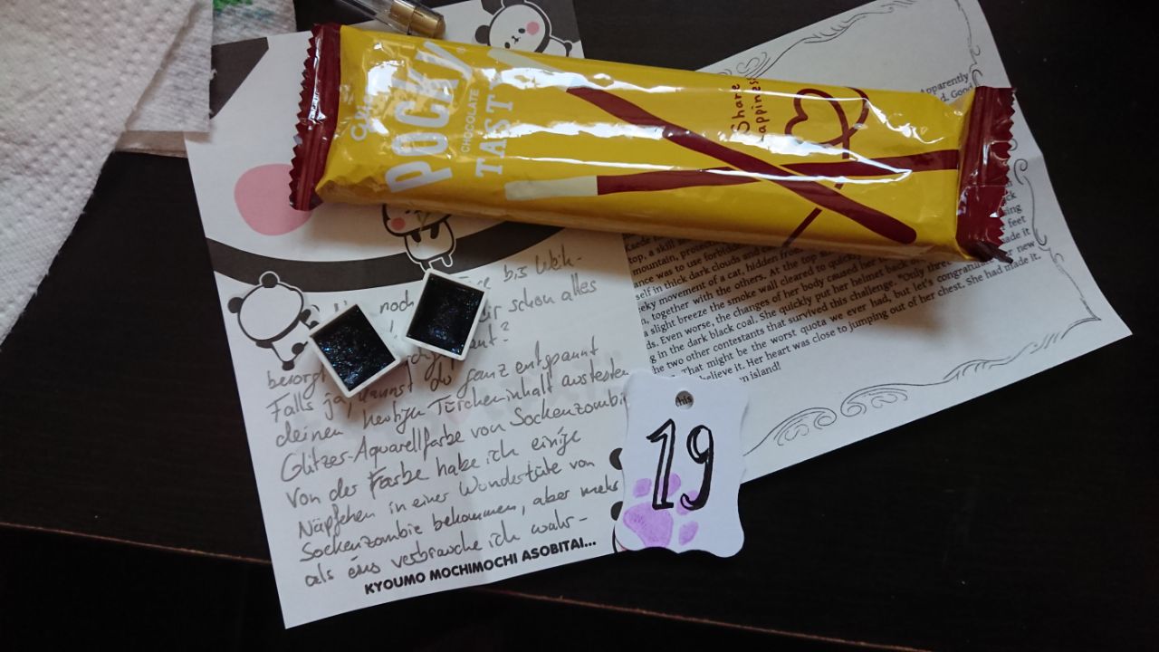 Es gab zwei hübsche Aquarellnäpfchen für mich <3 Ich glaube übrigens, dass du vergessen hast, den Brief fertig zu schreiben, liebe Wichtelmama, was sollte denn nach wahr- kommen? Auf der Rückseite steht nämlich nichts xD Die Pocky muss ich noch kosten, ich komme aktuell nicht einmal wirklich zum Naschen x’D