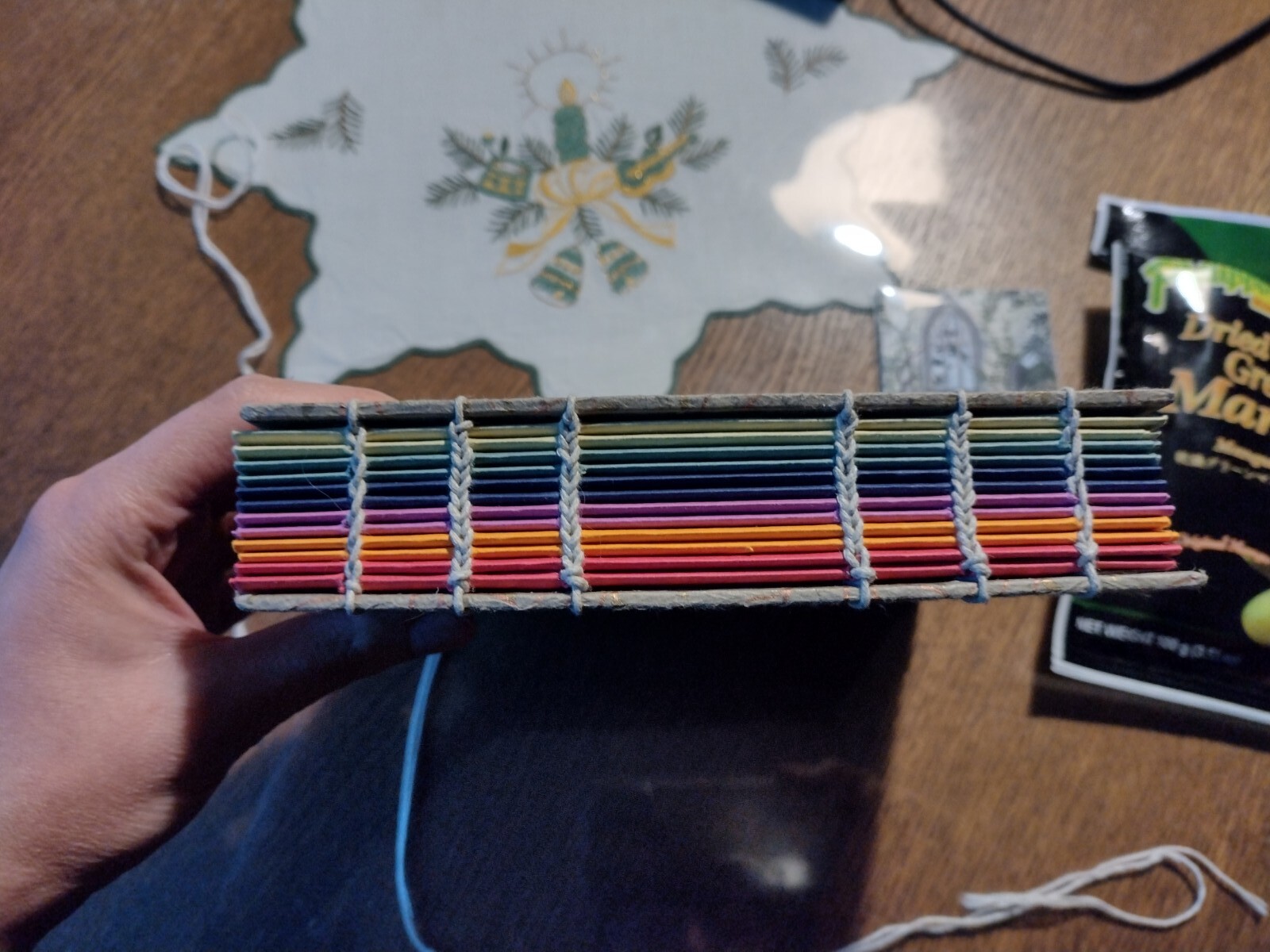 Soeben habe ich mein letztes Türchen geöffnet und möchte natürlich auch darüber berichten. Drinnen war nämlich ein ganz tolles selbstgebundenes Buch mit bunten, aquarelltauglichen Seiten. Die Qualität von dem Buch ist der Hammer. Ich habe auch schon das eine oder andere mal probiert, ein Skizzenbuch selbst zu machen, aber die waren Längen von diesem Buch entfernt. Es hat eine sehr ausgefeilte Bindung, durch die sich das Buch besonders gut aufschlagen lässt, einen total schönen Einband und sogar Schutzecken aus Metall. Vielen vielen Dank dafür!