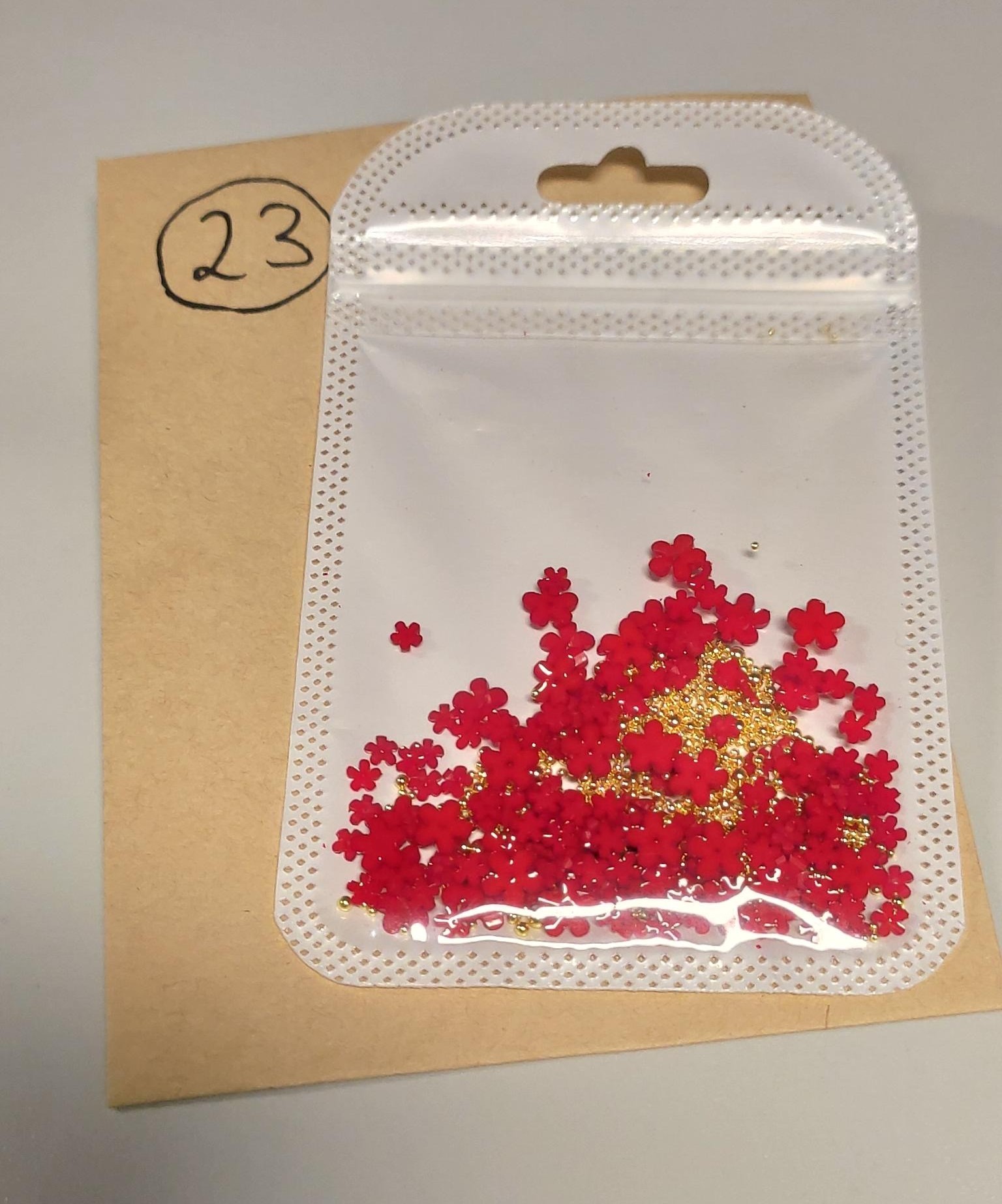 Und in Ellers letztem Päckchen hatte ich Schüttelmaterial und zwar richtig schöne, knallrote Blüten und goldene Mikroperlen.