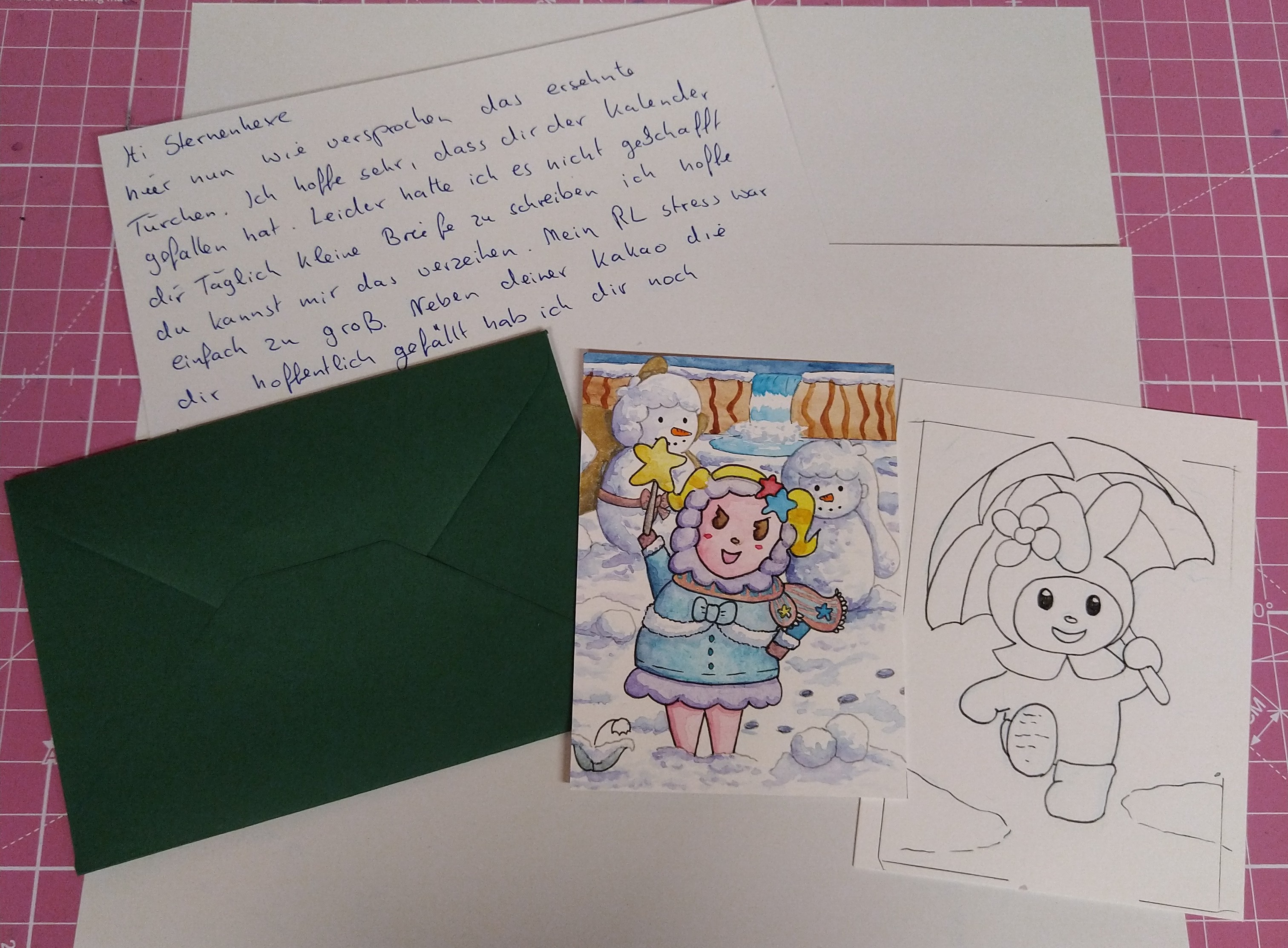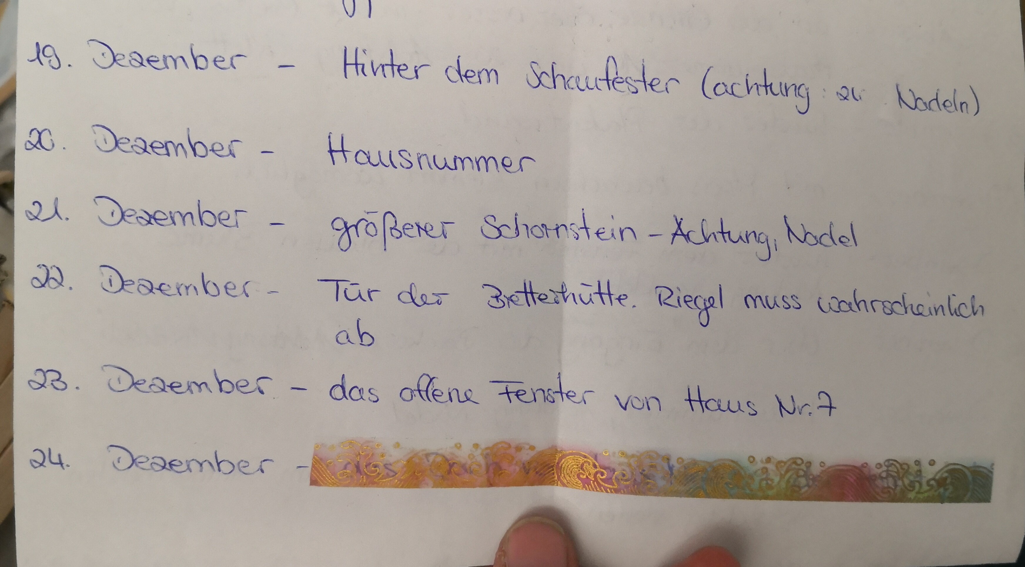 Ich hoffe, du bist inzwischen an den Kleber rangekommen (ich schwöre dir, dass ich das getestet hatte, bevor ich den Kalender losgeschickt habe! Das muss vom Geschüttel und Geruckel beim Versand gekommen sein!)