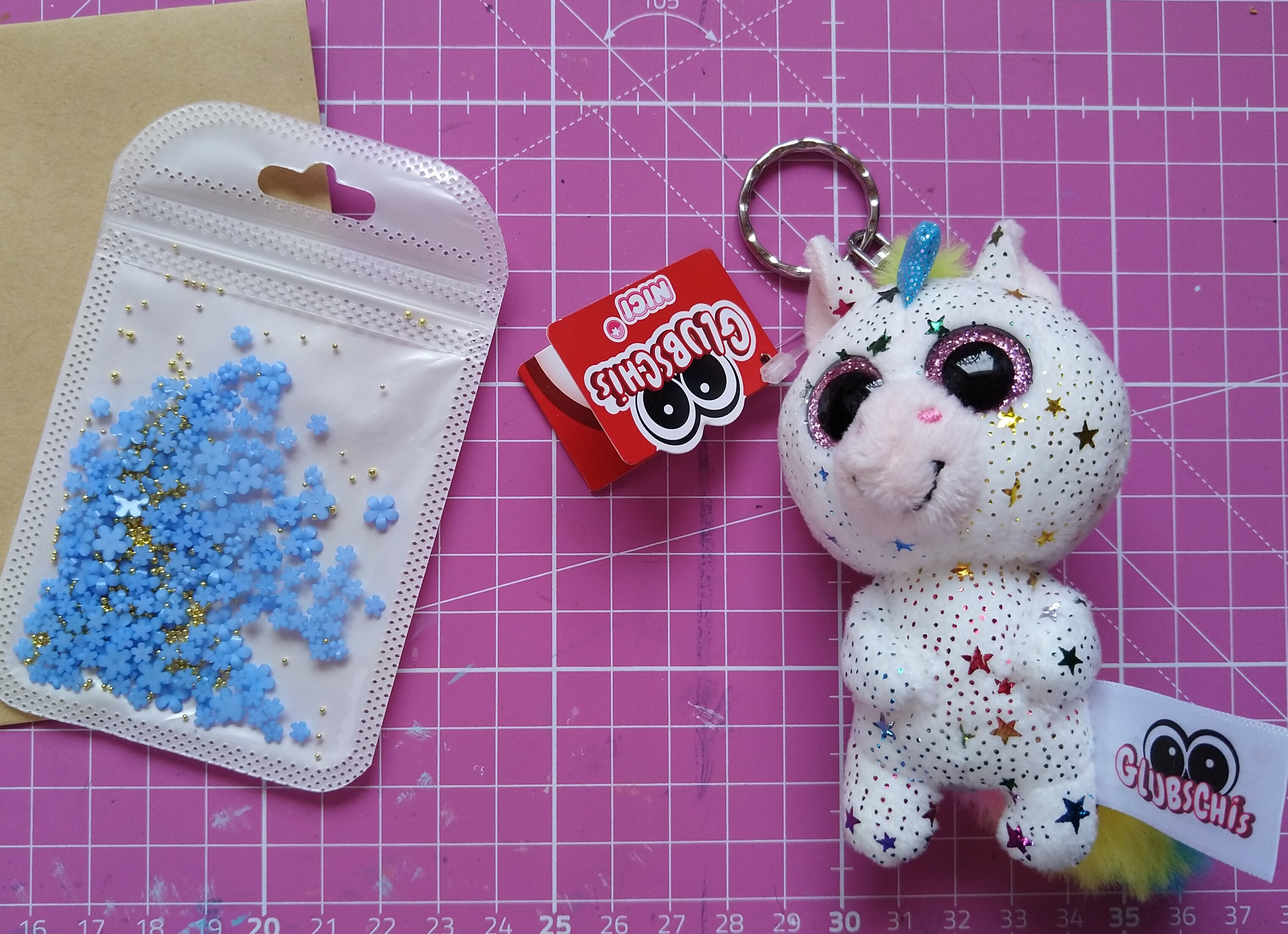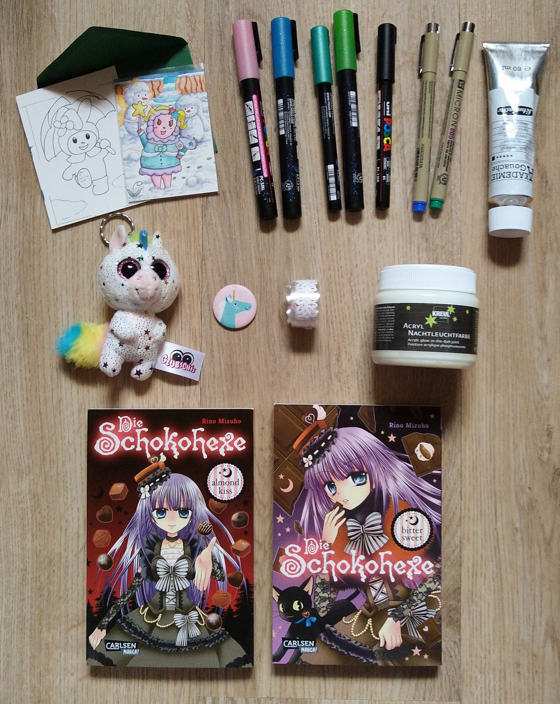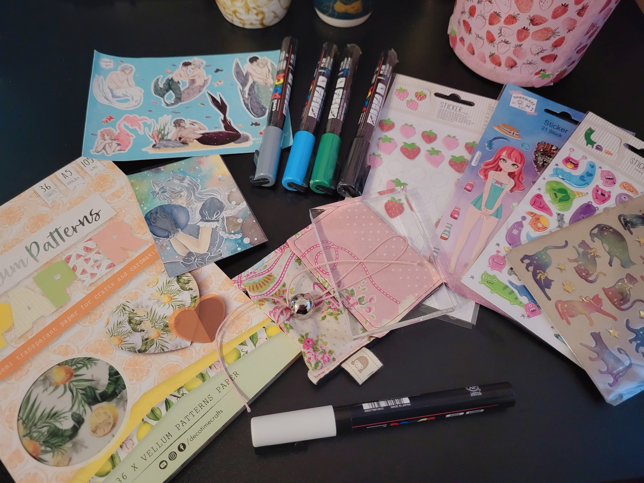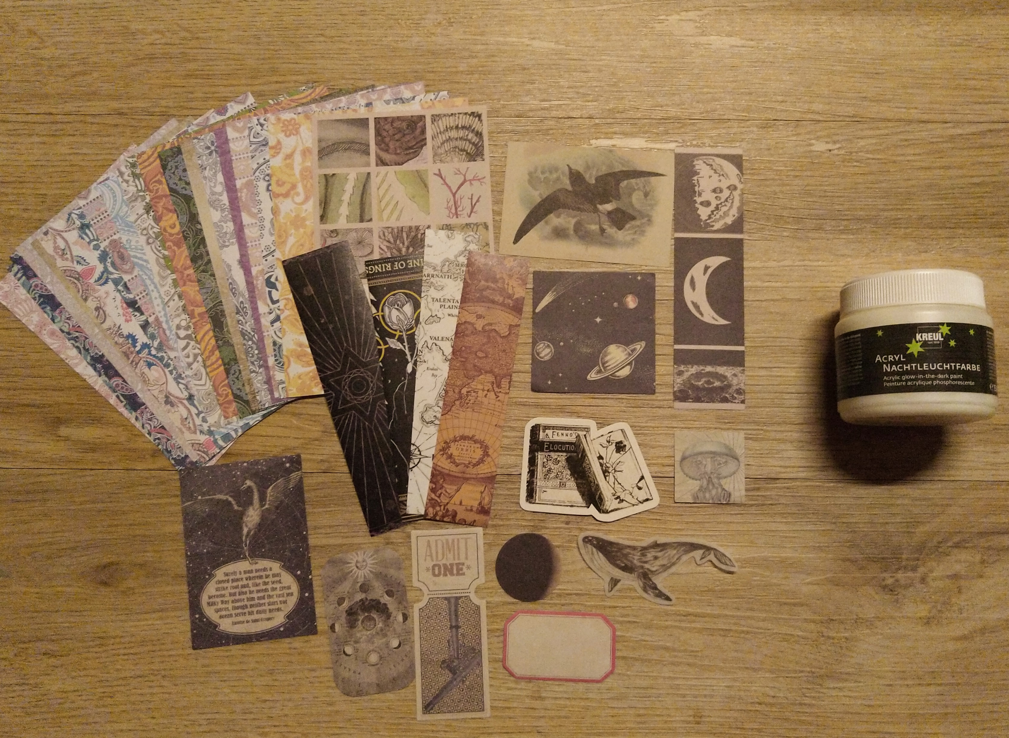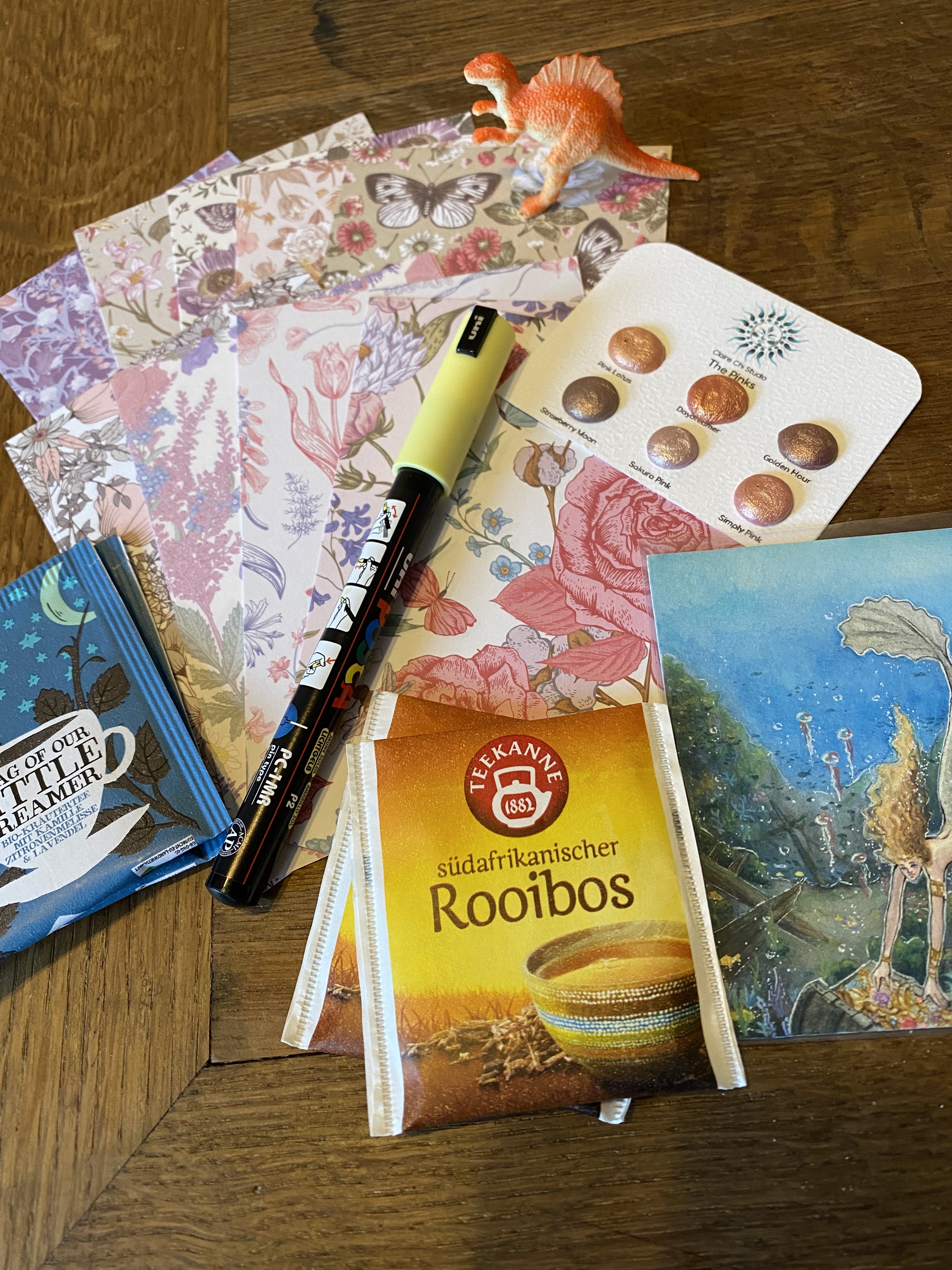 Dann eine weitere Dinofigur (die inzwischen ihren Platz im Blumentopf einer Alocasie eingenommen hat), ein Lichtgelber Posca - Motiv mit Glühwürmchen incoming, noch ein Set Motivpapier (es ist kitschig, ich liebs), Aquarelldots in Schimmer-Rosatönen und zu guter Letzt eine Karte mit meiner Treasure.