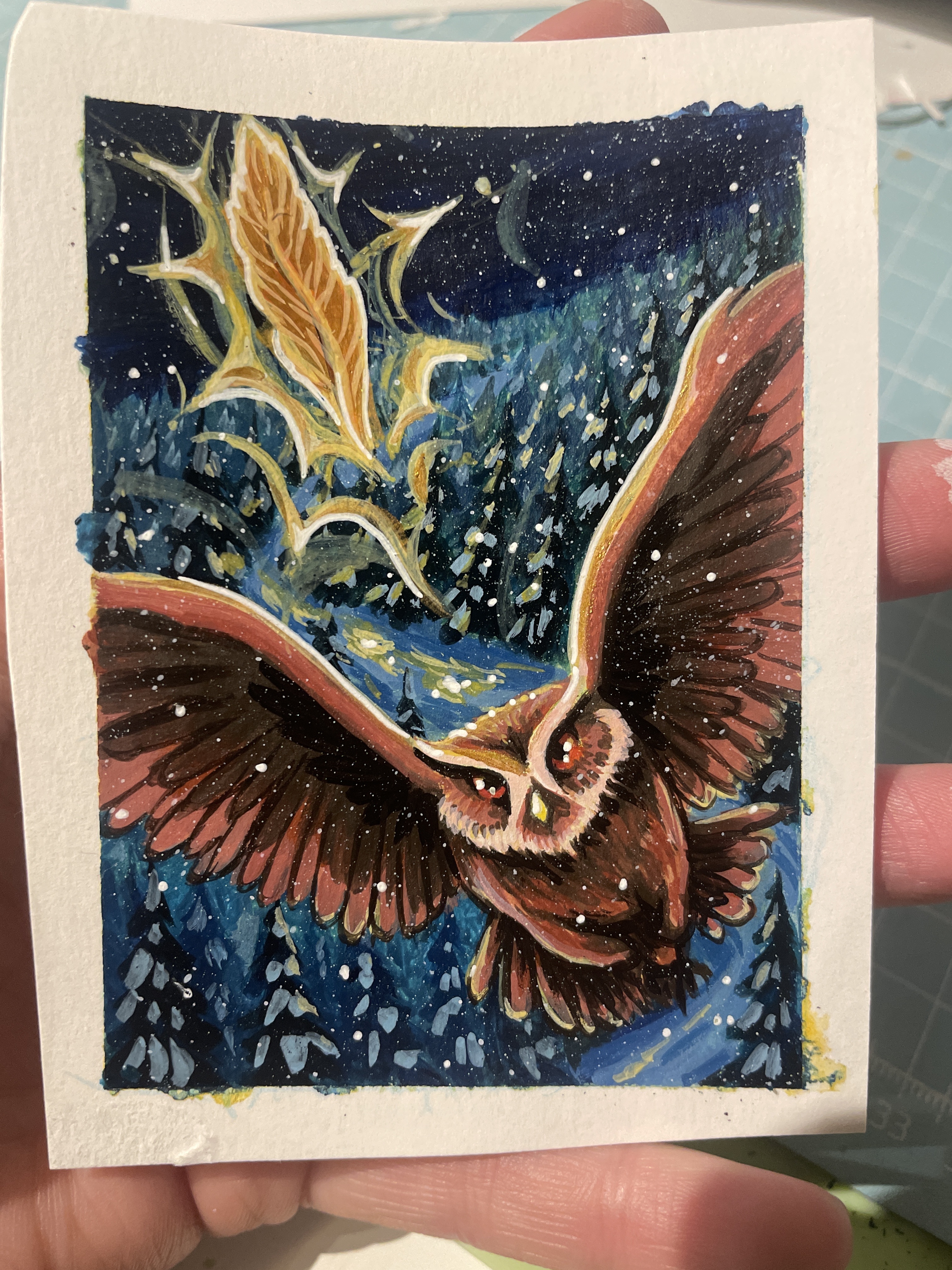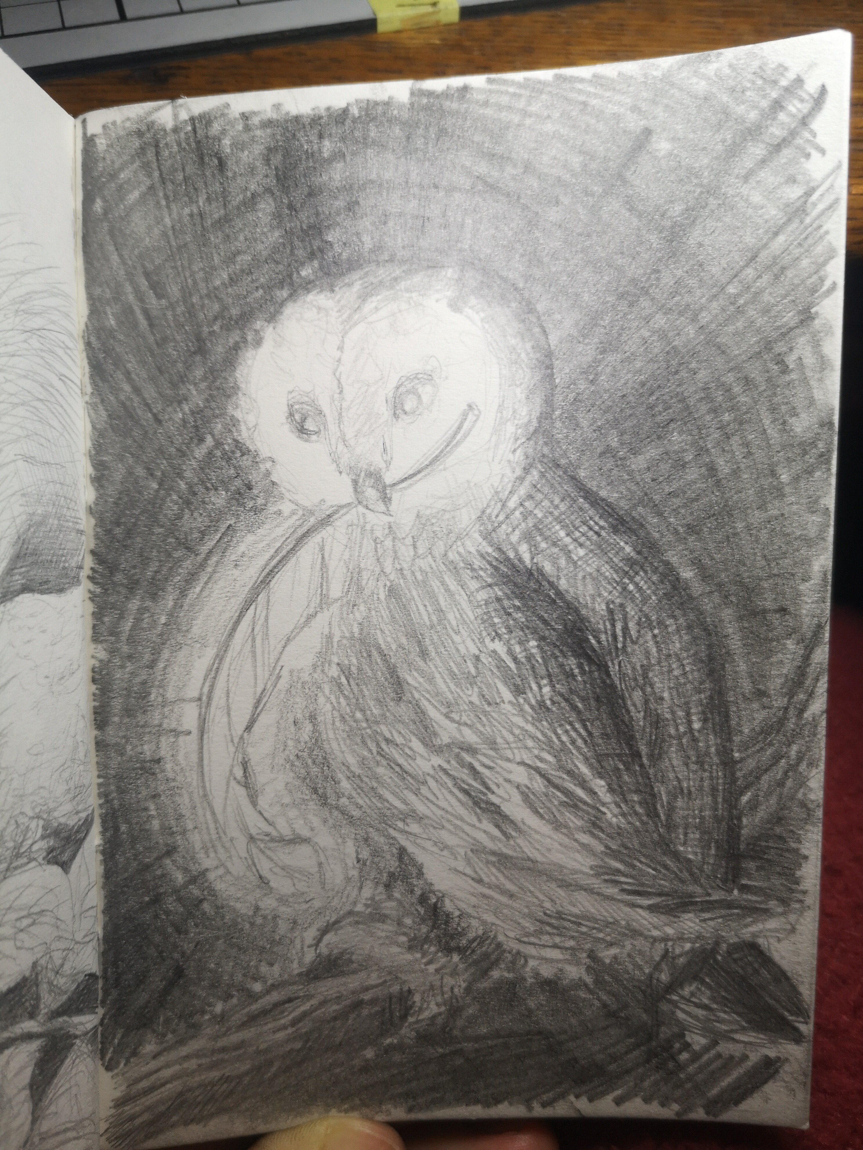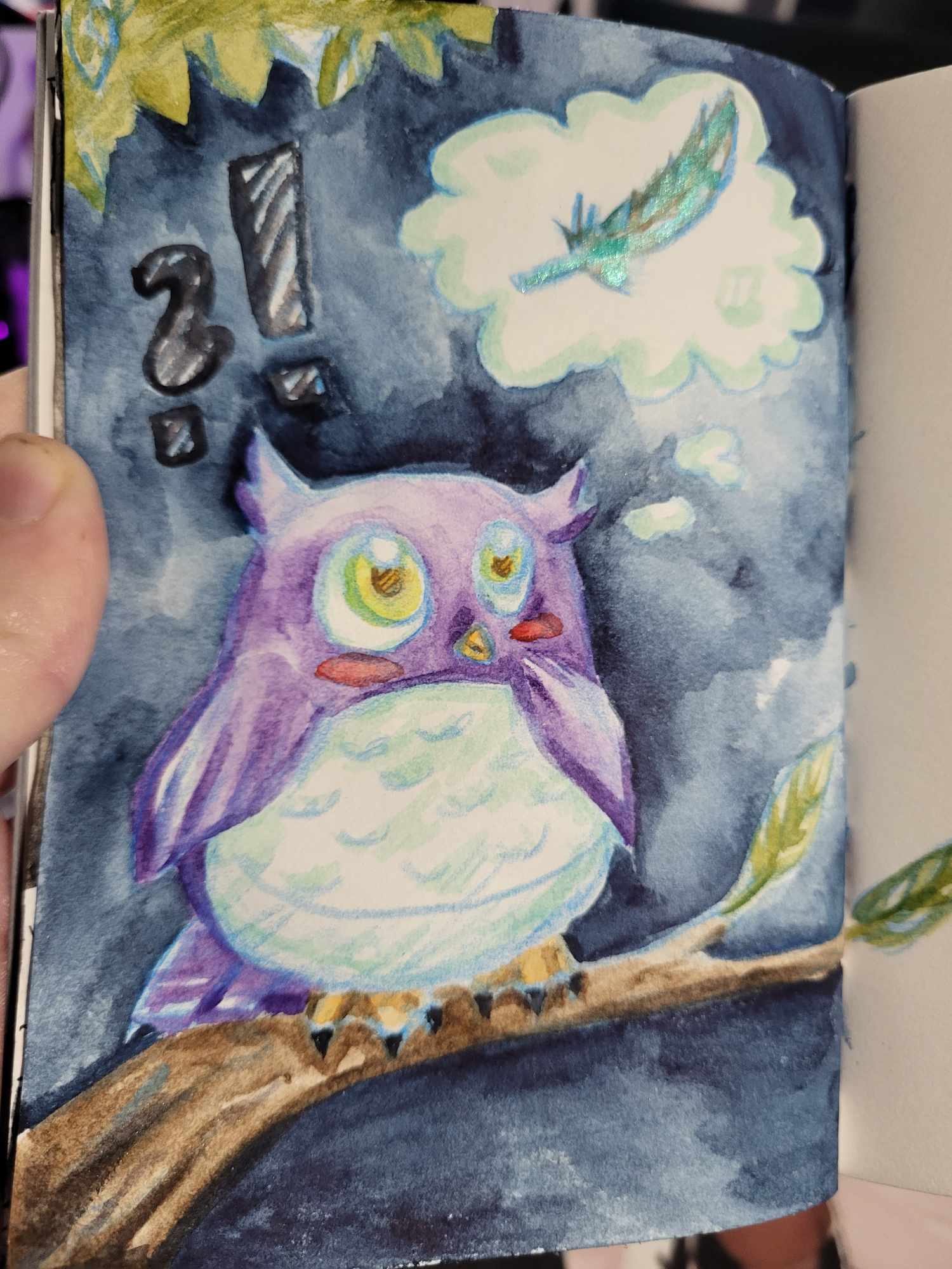 Oh, und hier ist mein Bild (nun ja, meine schnelle Skizze) zum Prompt des heutigen Tages… Ich bin auch nicht sooooo nah an der “Vorlage” geblieben (@elanor89 du hast Gesellschaft), bei mir hat die funkelnde Feder stumpf das ersetzt, was bei Klischee-Eulenbildern der Mond ist. XD