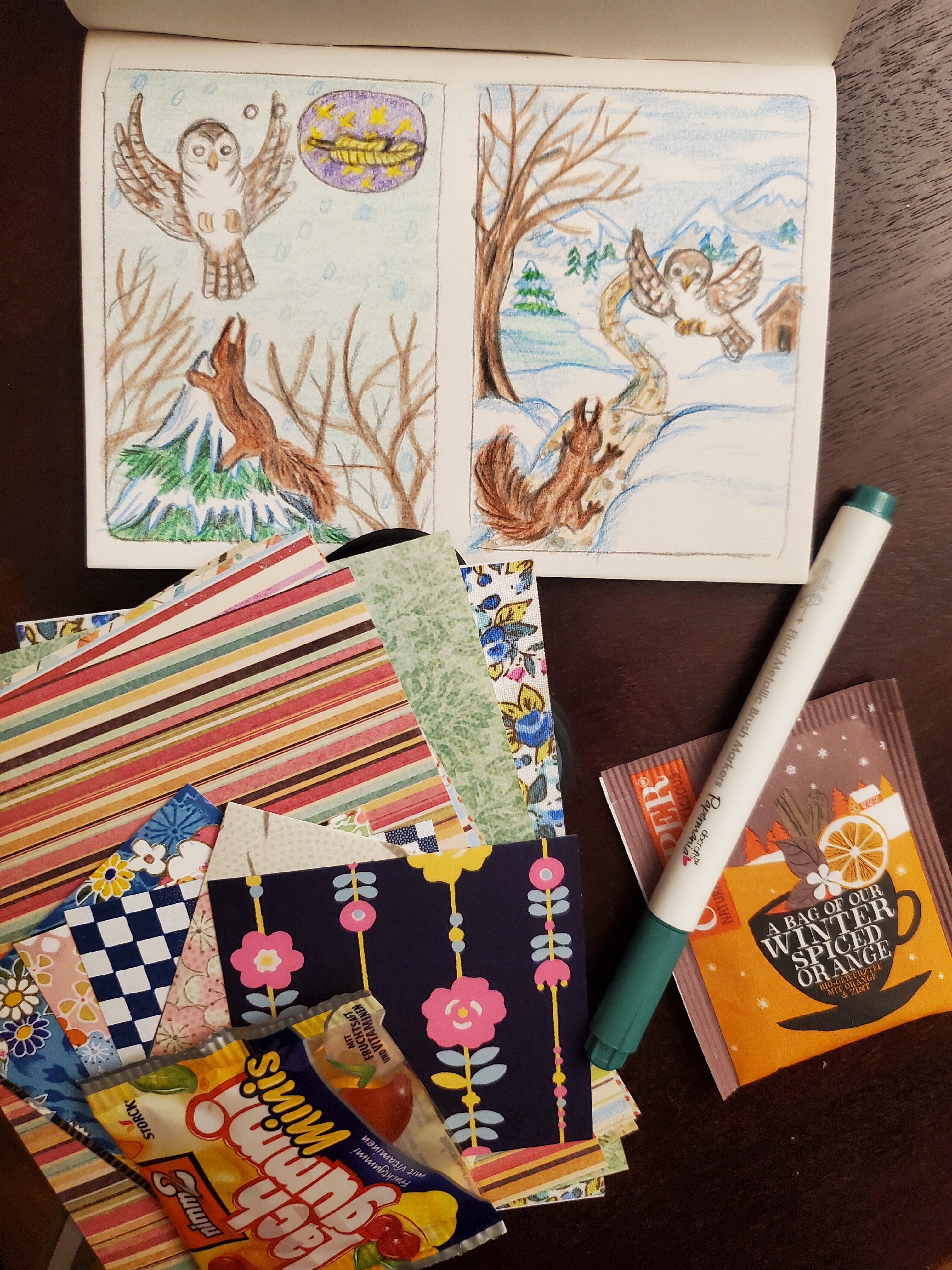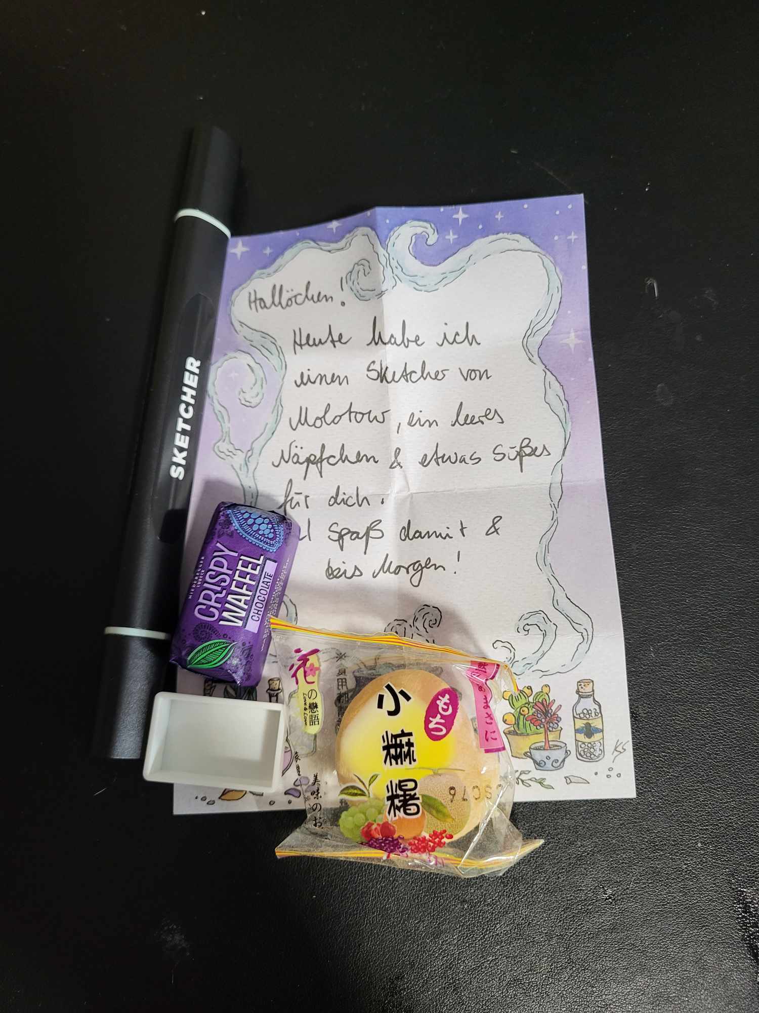 Äh, ich merke gerade, dass der Knetradierer es nicht mit aufs Bild geschafft hat - den hatte ich sofort beim Auspacken in meine Aquarell-Unterwegs-Tasche weggeräumt und vergessen fürs Foto wieder rauszuholen, sorry @Eleisis!