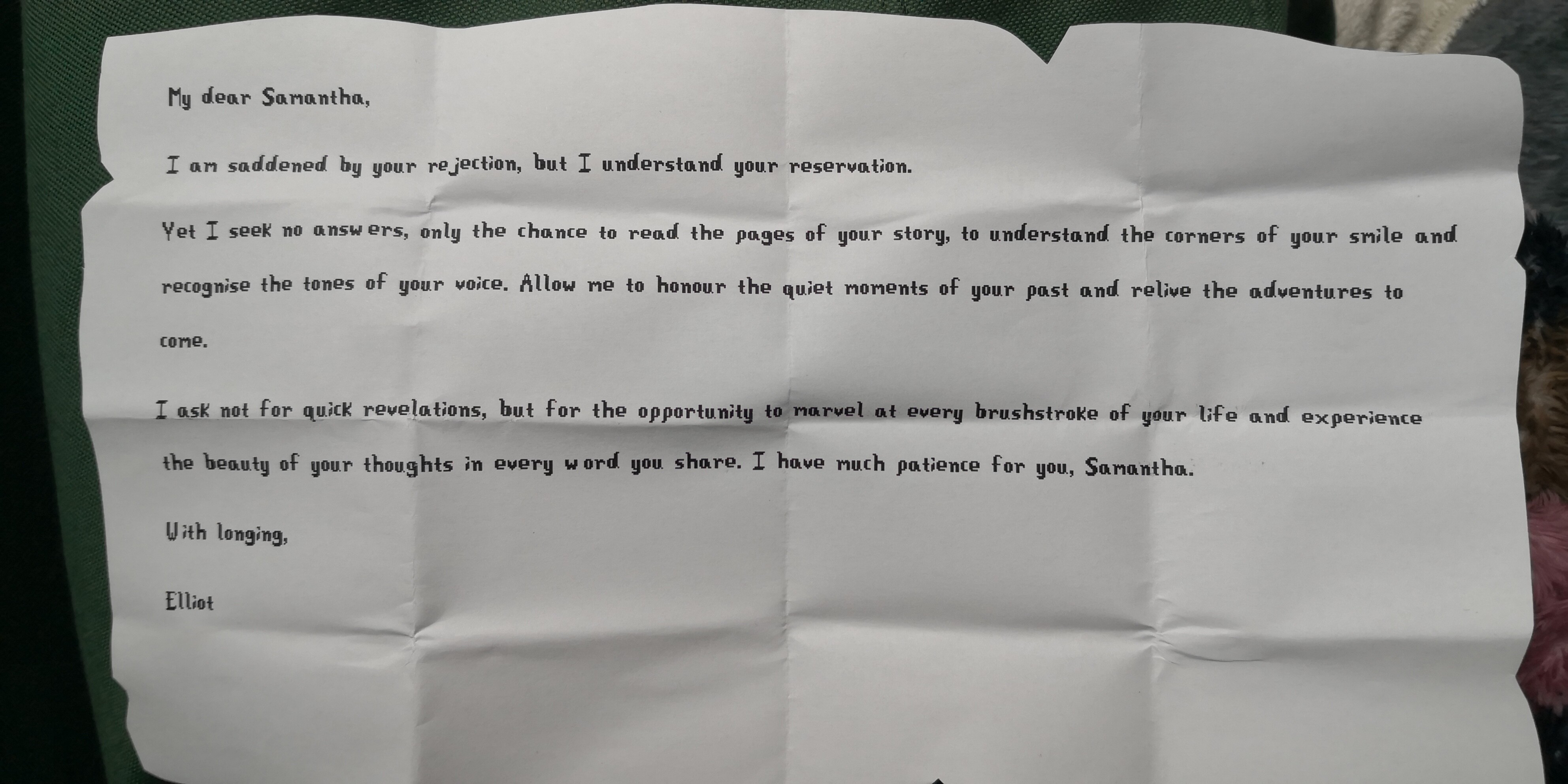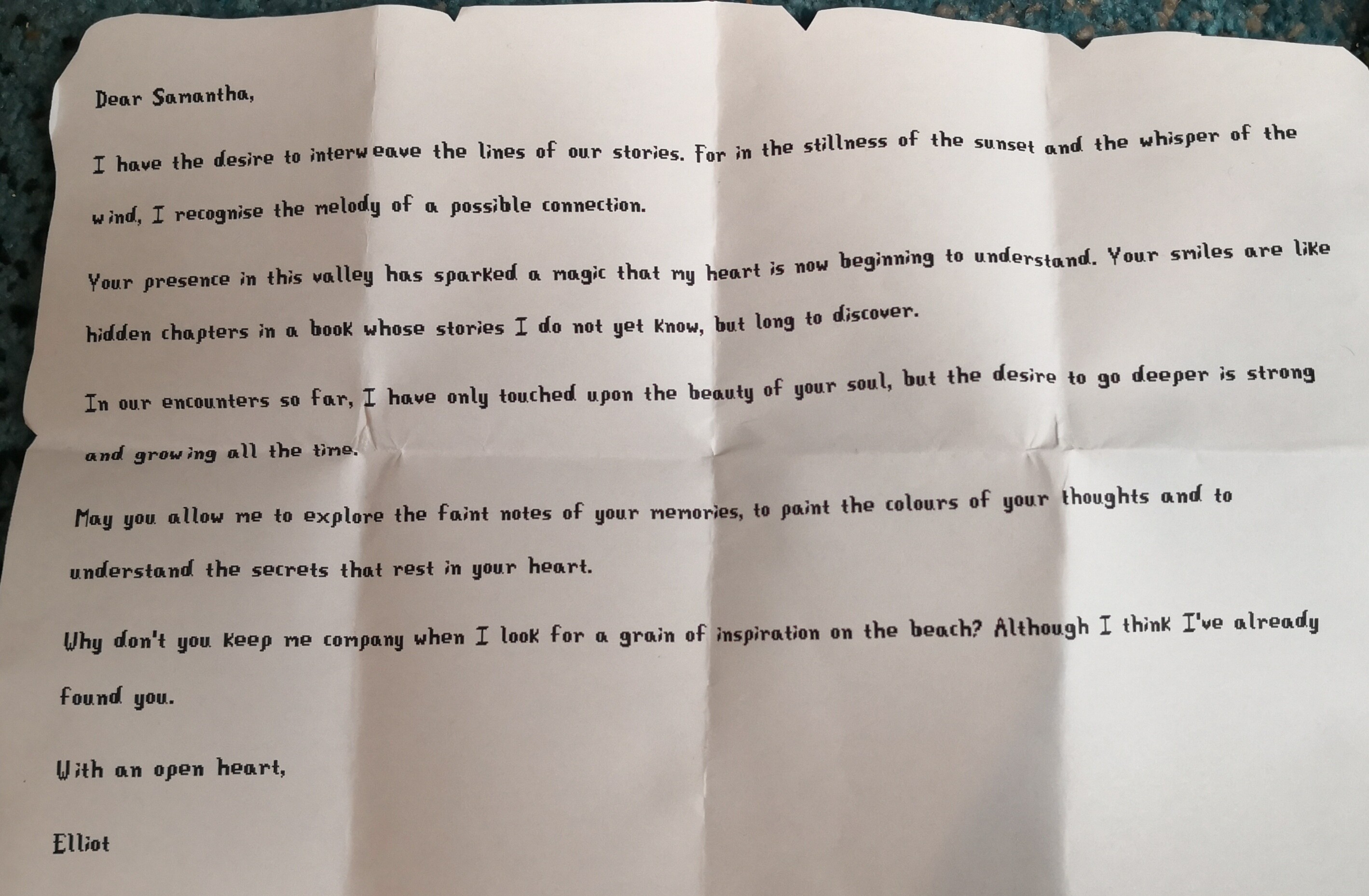 Meine Wichtelmama hat mich im Vorfeld gewarnt, dass die Briefe richtig kitschig werden. Ich behaupte einfach mal, sie hat Elliotts Tonfall einfach sehr gut getroffen.