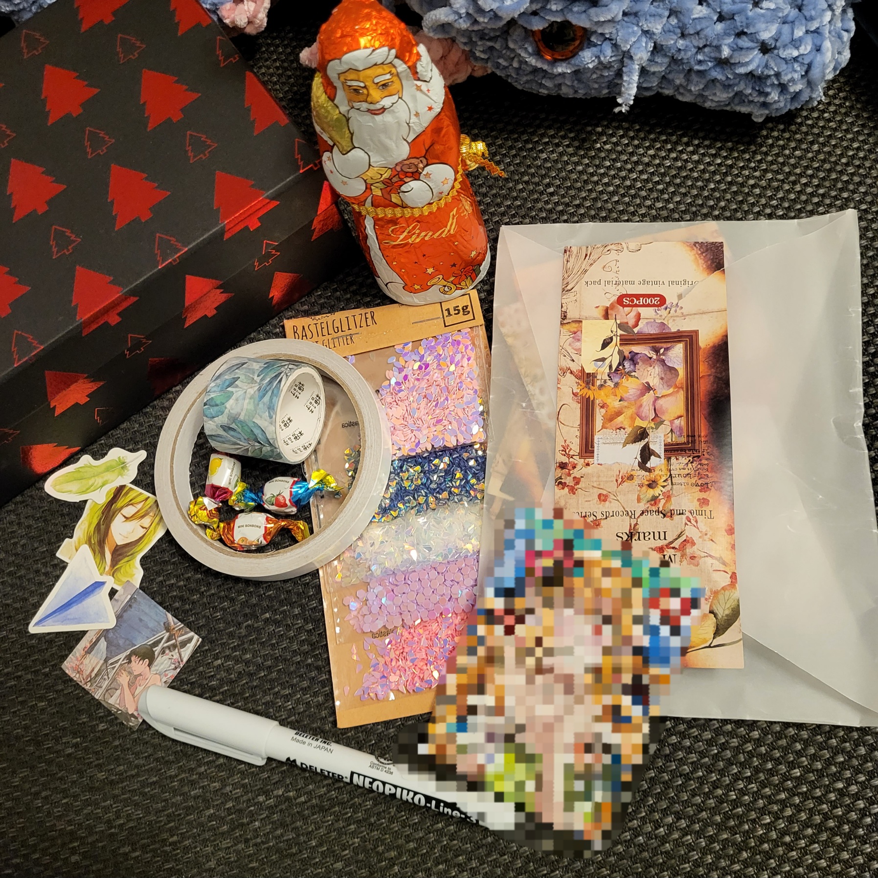Zudem wurde ich mit einer hübschen Box gefüllt mit washitape, Glitzerstreu , einem riesigen Vintage Bastelset, einem Schoki Nikolaus und einem grauen Neo piko überrascht