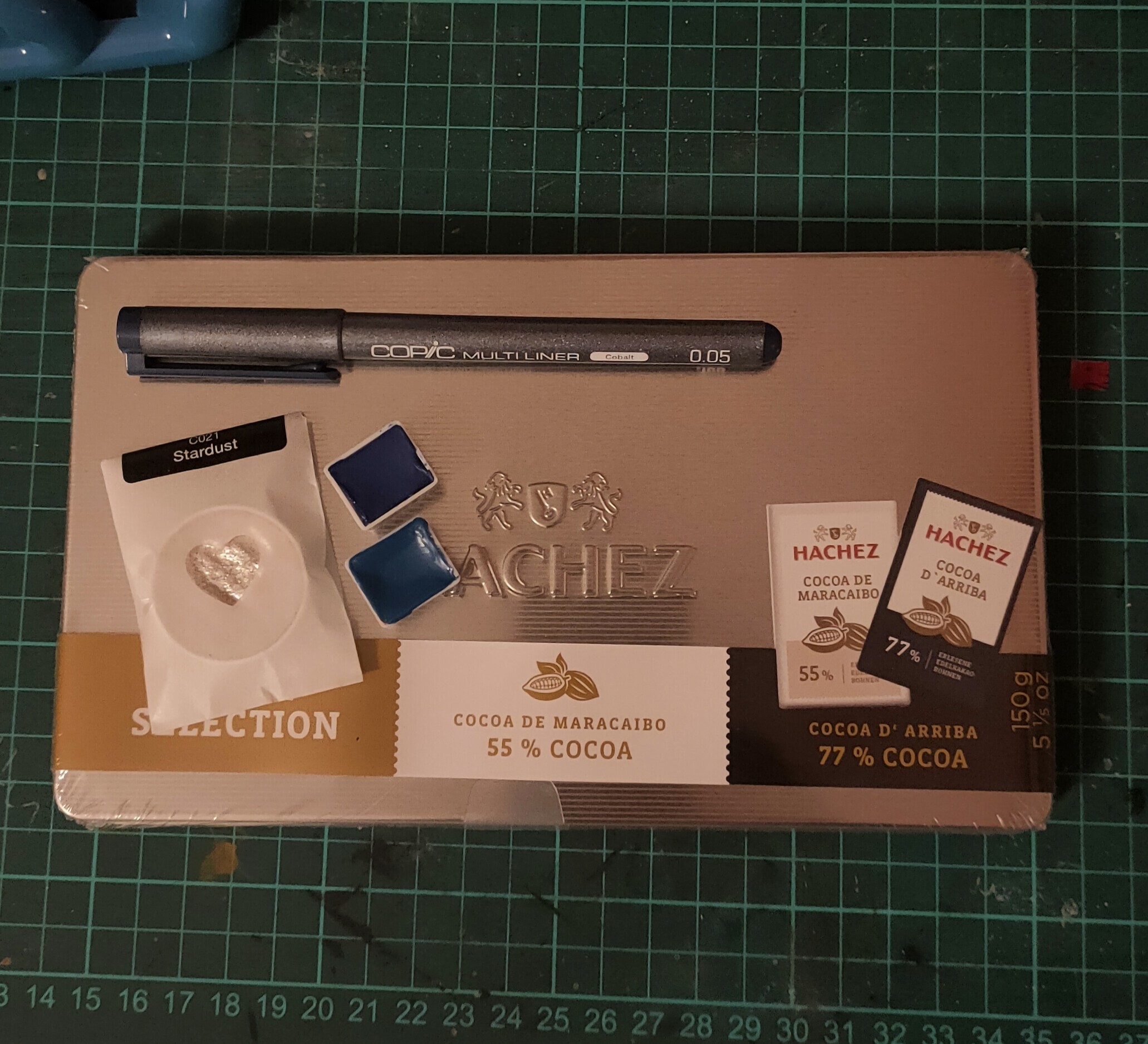 Jep, diese Dosen sind sehr praktisch, es passen exakt 72 halbe Aquarellnäpfchen rein… Benutze die selber. Der Schokolade passieren dann halt irgendwelche fürchterlichen Dinge. XD