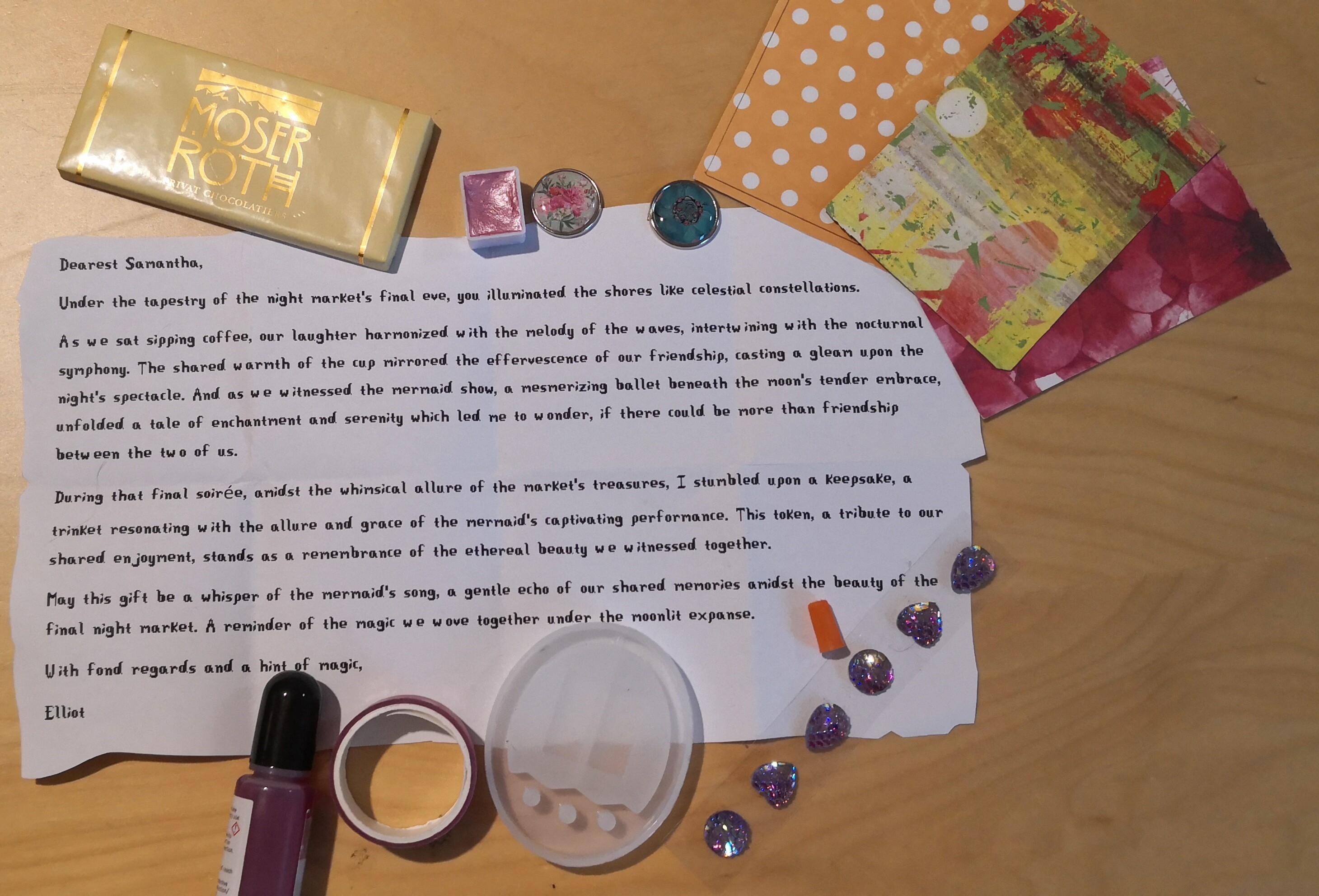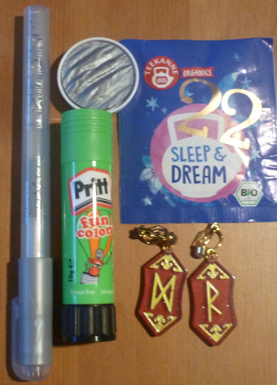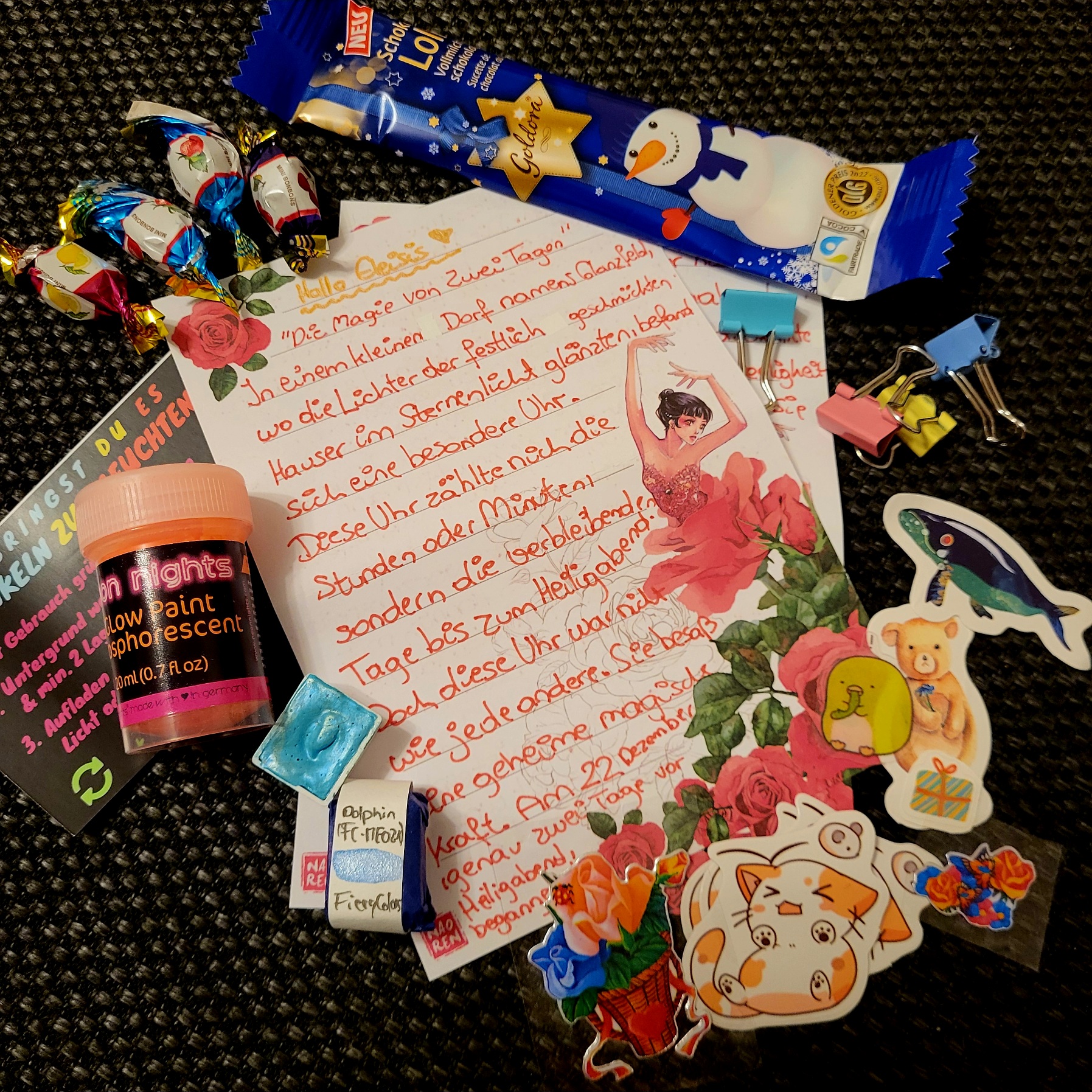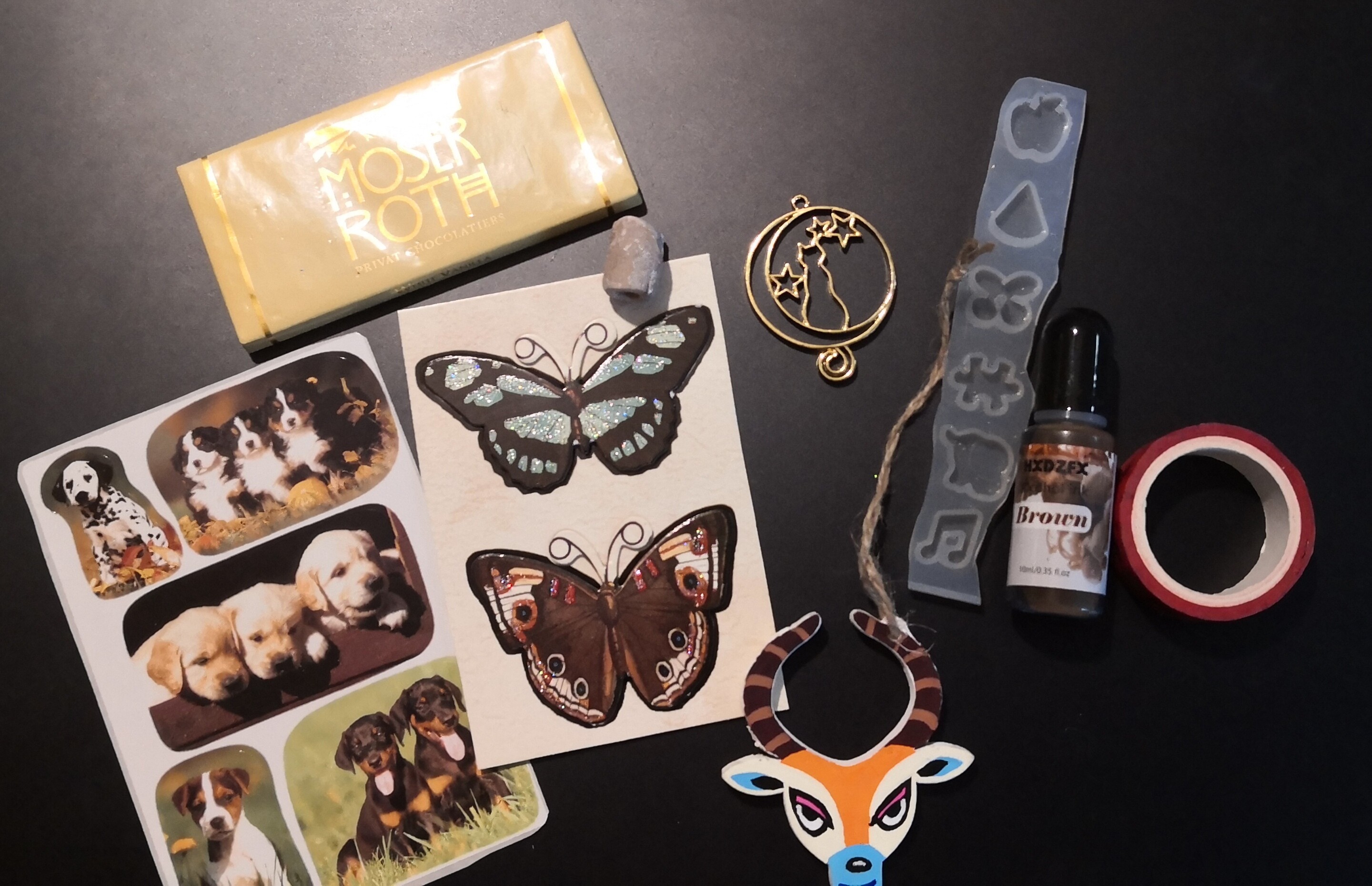 Heute gab es eine weitere Farbe, eine Ink, glitzernde Sticker und eine Gießform für einen Anhänger in Tamagotchiform. Dazu Zuschnitte von Motivpapier, Washi und Dekokram. Liebe Wichtelmama, vermisst du die Kappe eines (Sekunden-)klebers? (Orange Kappe rechts unten über den Aufklebern.)