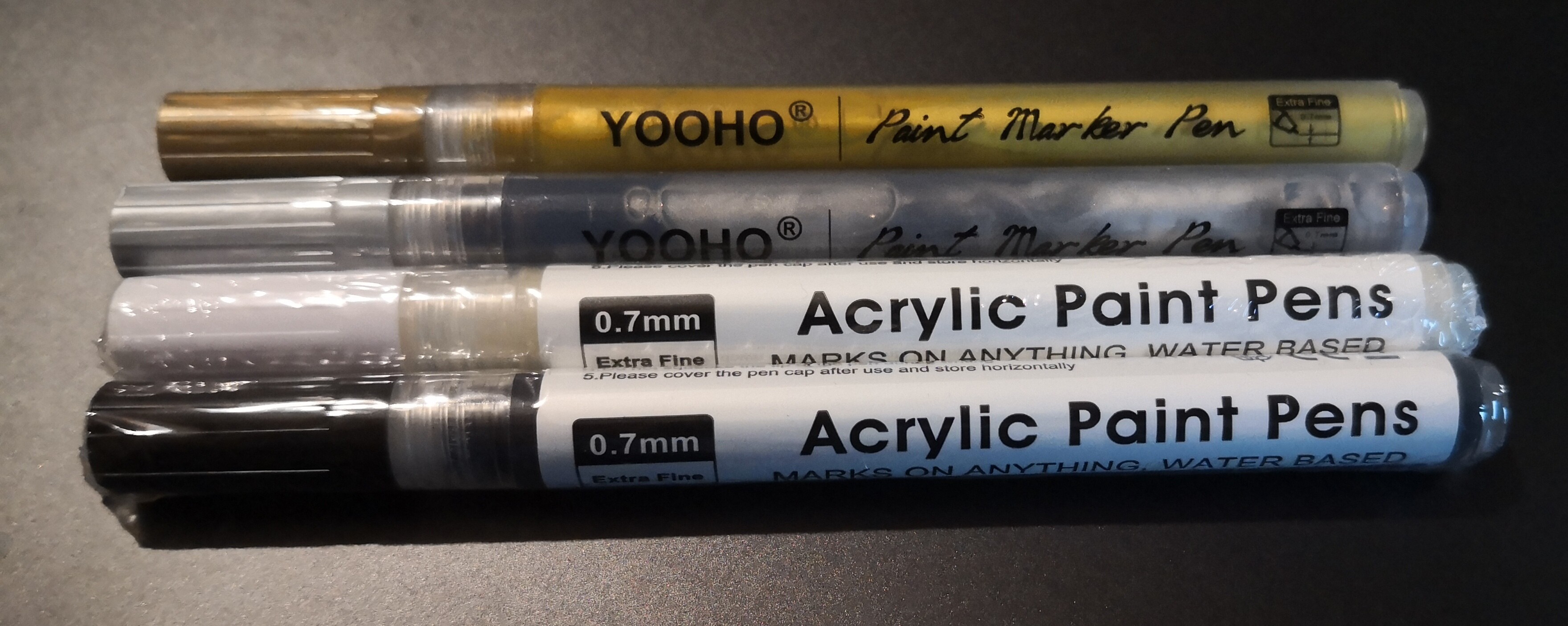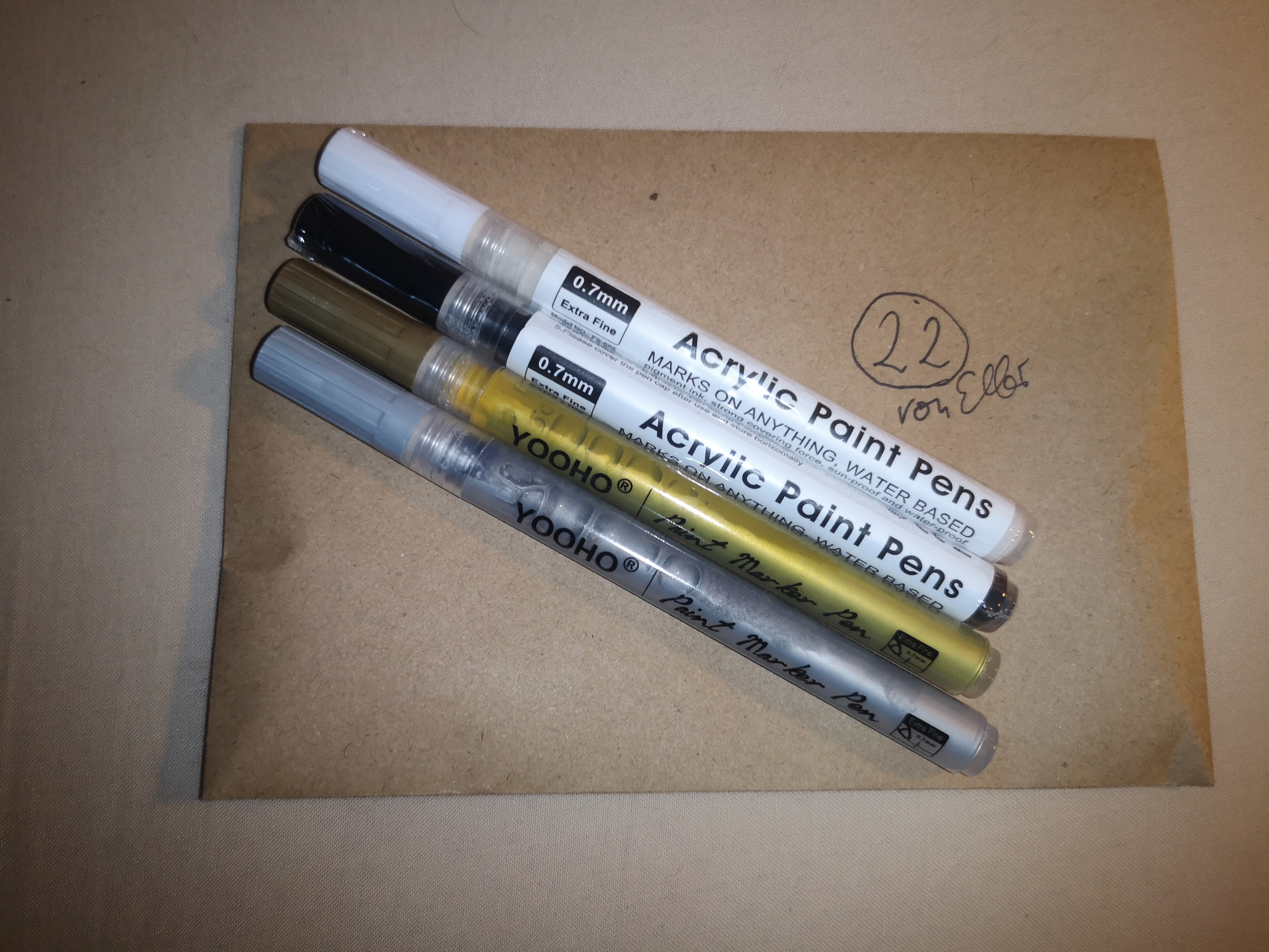 Für mich gab es heute ebenfalls vier Paint Marker (ich verzichte mal auf ein Foto, sieht man ja schon bei den andern^^) in schwarz, weiß, gold und silber :D Habe zwar schon einen goldenen und silbernen Posca, aber die sind dicker, jetzt hab ich also noch was für kleinere Details