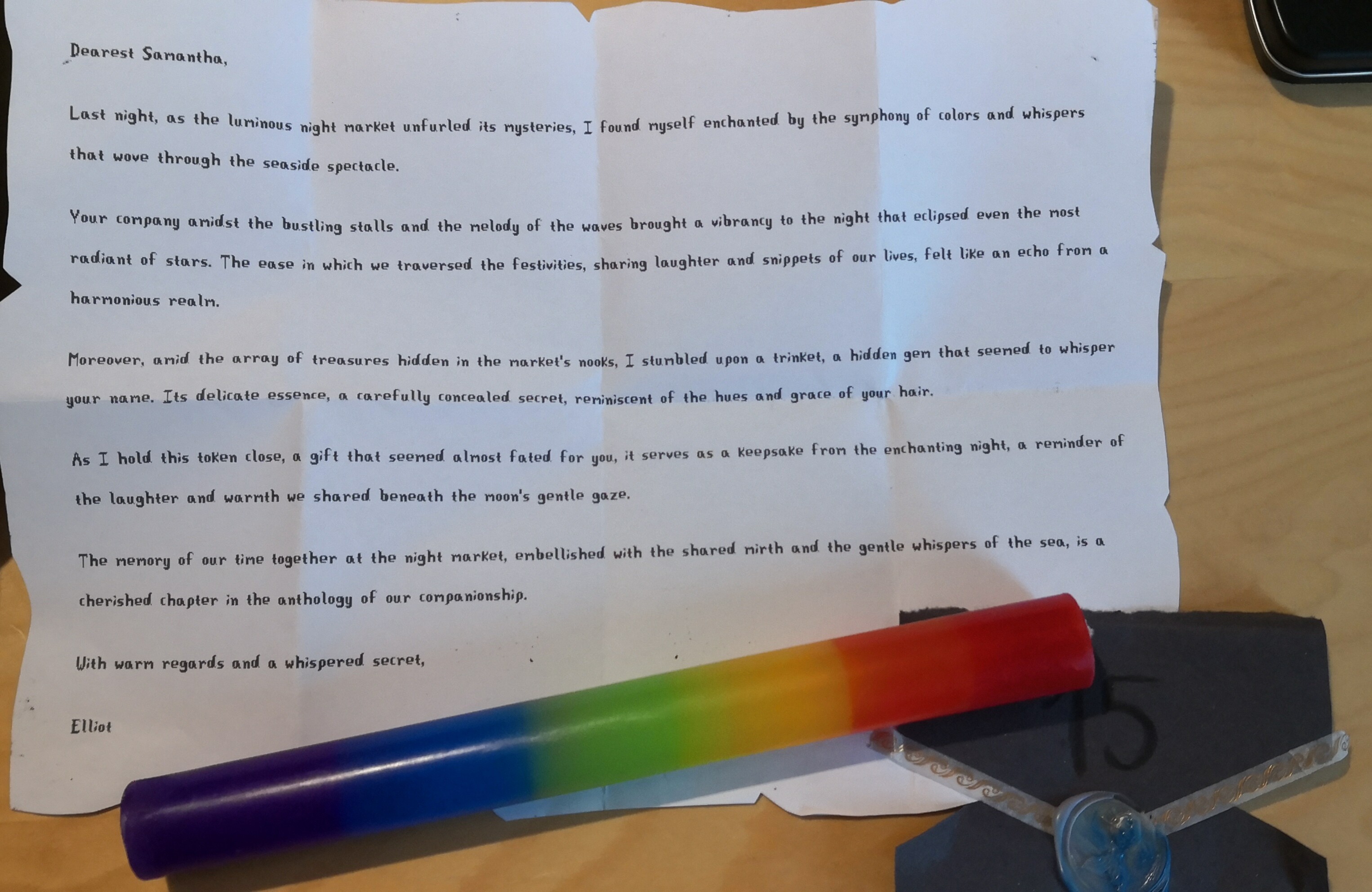 Nach dem Text musste ich direkt an eine Prismatic Shard denken, die Kerze passt farblich perfekt. Ich muss allerdings mal sehen, was ich damit mache. Ich zünde nicht gerne Kerzen an und besitze deshalb auch keine Kerzenständer. Bislang liegt sie also in der Vitrine, damit die Katzen sie nicht runter schmeißen.