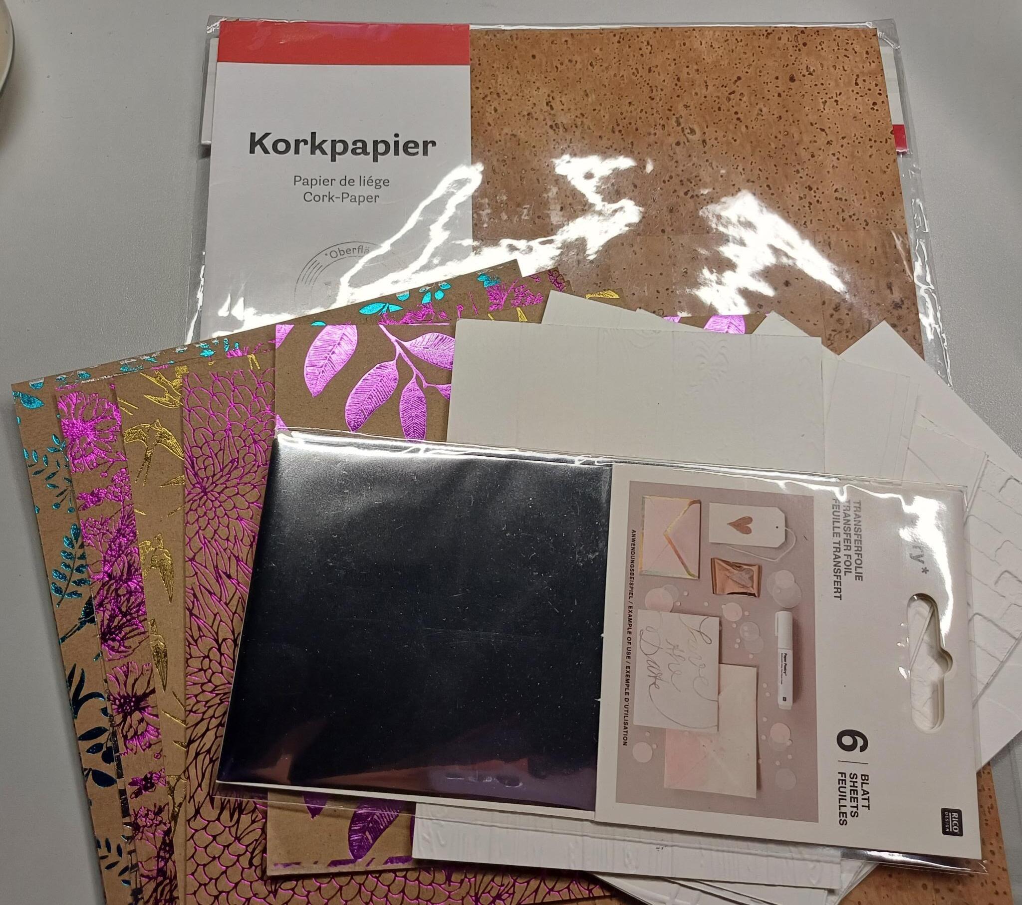 In Tür 20 gab es für mich einige schöne Motivpapiere, ein Päckchen Korkpapier, geprägte Papiere, Transferfolie und viele schöne Stanzen <3
