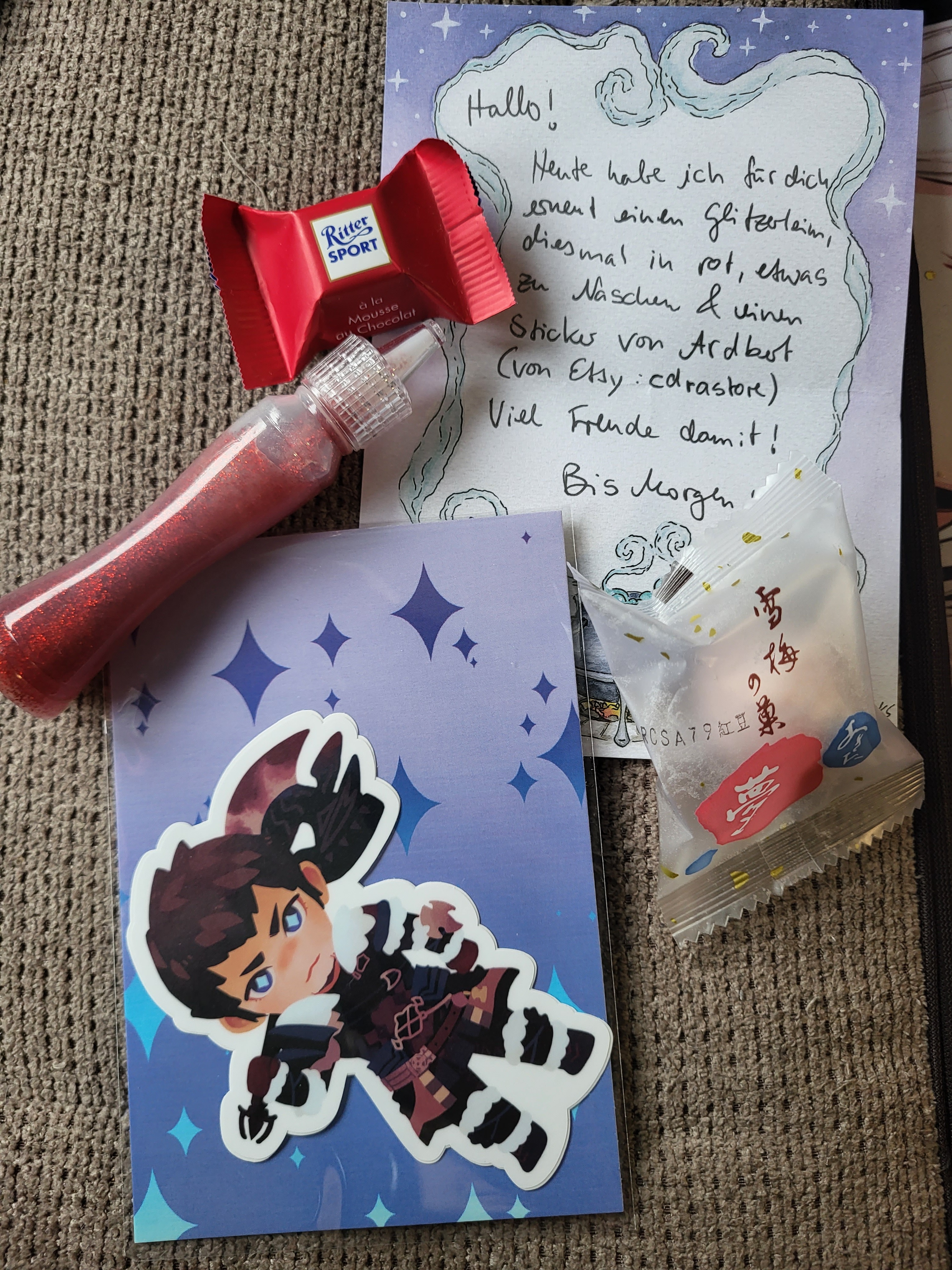 Einmal gab es leckere Naschereien und ein weiterer wirklich wunderschöner Glitzerkleber. Mein Highlight von diesem Türchen war jedoch der Ardbert Sticker!!!