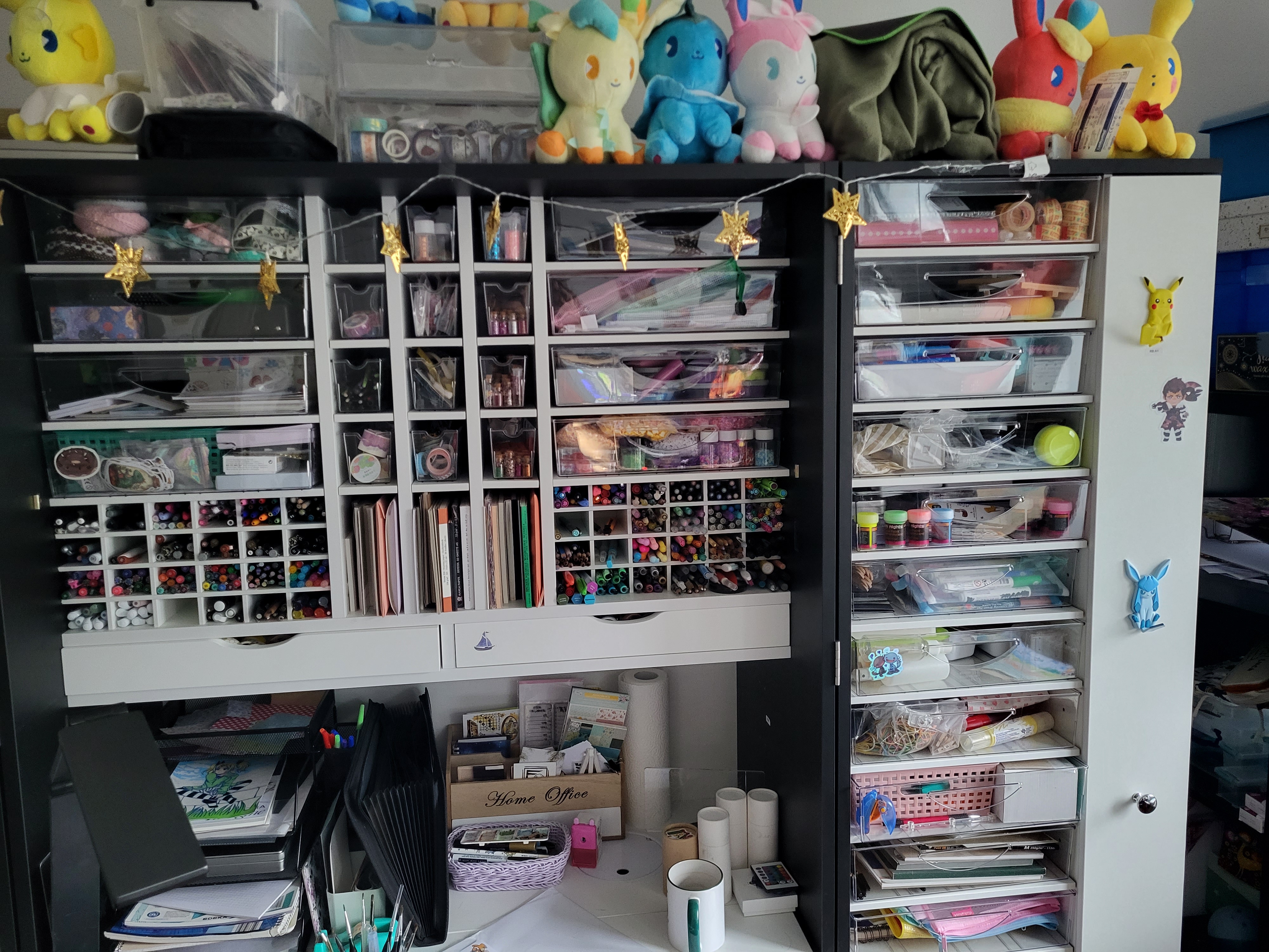 Gleichzeitig habe ich mir überlegt wo ich ihn hinkleben könnte wo ich am meisten von habe. Da kam mir mein Bastelschrank in den Sinn. So schaut er mir immer beim zeichnen zu.