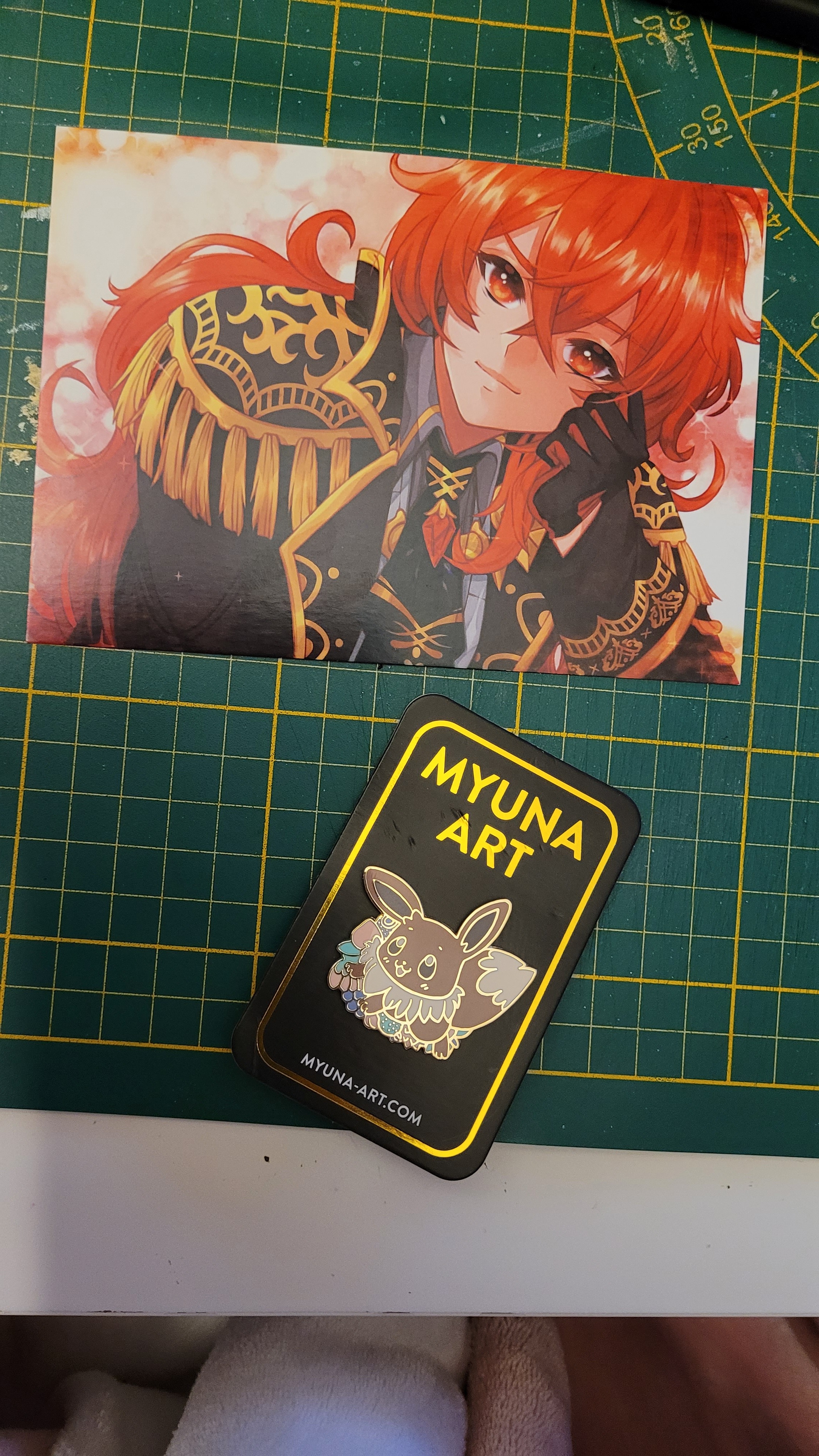 Einen wunderschönen Evoli pin und eine diluc Postkart. Vielen Dank liebe Wichtelmama (die mir heute einen Hinweis zu Ihrer Identität gegeben hat, da muss ich mal die Profile dahingehend stalken gehen)