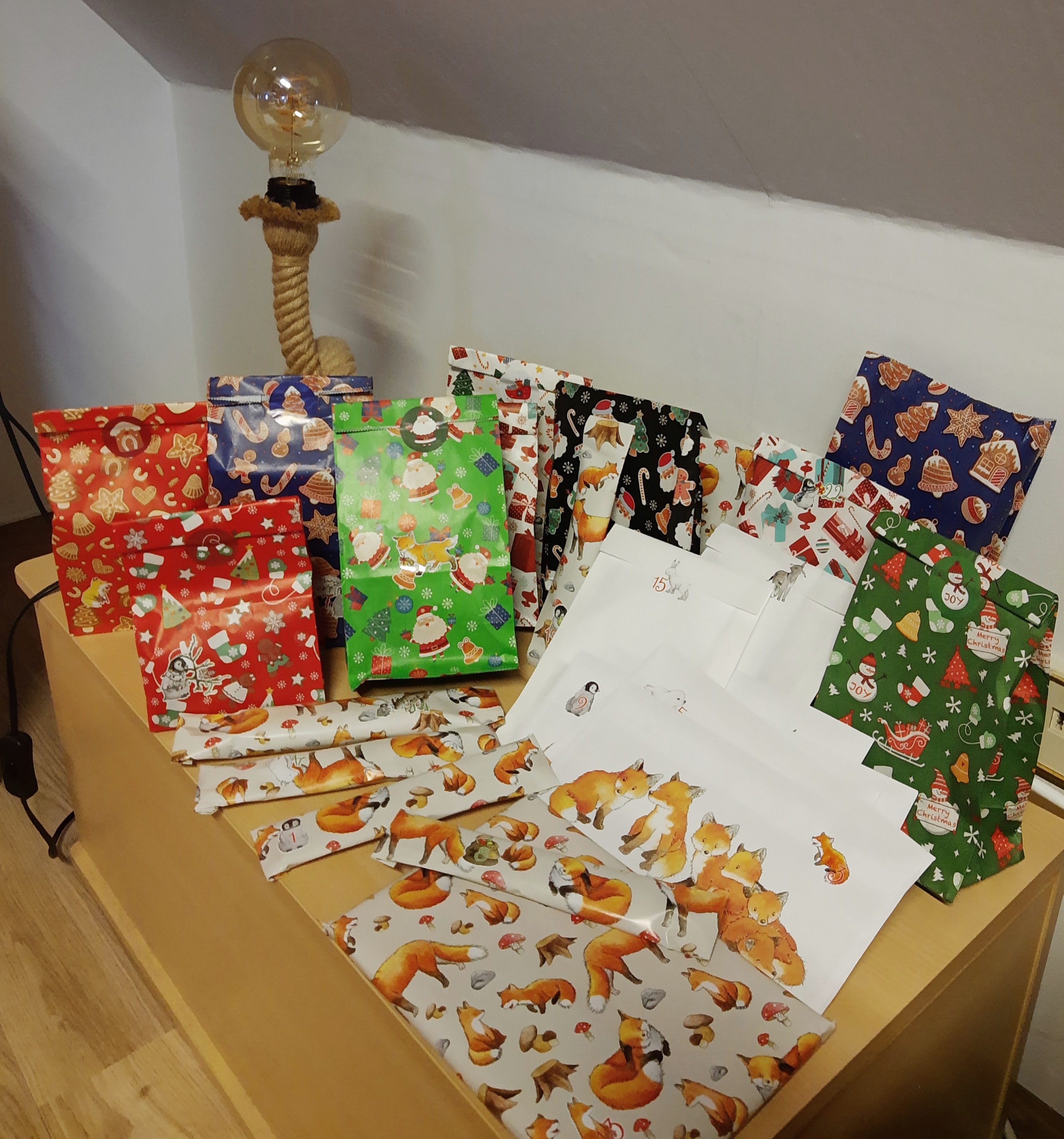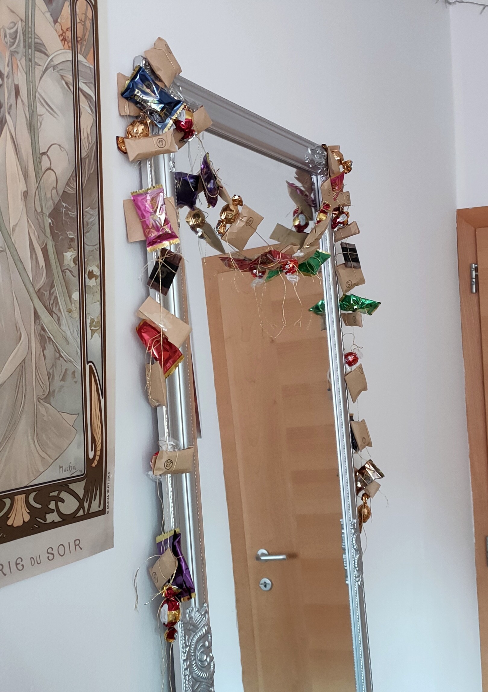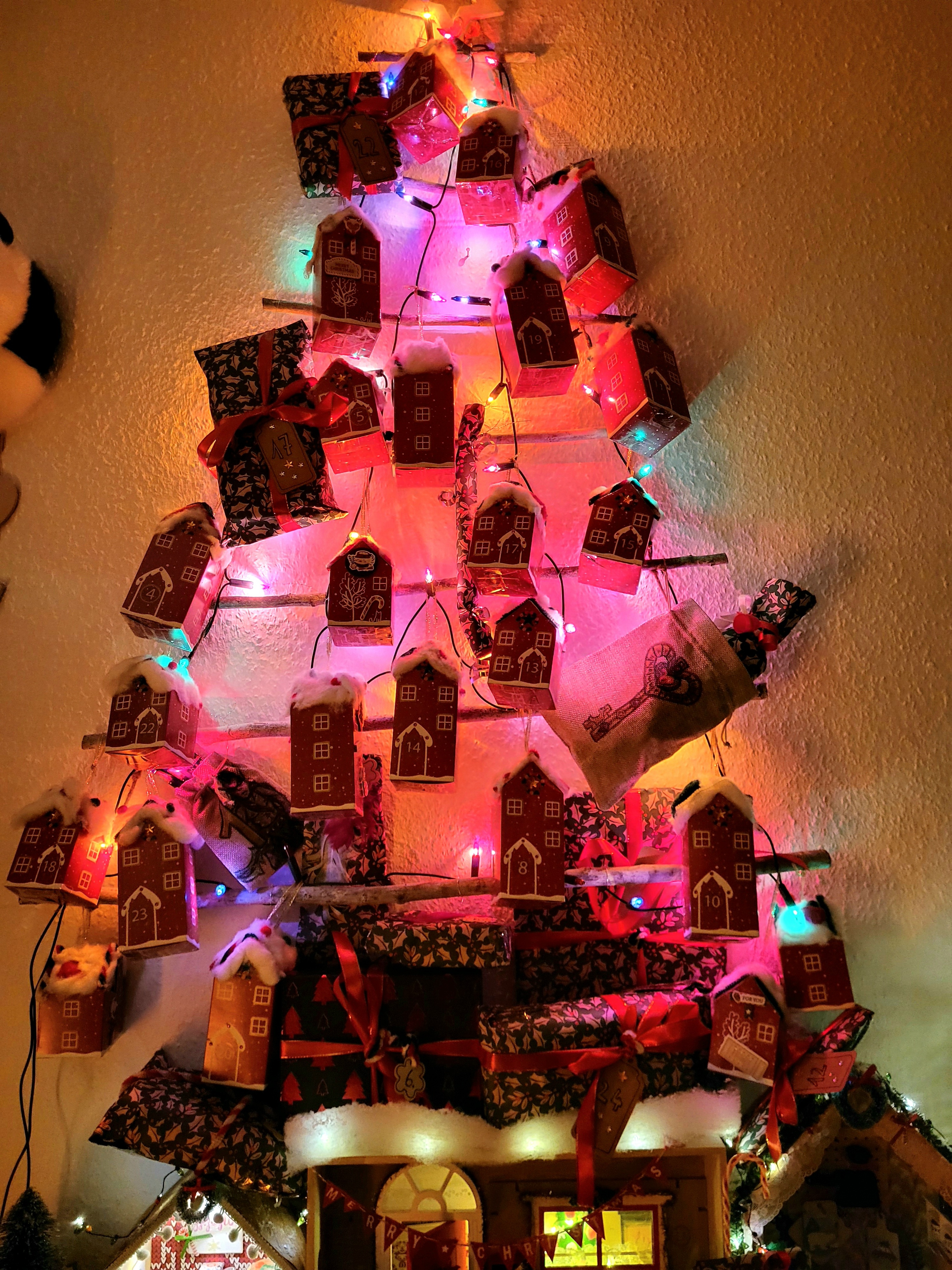 Ich musste erstmal Platz freirĂ€umen, um den Adventskalender ĂŒberhaupt aufstellen zu können, aber nun steht (bzw hĂ€ngt noch zusĂ€tzlich eine Girlande