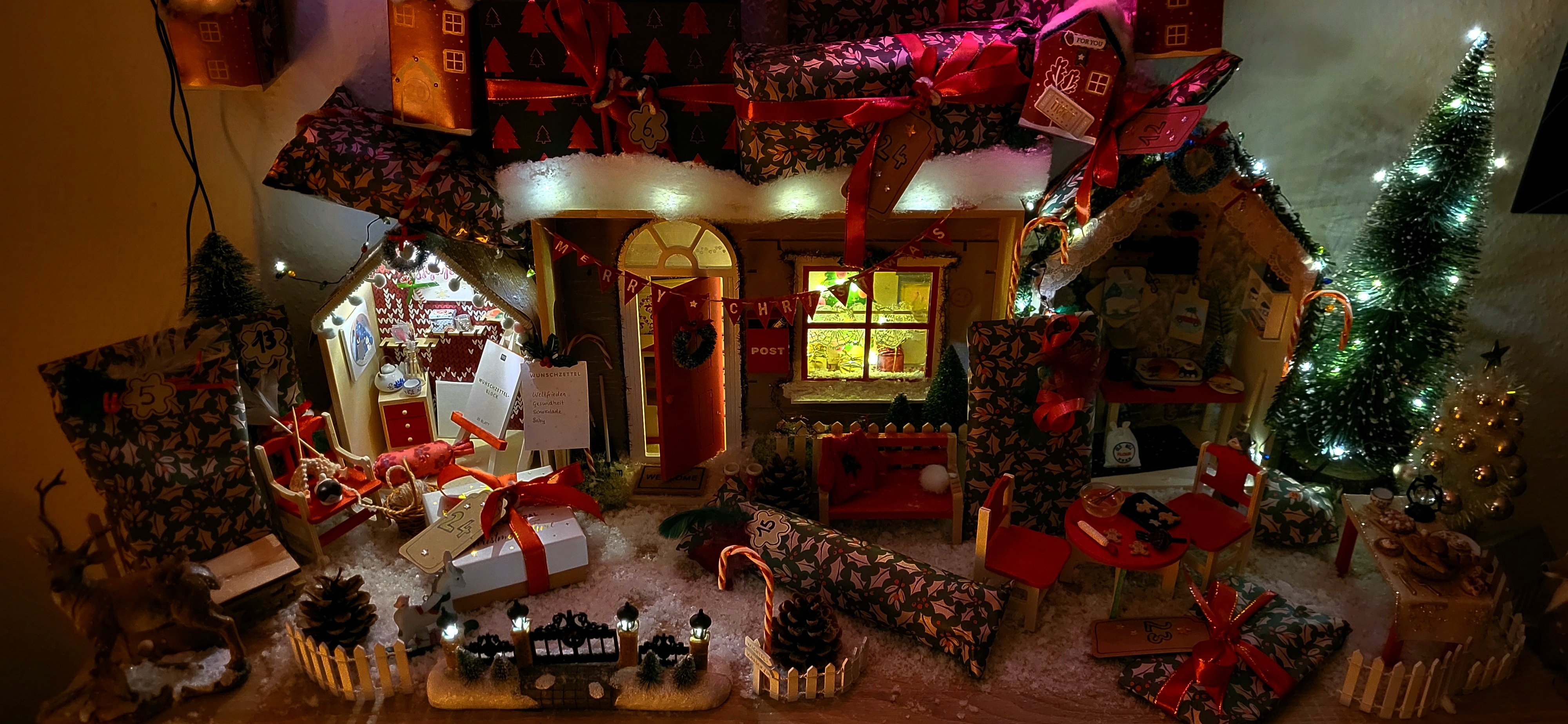 Der Inhalt ist so liebevoll und wunderschön verpackt! Die gebastelten HÀuschen kann man aufhÀngen und so habe ich sie an die Wand gehÀngt. Und die restlichen PÀckchen habe ich zwischen der Wichtelwelt verteilt. Unser Hauswichtel wird gut auf den Kalender aufpassen!