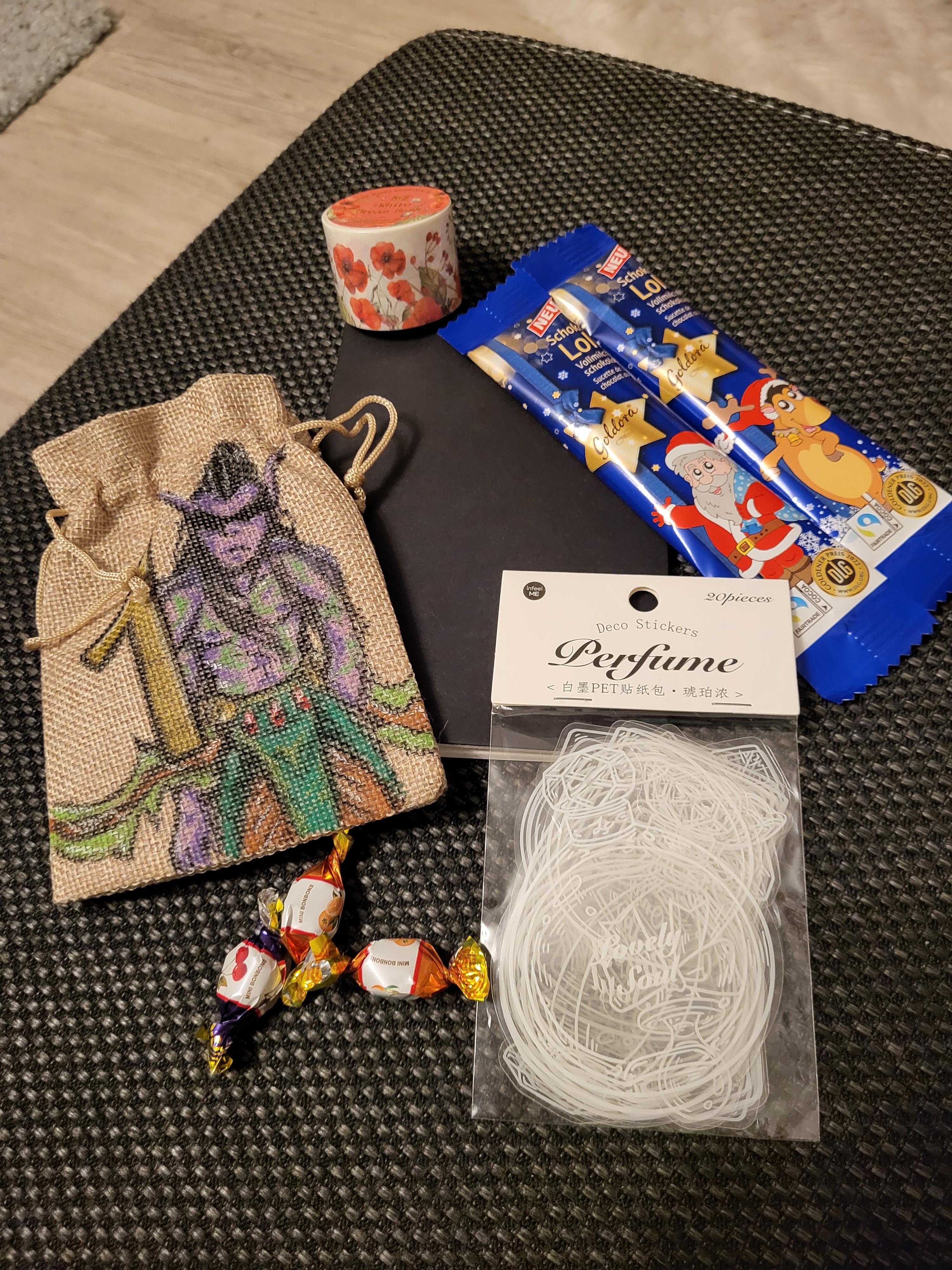 In dem selbst bemalten Säckchen mit einem Illidan drauf fand ich tolle Sticker, Schoki und in einem Häuschen befanden sich washitape