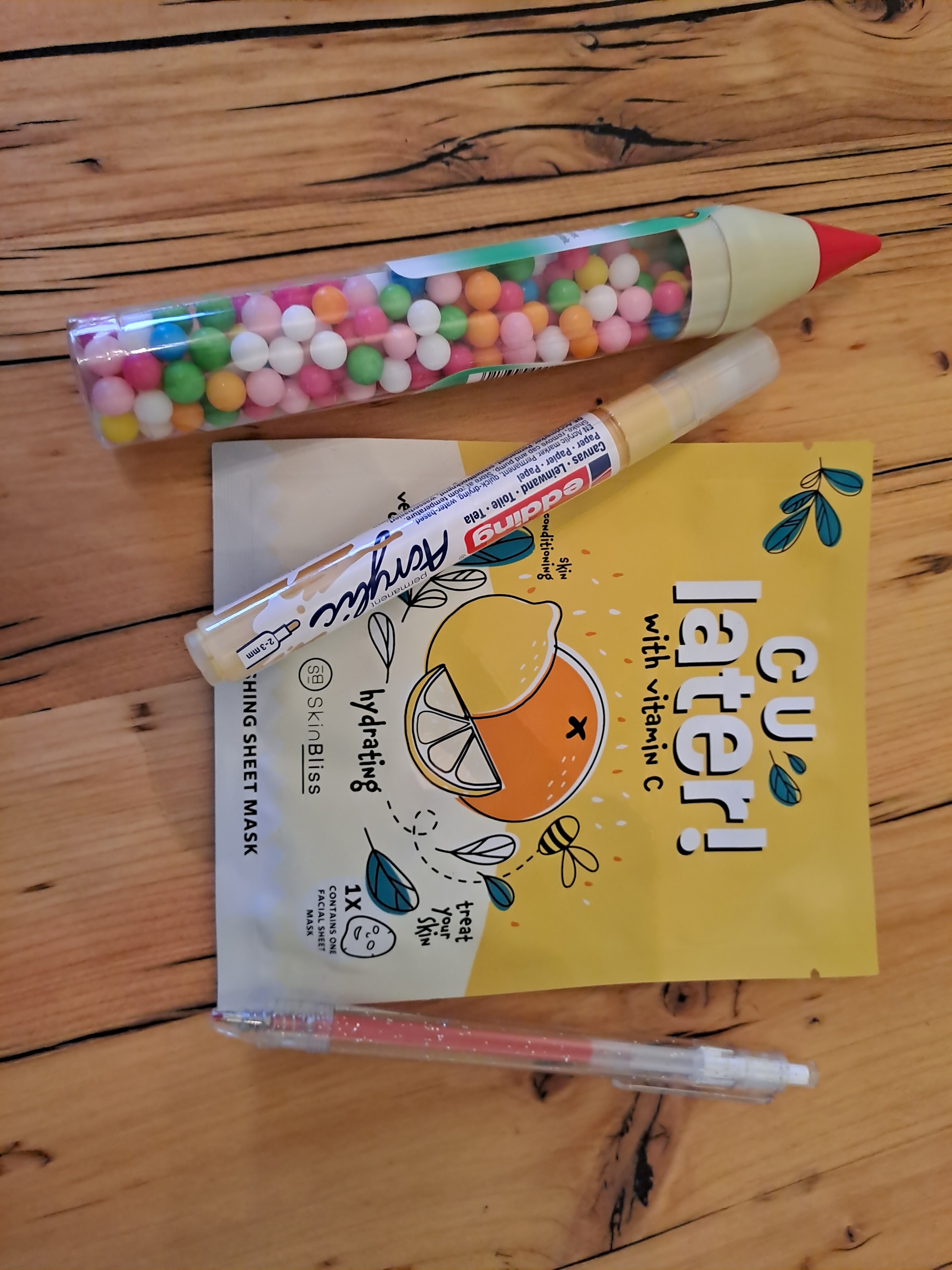 Eine tolle Sheetmaske, die morgen direkt ausprobiert wird, bunte Essperlen, die ich schon seit Jahren nicht mehr gegessen habe, einen weiteren Glitzerstift in Orange und meinen allerersten Acrylic Painter in gelb :D da bin ich auch schon sehr gespannt, wie es sich damit malen lässt, vielen Dank :)