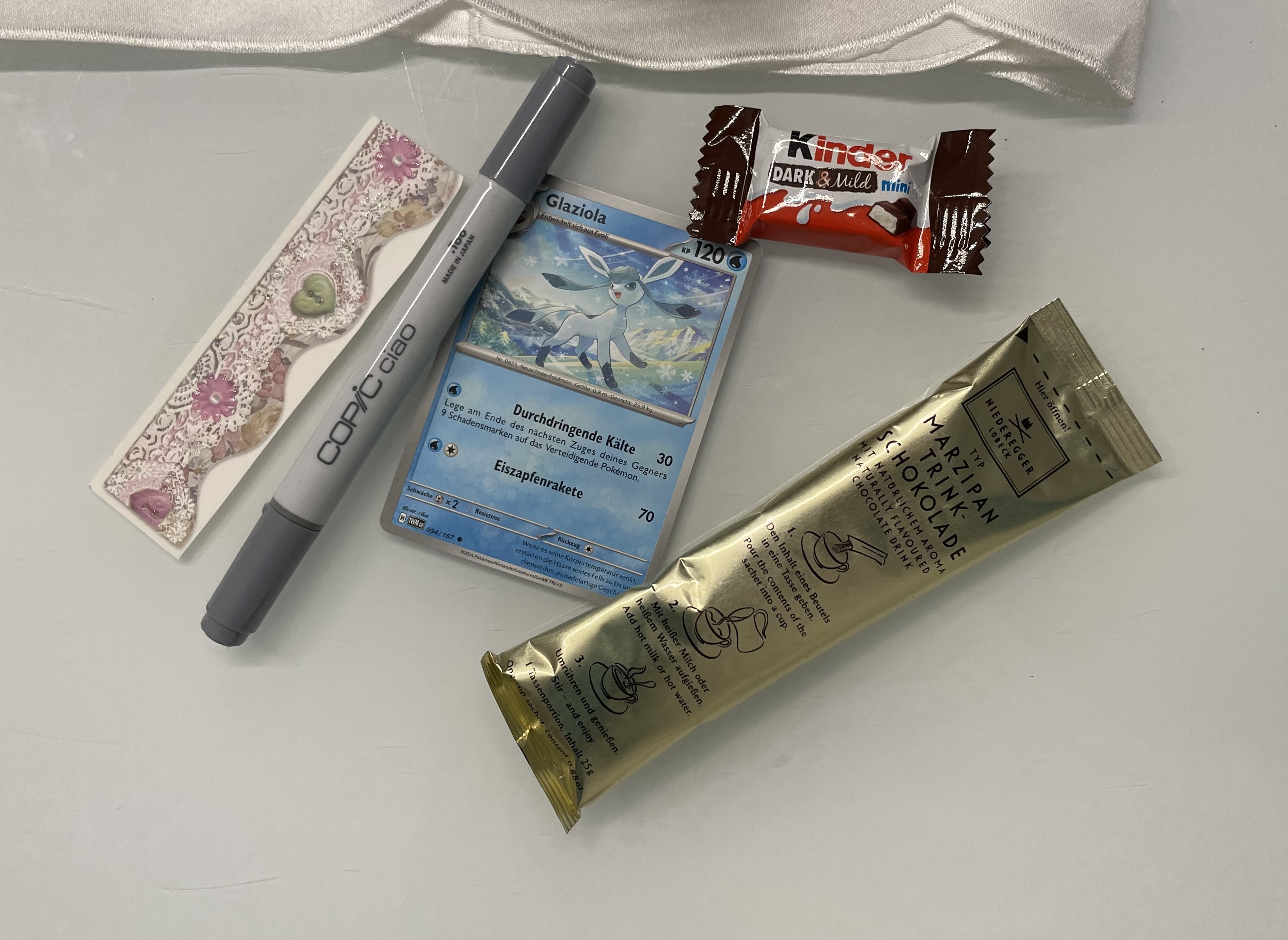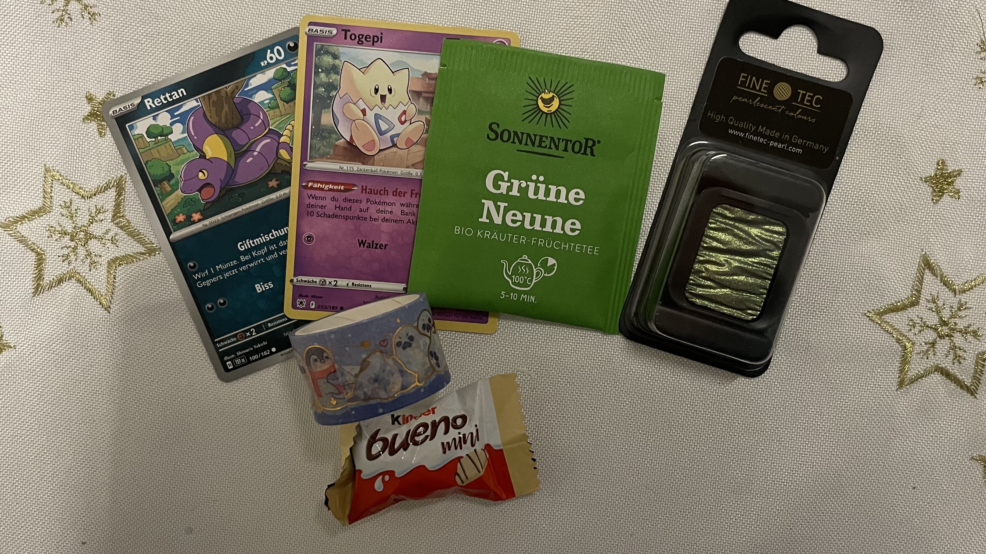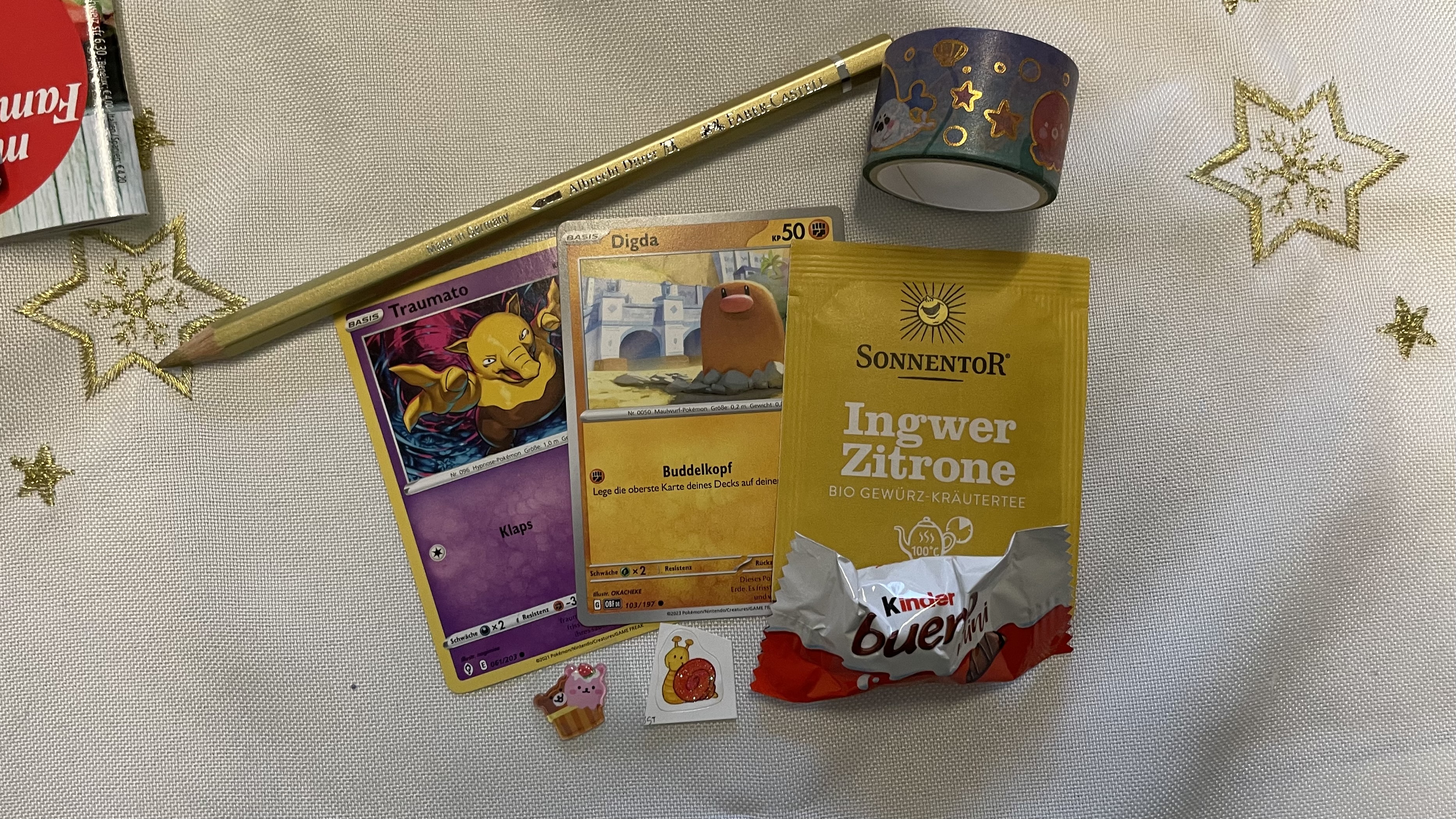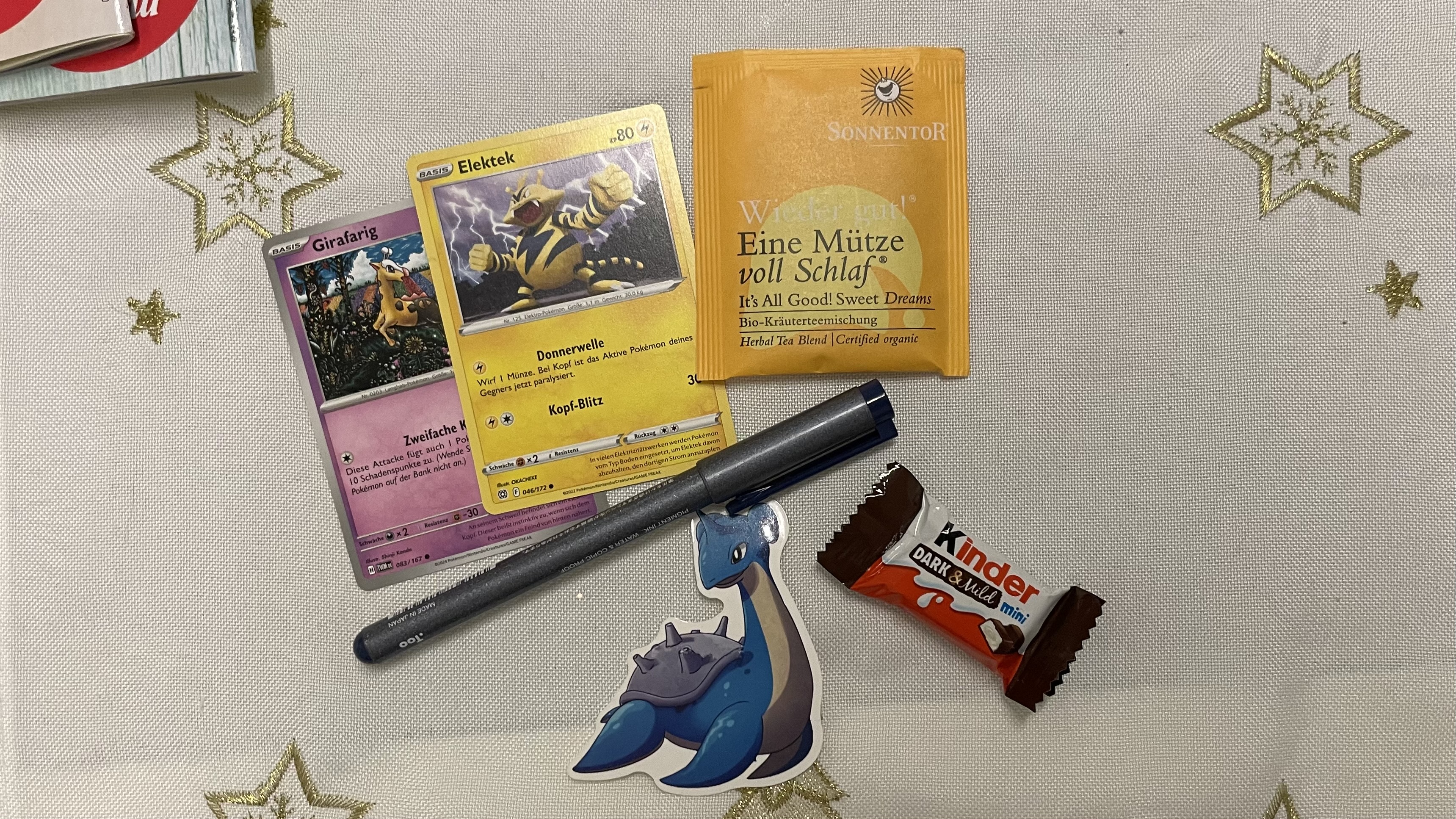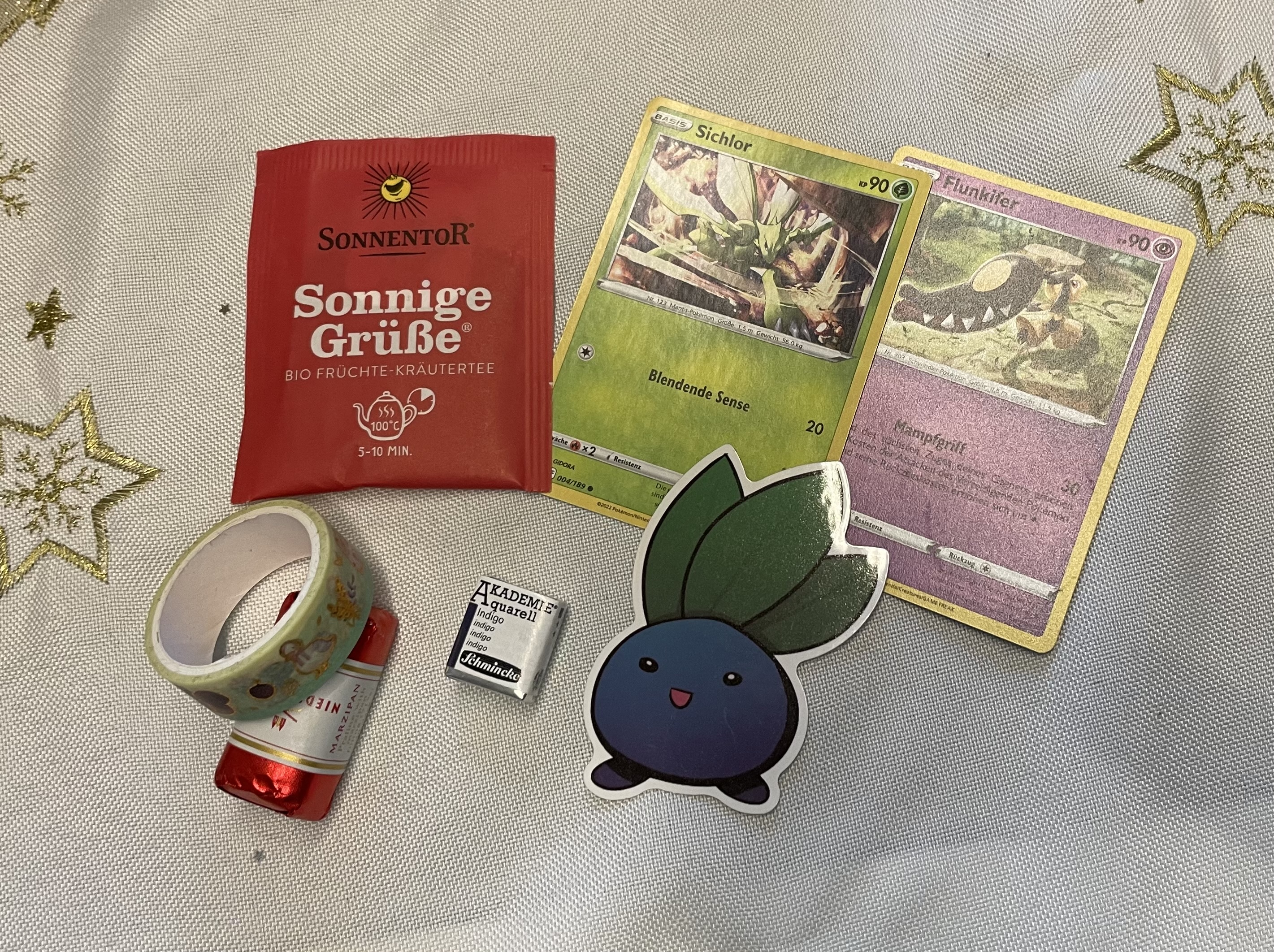 . Dann gabs noch ein Marzipan und Tee, die beide schon in meinen Bauch verschwunden sind XD. Finde bei den Pokémon Karten toll, dass auch viele aus der ersten Generation dabei sind <3 entsprechend super ist auch der Myrapla Sticker XD