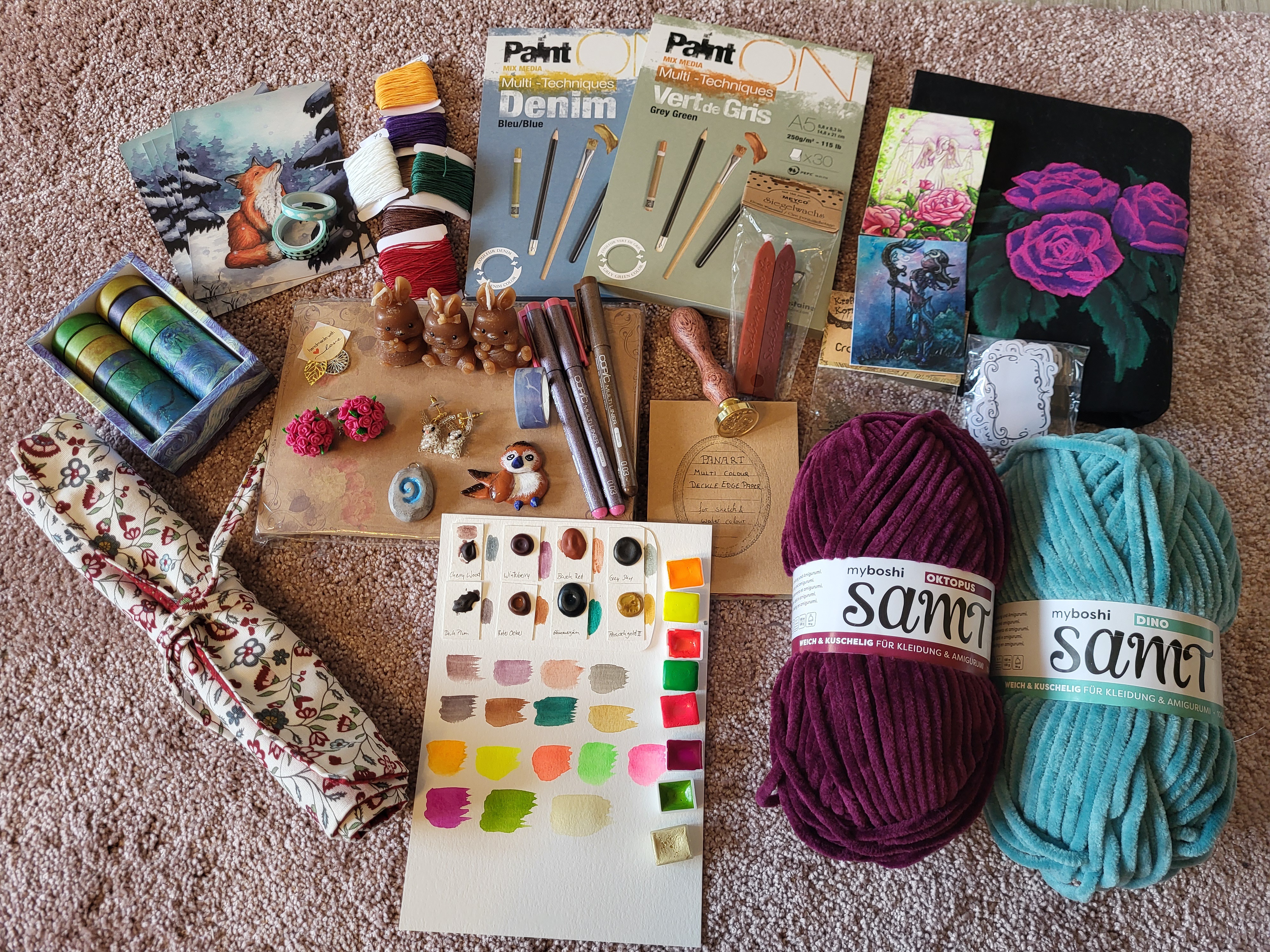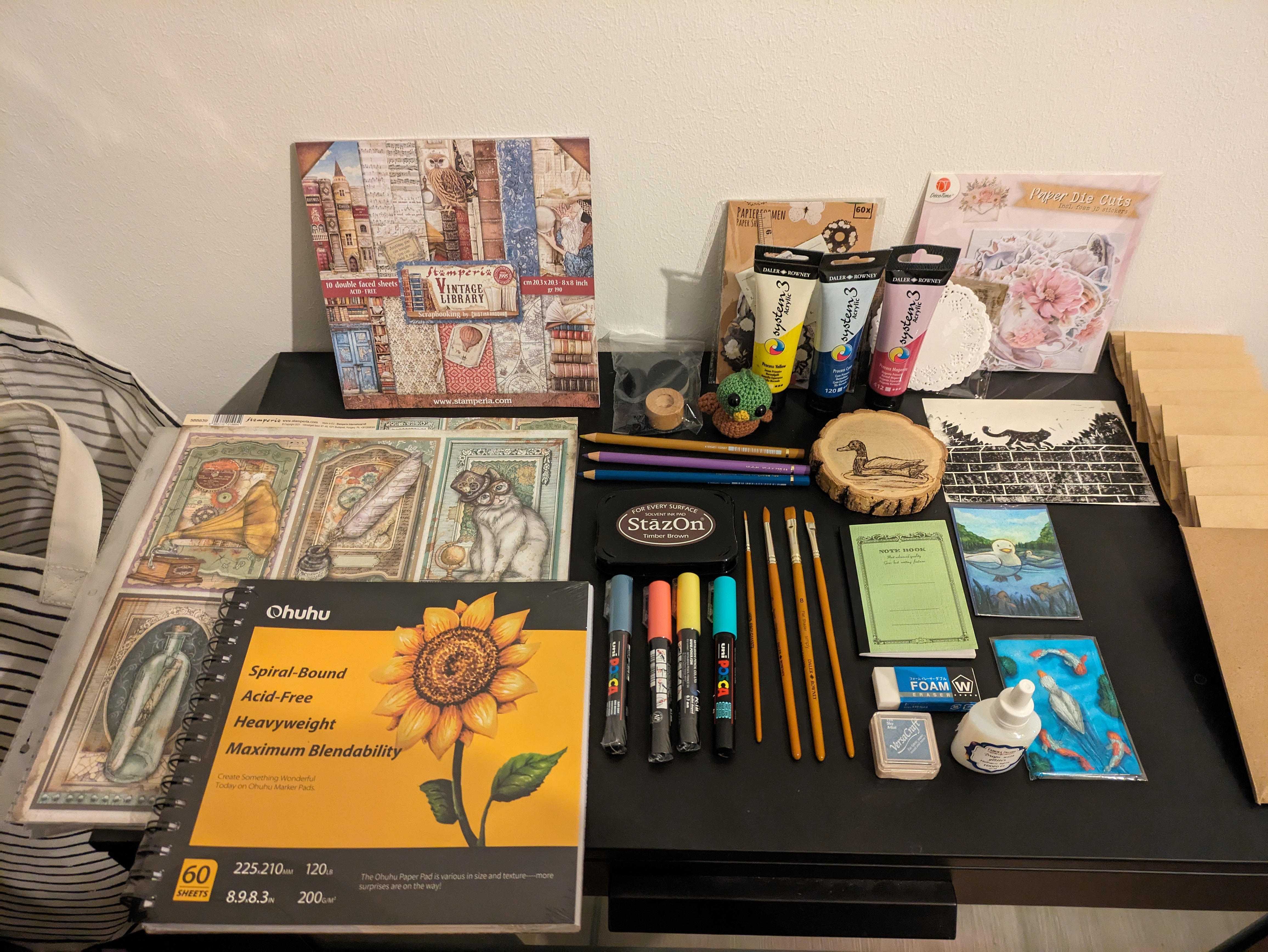 Weiter ging es am nächsten Tag dann nämlich mit einer sehr niedlichen Kakao-Karte und einem kleinen Notizbuch. Danach habe ich etwas den Überblick über die Reihenfolge verloren, deswegen auf dem Bild eine Gesamtübersicht der im Kalender enthaltenen Materialien. Ich hab mich sehr gefreut, dass gleich 4 Poscas bei mir gelandet sind, Grundfarben sind sowieso praktisch, aber auch das Türkis gefällt mir sehr gut! Dann 3 Polychromos, die in meine Sammlung wandern, mal sehen, ob wie viele nur insgesamt überhaupt noch fehlen. Dann gab es einen sehr gut wirkenden Radiergummi, danke, da probiere ich gerne mal einen neuen, meistens benutze ich da nämlich irgendwelche Noname Produkte. Dann hat sich ein großes Stempelkissen zu dem kleinen gesellt und mein Wichtel hat Recht, die Farbe ist wirklich praktisch! Außerdem gab es Hüllen fürs Scrapbooking, sehr cool, das sind die allerersten die ich nun besitze. Und zusätzlich einen Bogen mit Motivpapier, von dem ich weiß, dass es vermutlich sehr teuer war o.o es gab auch noch einen Block, der mir sehr gut gefällt, Mal sehen, ob ich mich traue, den zu benutzen. Highlight war natürlich noch das gehäkelte Entchen, das ist sehr süß