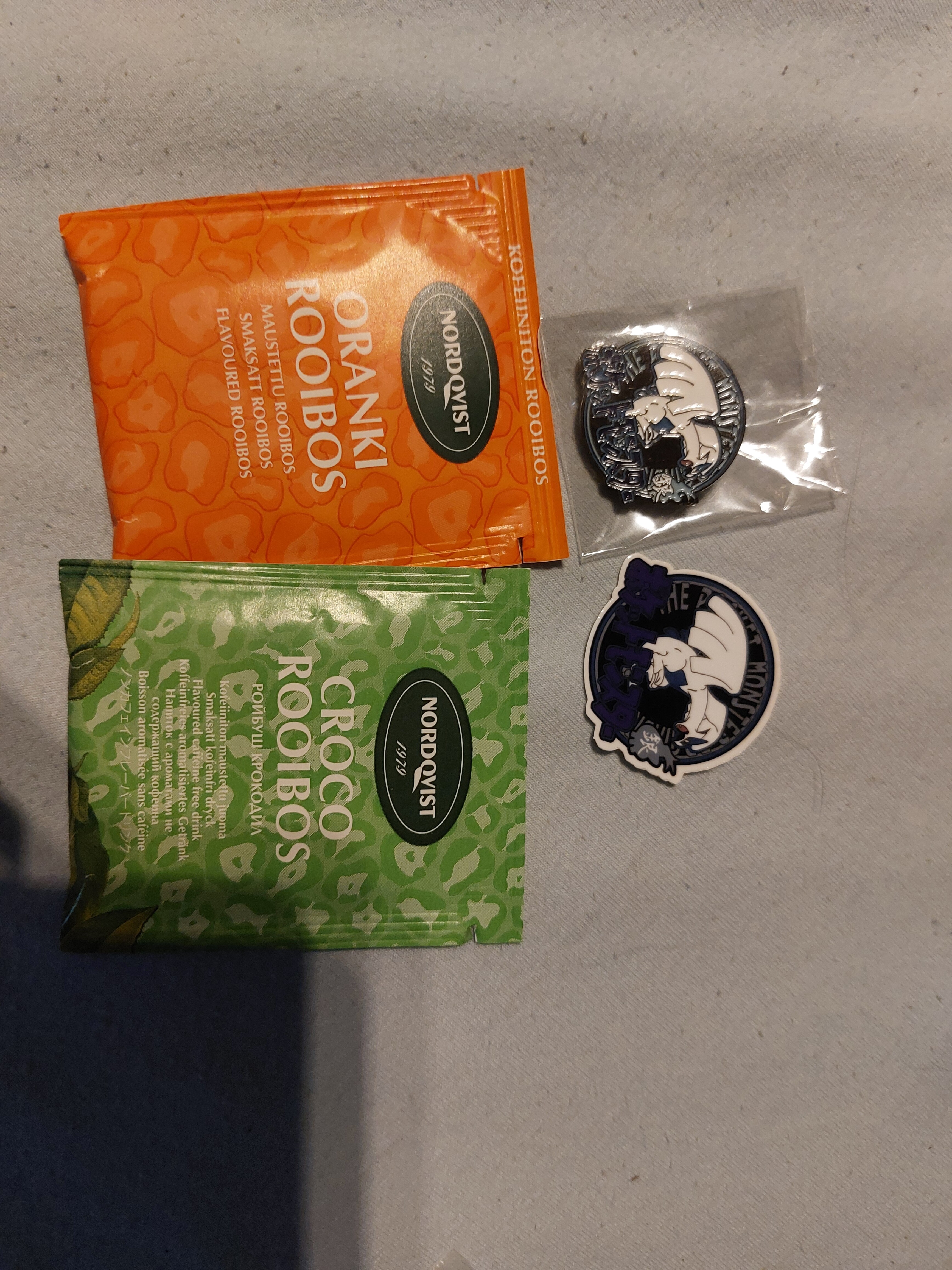 Einen Lugia Pin der an meine Tasche wandern wird. Sehr interessant klingende Kekse und viel leckeren Tee und 2 tolle Schimmer Aquarellfarben.