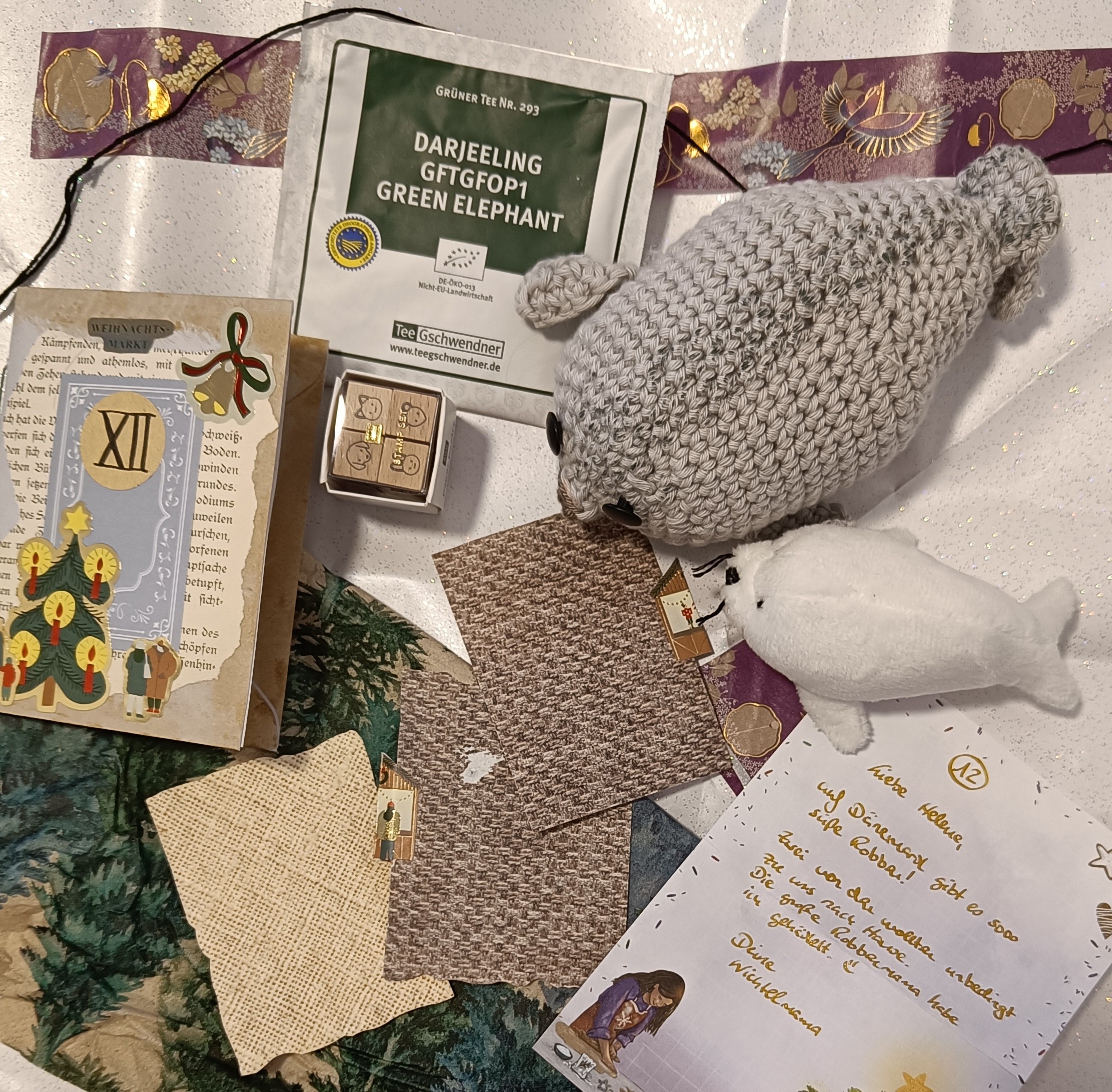 Gestern gab es für mich total niedliche kleine Stempel x3, schönes Papier, einen Darjeeling Grüntee, ich wusste garnicht das es Darjeeling auch als Grüntee gibt, der war wirklich lecker ^^! Und eine selbsgehäkelte Robbe mit Robbenbaby, awww die ist soo niedlich und squishy T^T die bekommt auf jeden Fall einen Ehrenplatz >w<!