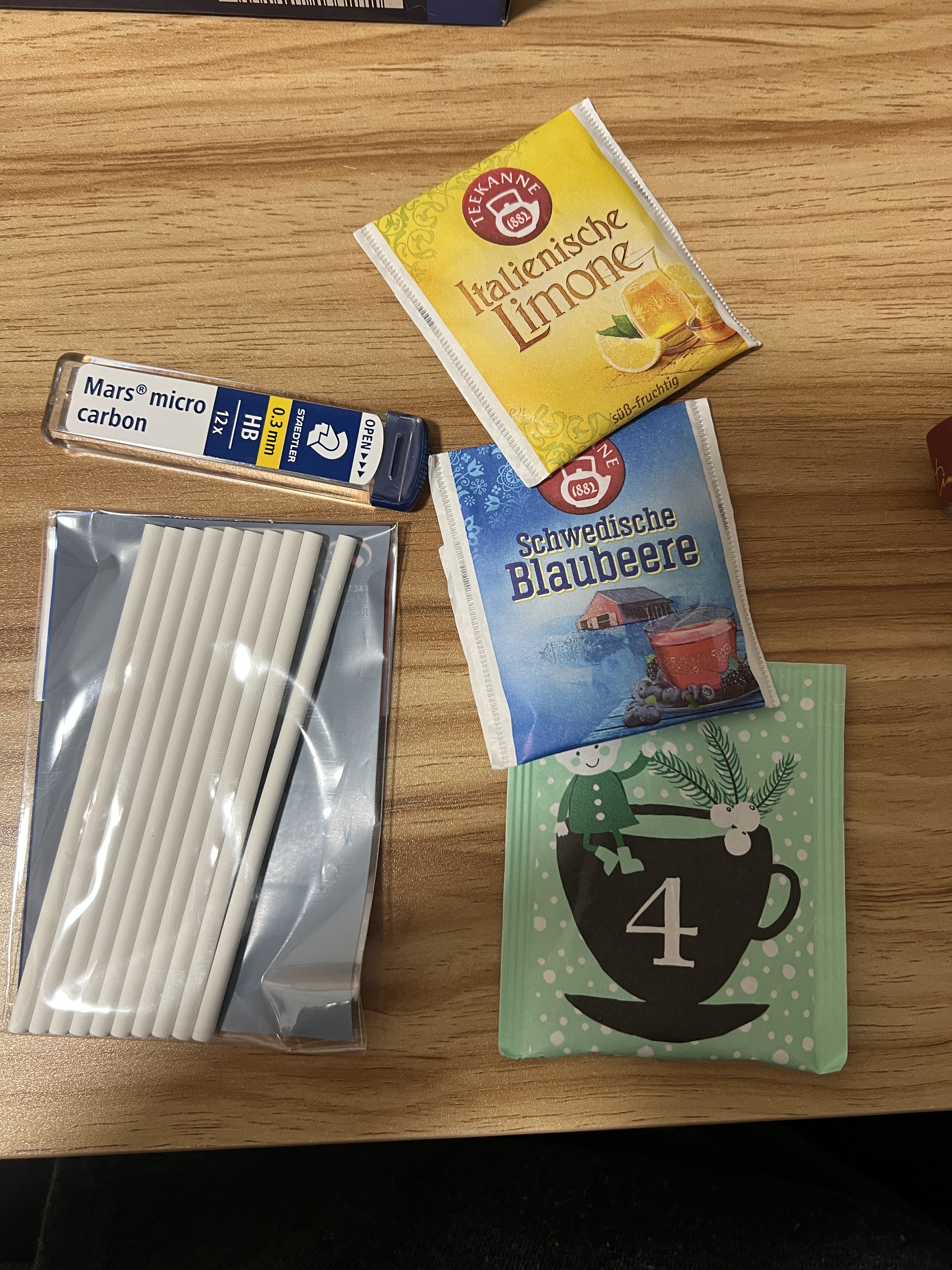 Am 4. Dezember gab es erst einmal ein paar Nachfüller für meinen Radiergummistift und meinen neuen Druckbleistift :) Und einiges an leckerem Tee!