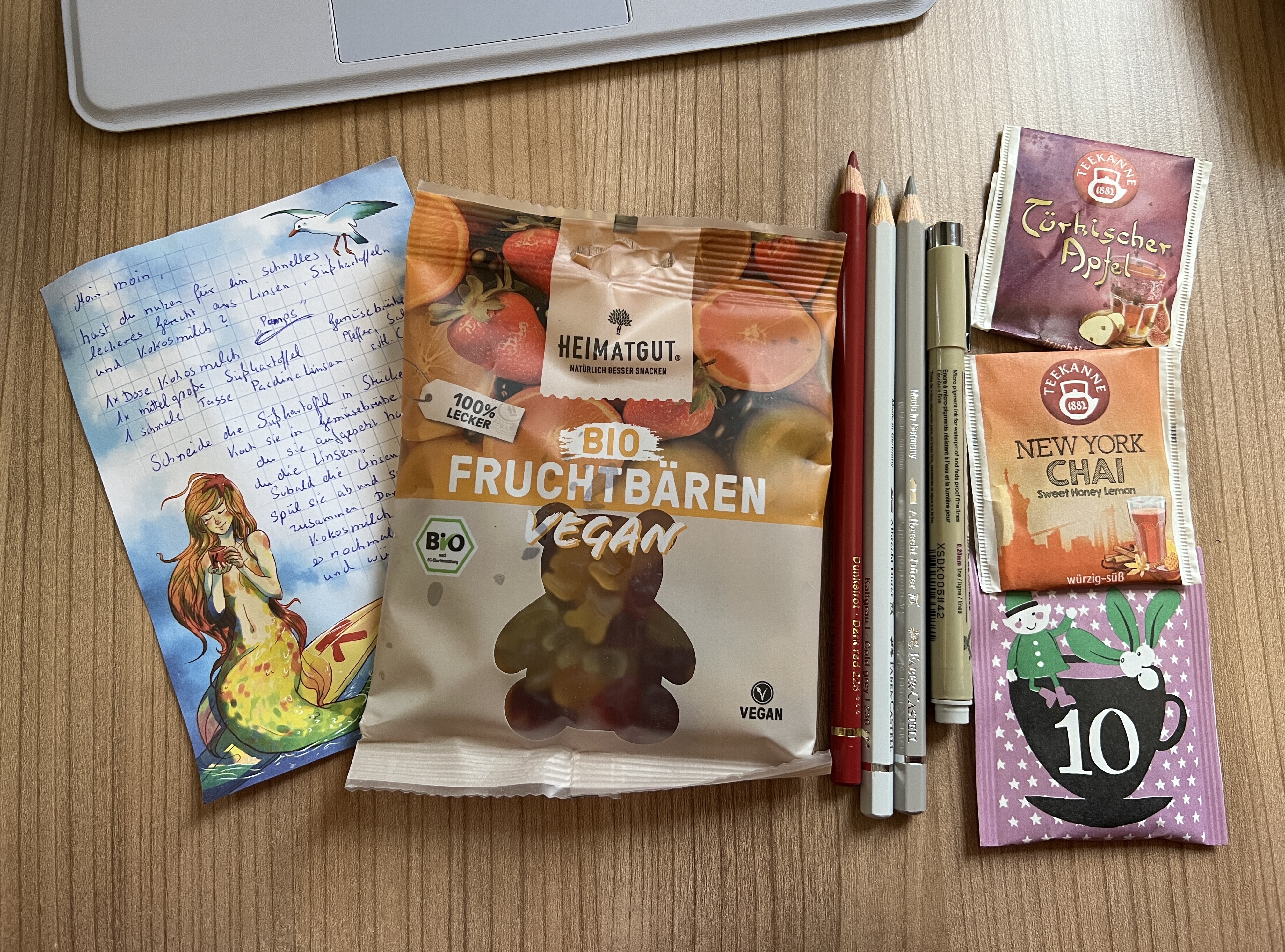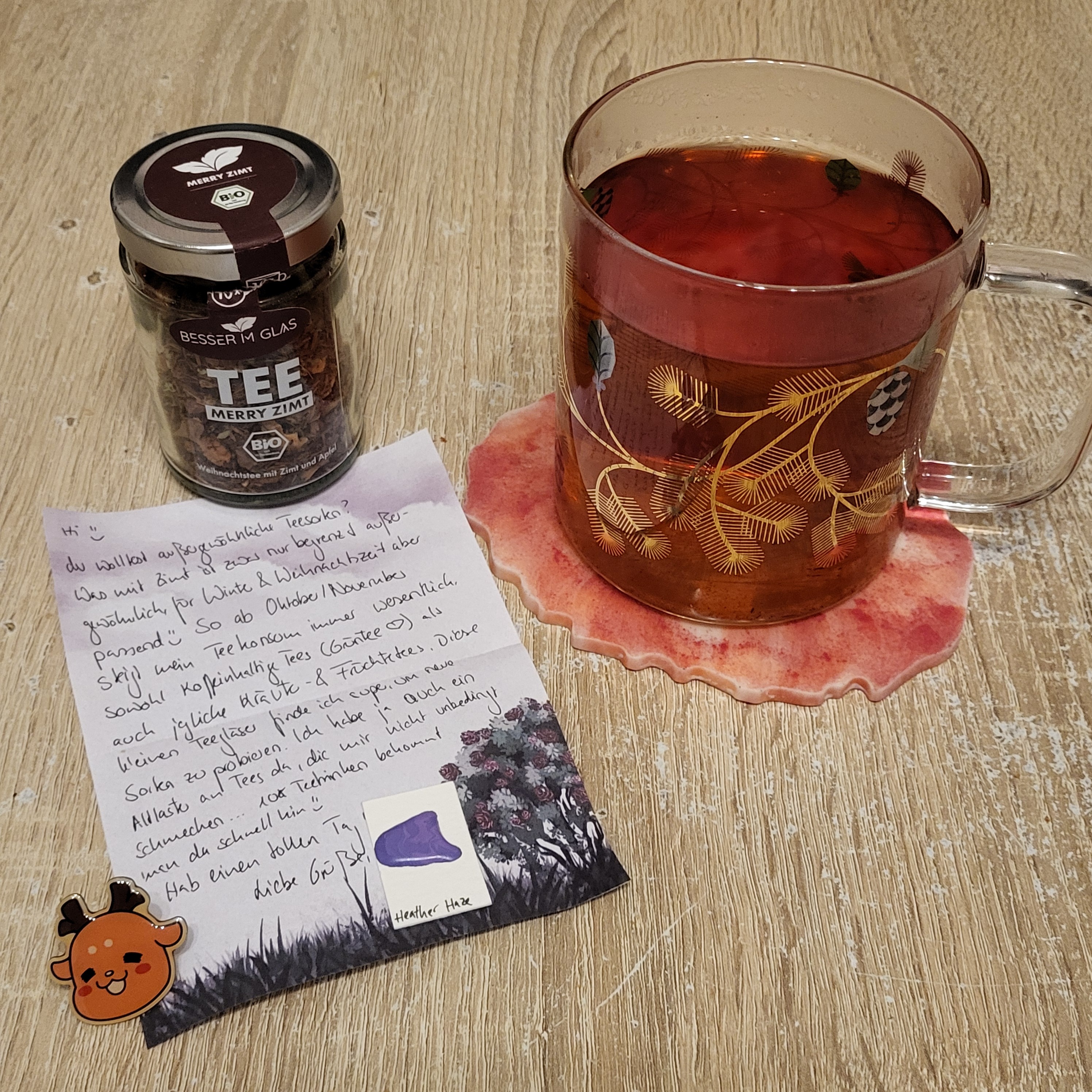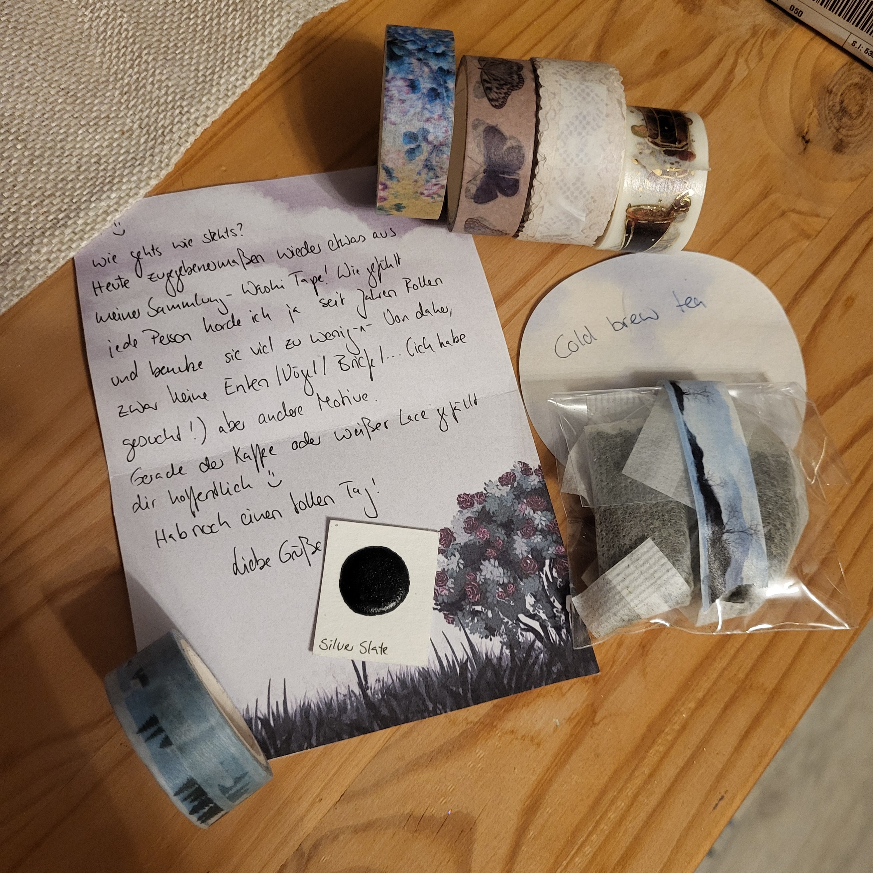 Also… das ist jetzt echt ein witziger Zufall - ich fand heute einen seeeehr gut riechenden grünen Darjeeling in meinem Türchen. Ich mag die Sorte auch, aber es kann durchaus sein, dass meine Mutter den austrinkt, weil sie die Sorte liebt. - Eine weitere Aquarellfarbe von @Tarabel, diesmal in der Farbe “Slime”. Die Farbe ist aber gar nicht schleimig! XD Ich freue mich sehr, danke! (Ich glaube, ich muss die Farben von Tarabel echt mal alle zusammen in einen Extrakasten packen - das lohnt sich schon.)